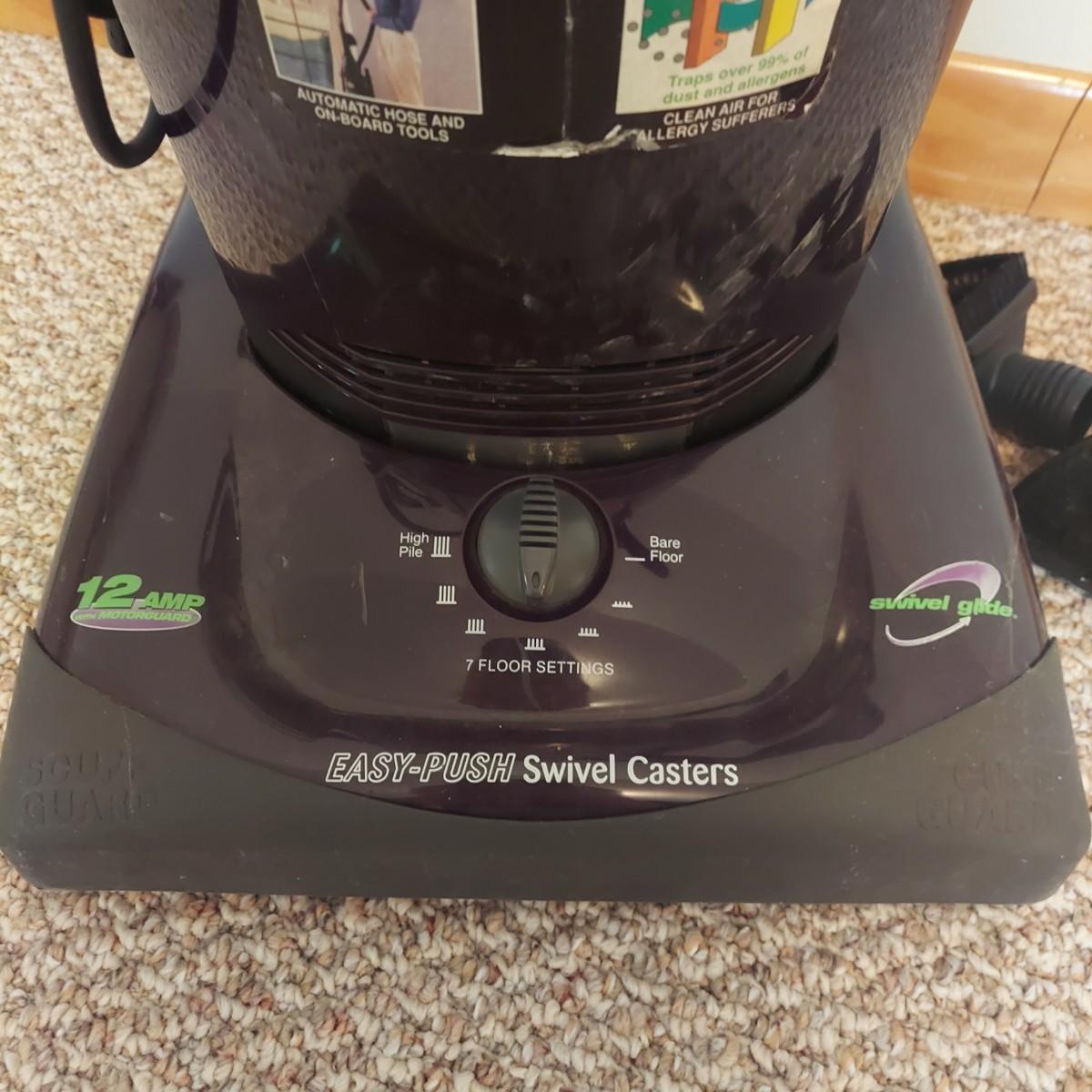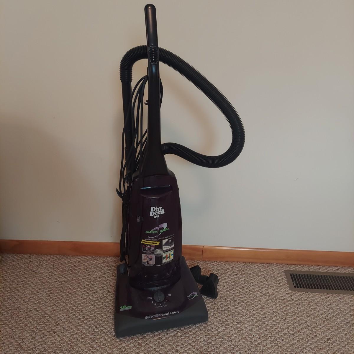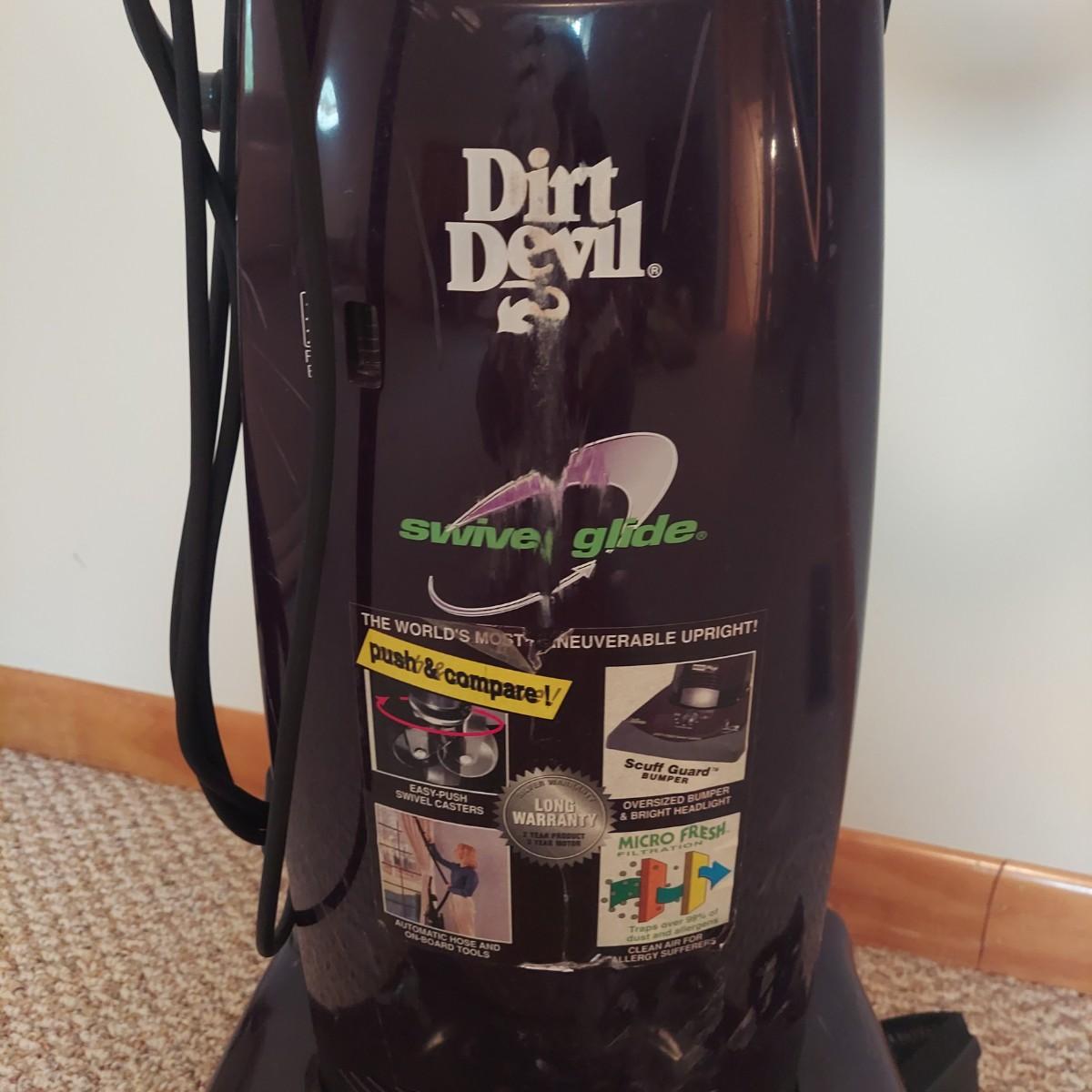 Dirt Devil Swivel Glide upright vacuum. Comes with many attachments. Item plugged in and powered on. Black & Decker dust buster hand held vacuum with attached brush. Item plugged in and powered on. Local Pickup Only.