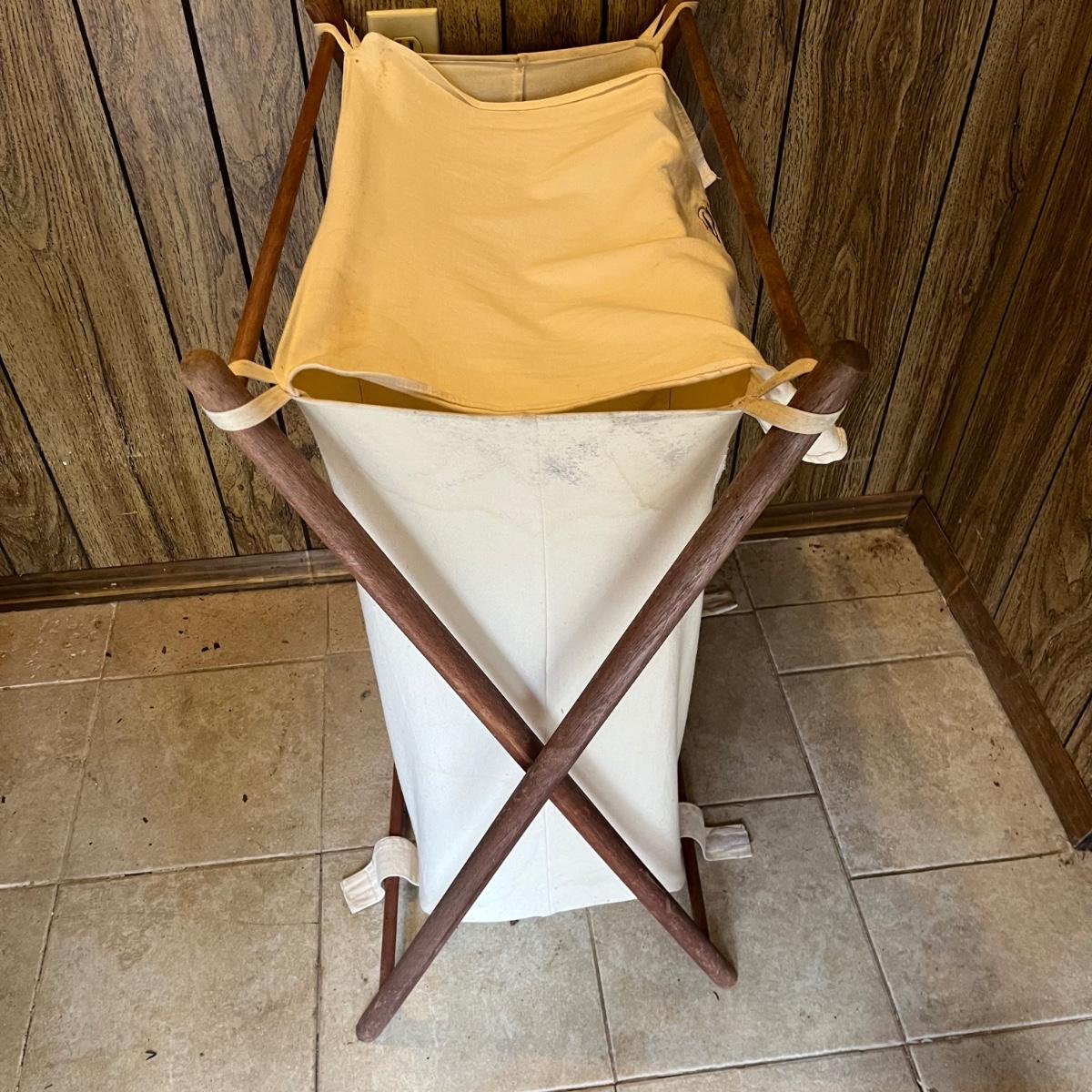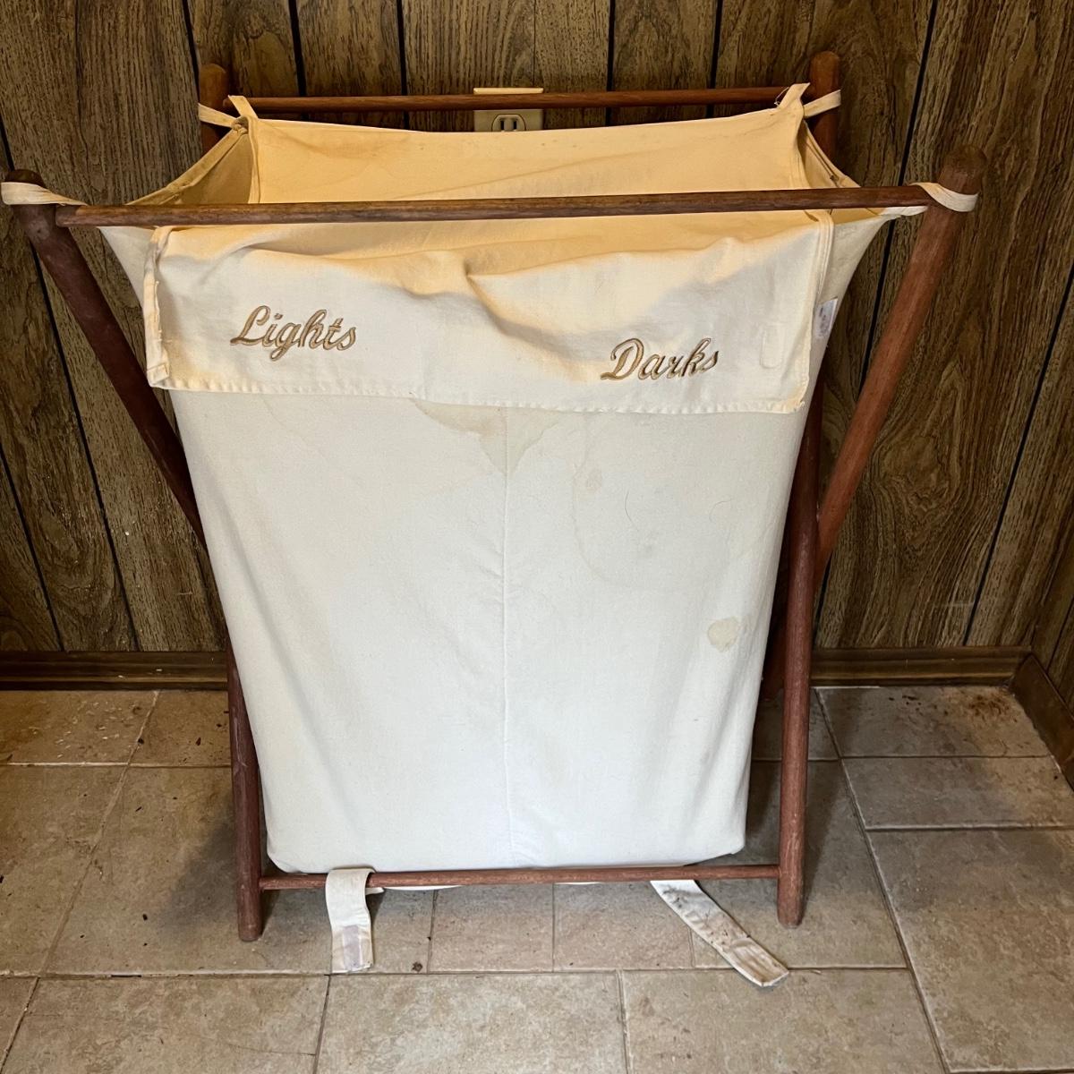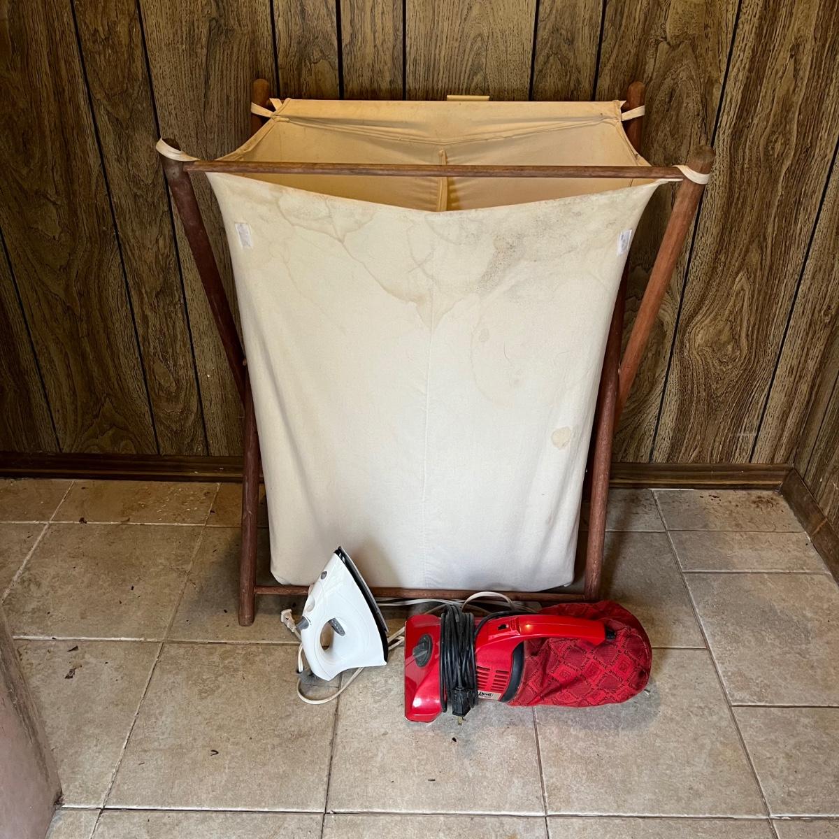 This Dirt Devil vacuum worked when tested and the Proctor Silex iron powered on when tested. Lot also comes with a wooden framed hamper with cloth liner that could use a use. Hamper measures 15” x 26” x 32”.