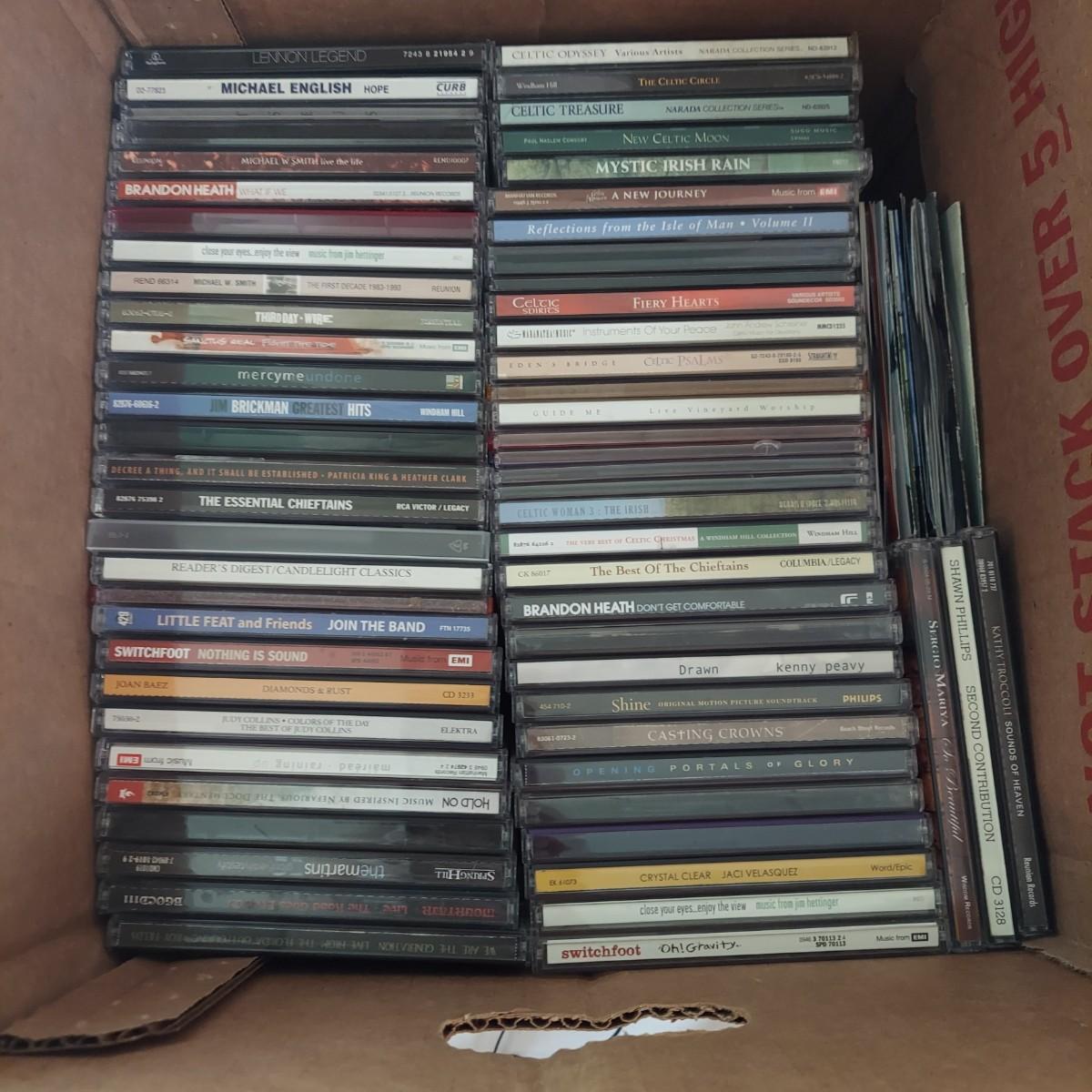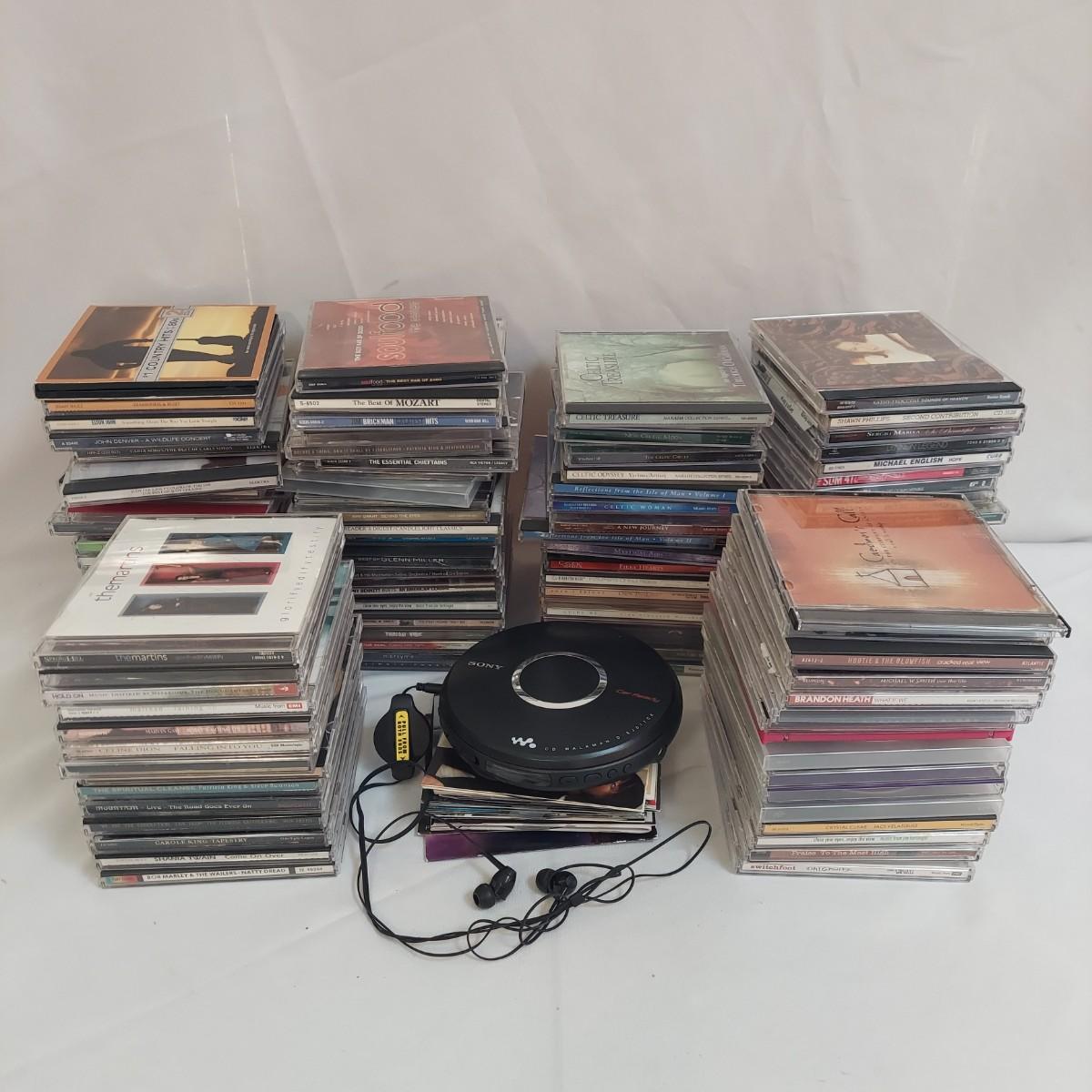 Lot includes over 100 CDs from several genres including country music, classic rock, Celtic and Christian music. Plus a discman with headphones. The power cord is missing and there are no batteries so this was not tested. Please see photos for details. Shipping available