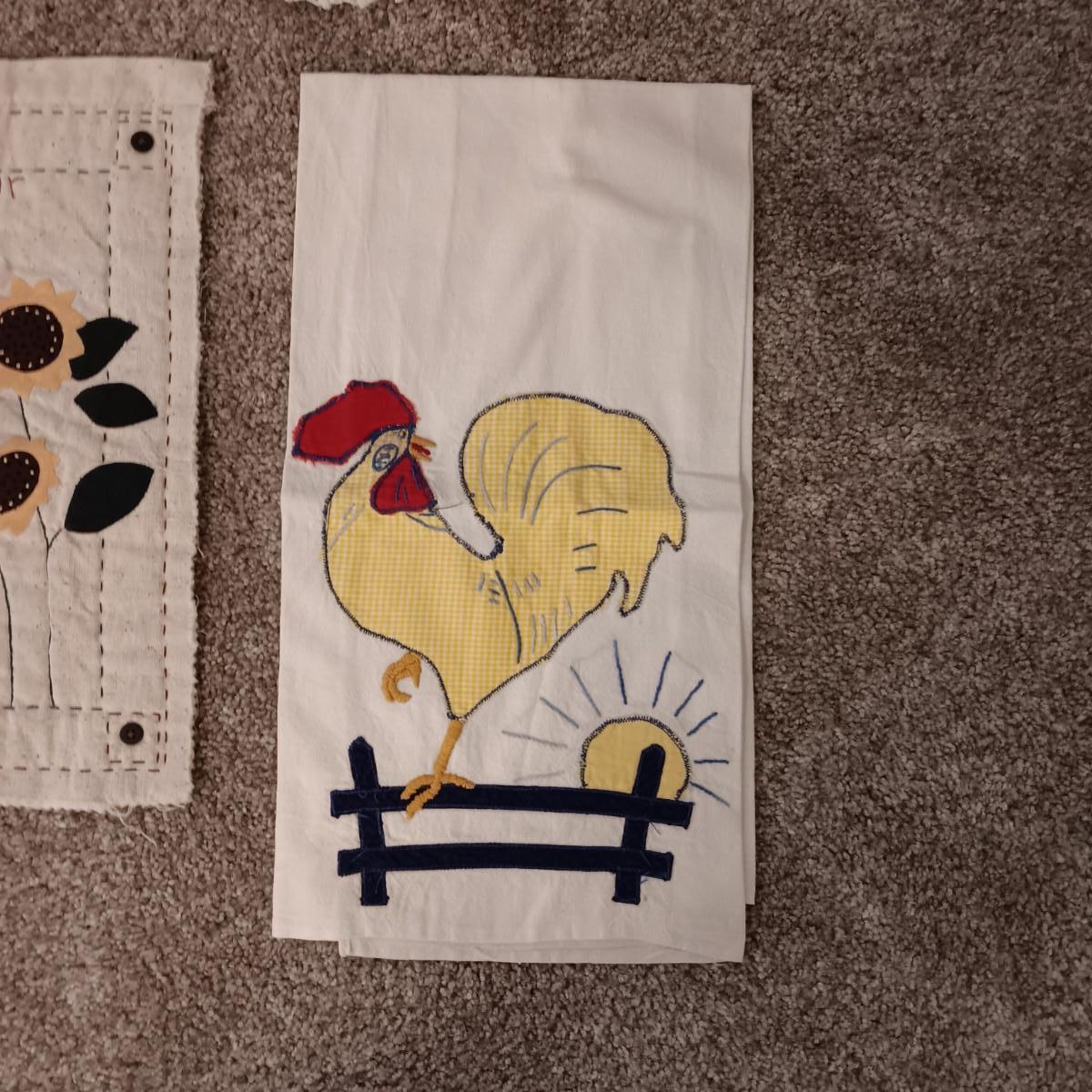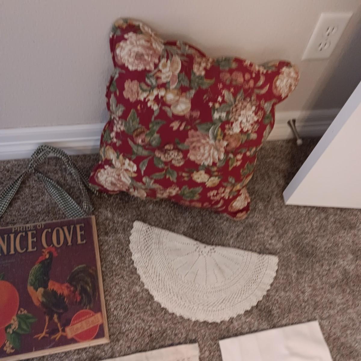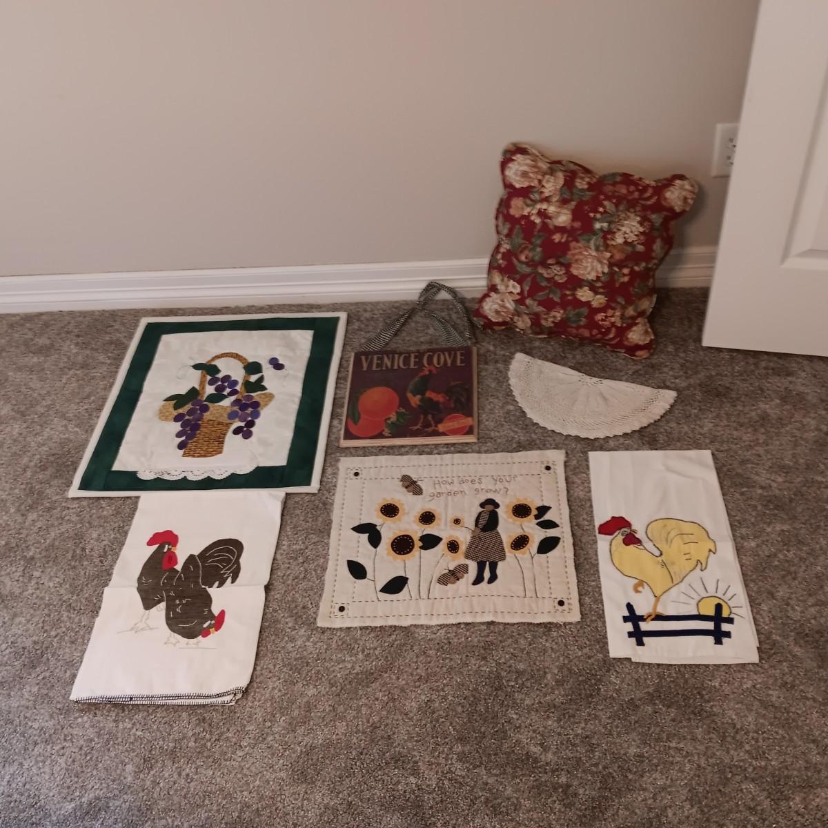 DISH TOWELS, THROW PILLOW, WALL HANGINGS AND A DOILY
