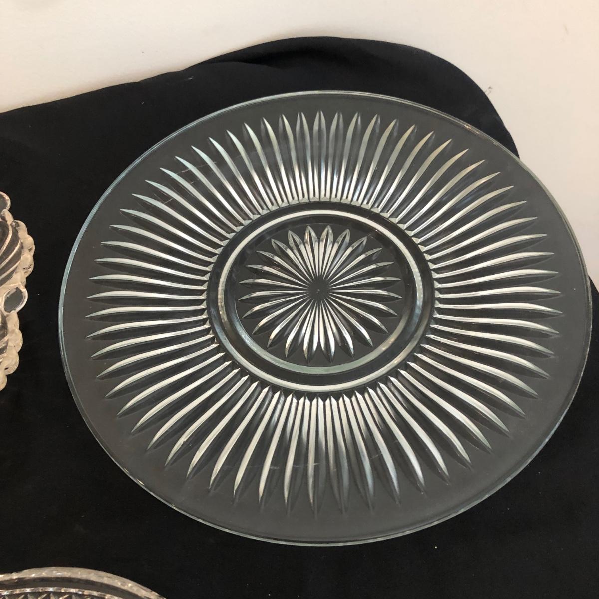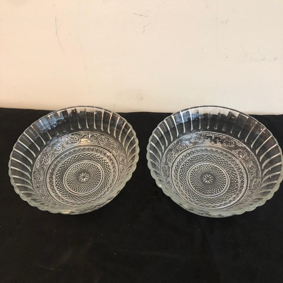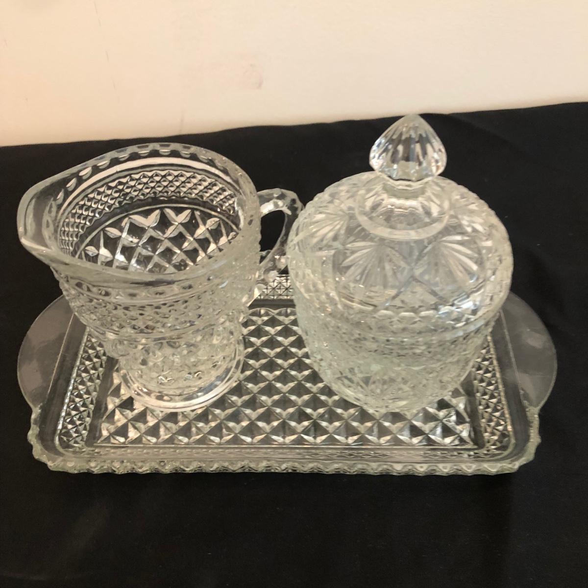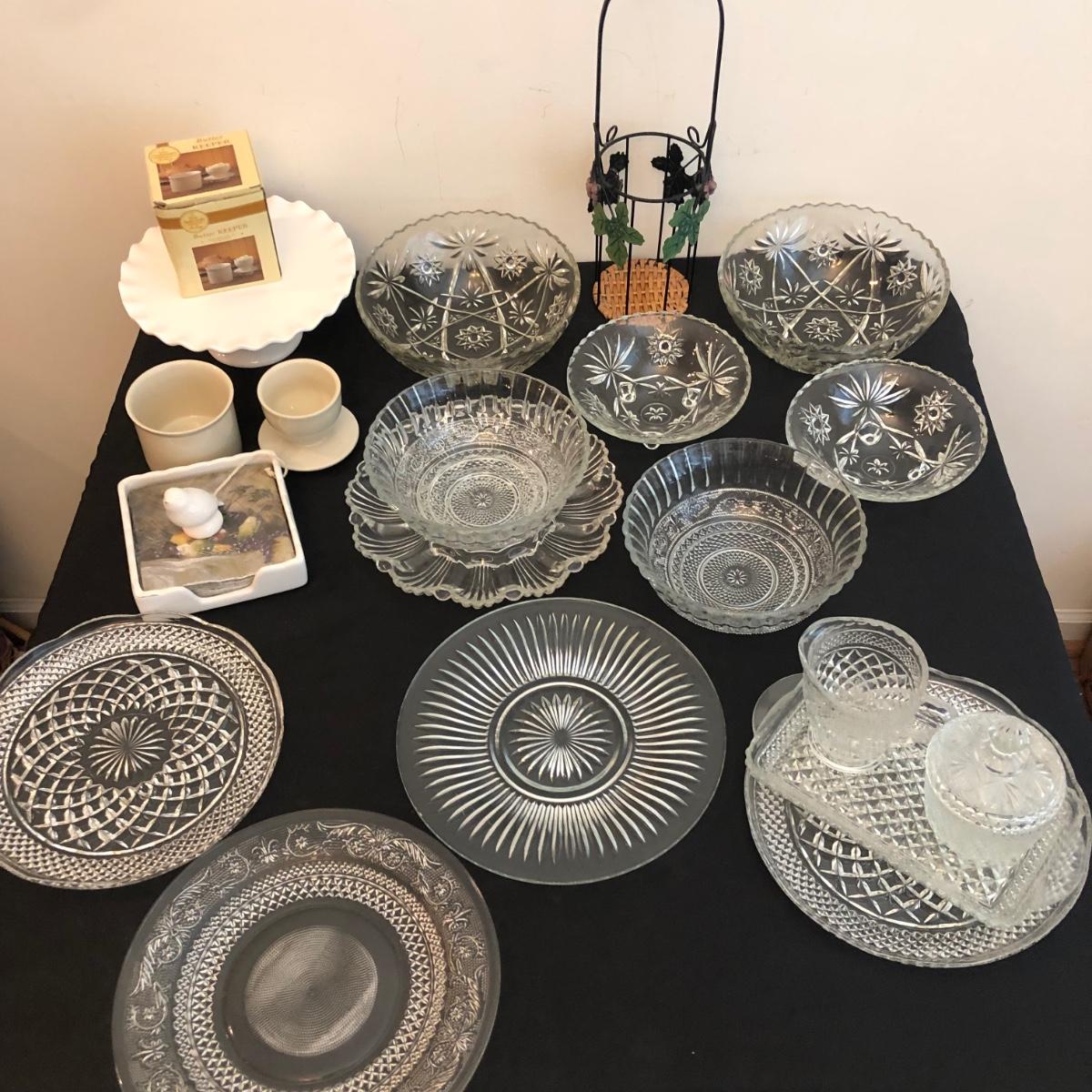 This lot has six glass bowls, five glass plates, a sugar and creamer set, a white pedestal cake plate, a butter keeper, napkin holder and wine bottle holder. The two biggest glass bowls measure 8.5” in diameter and stand over 3” tall. Shipping Available.