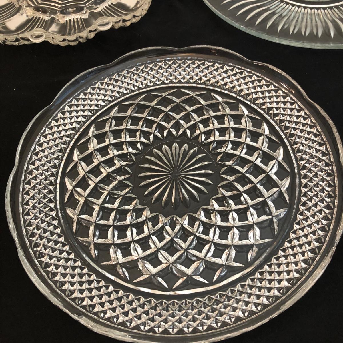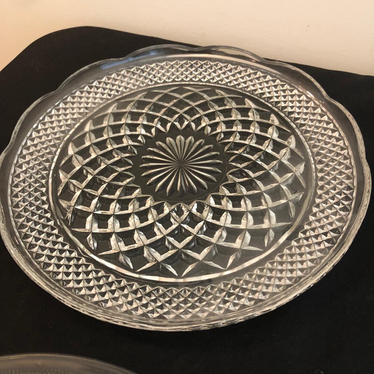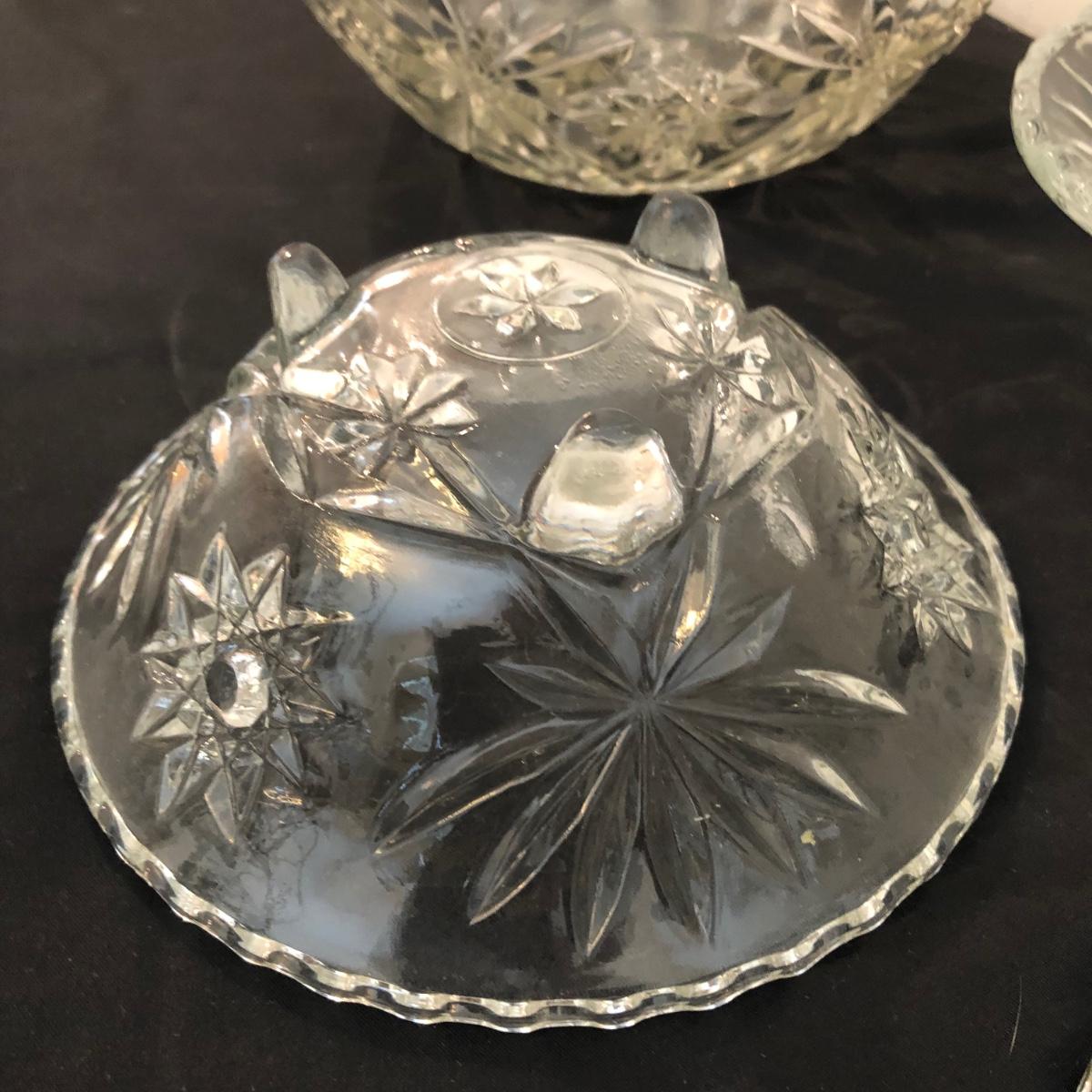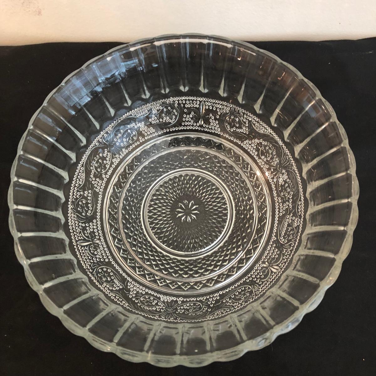 This lot has six glass bowls, five glass plates, a sugar and creamer set, a white pedestal cake plate, a butter keeper, napkin holder and wine bottle holder. The two biggest glass bowls measure 8.5” in diameter and stand over 3” tall. Shipping Available.