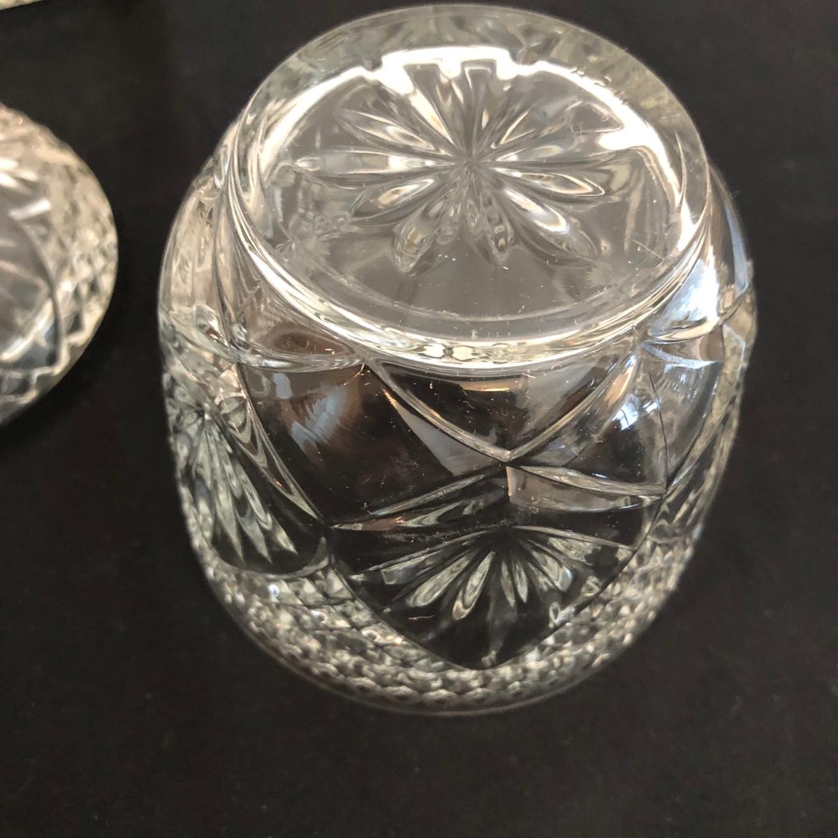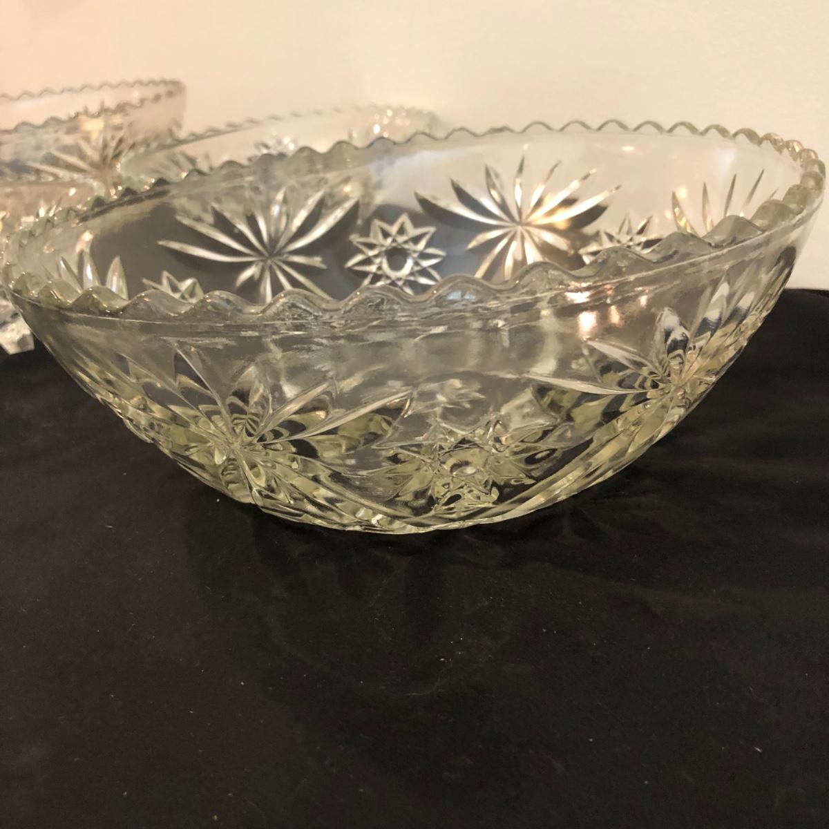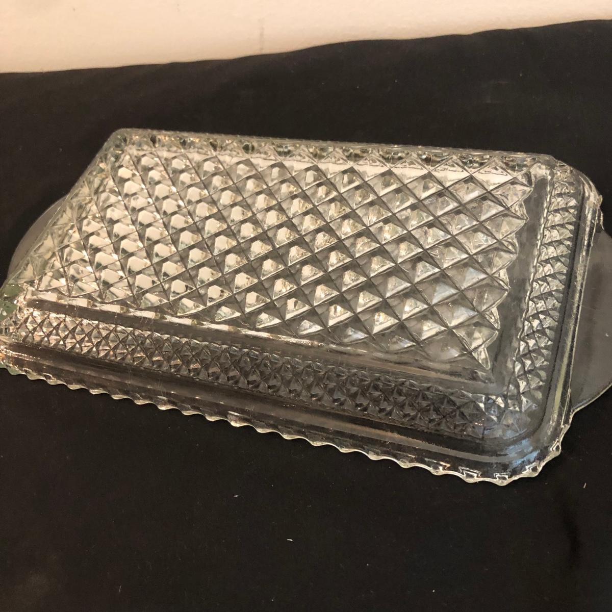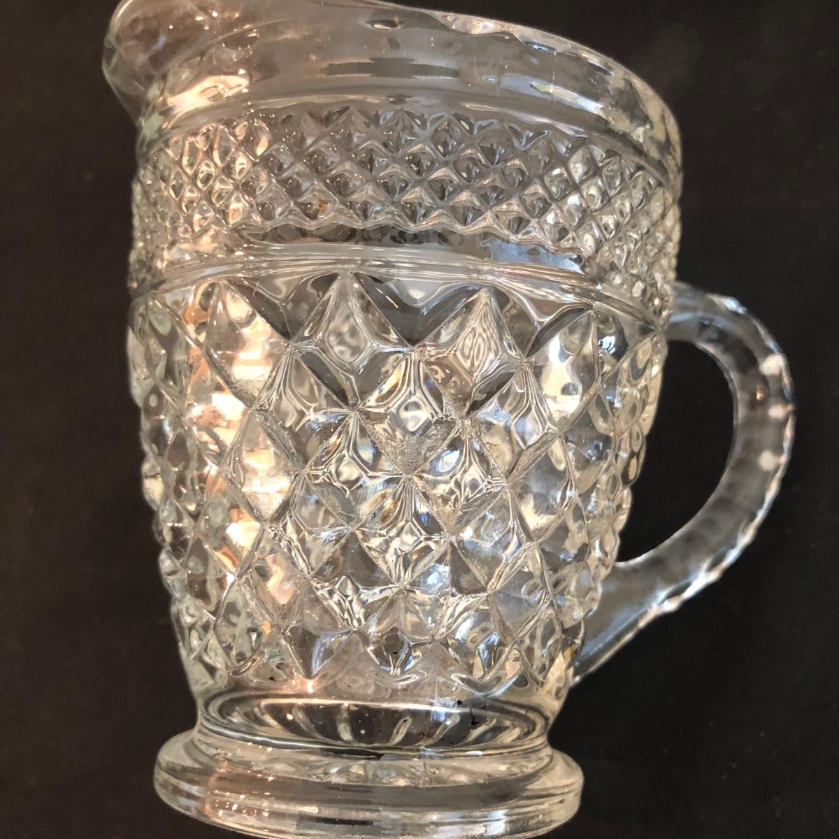 This lot has six glass bowls, five glass plates, a sugar and creamer set, a white pedestal cake plate, a butter keeper, napkin holder and wine bottle holder. The two biggest glass bowls measure 8.5” in diameter and stand over 3” tall. Shipping Available.