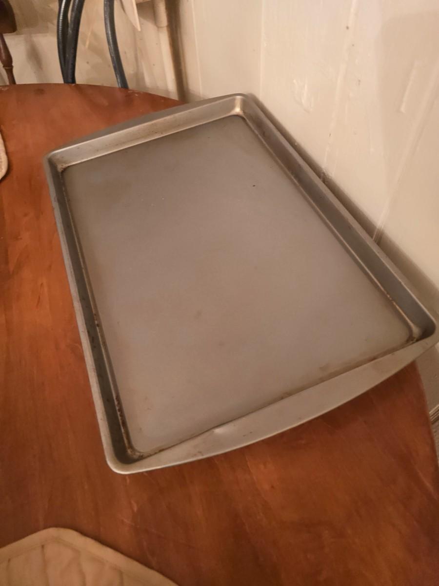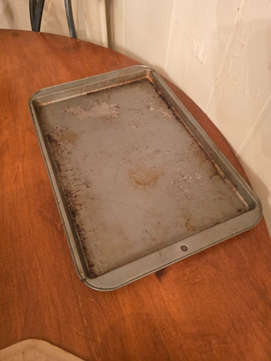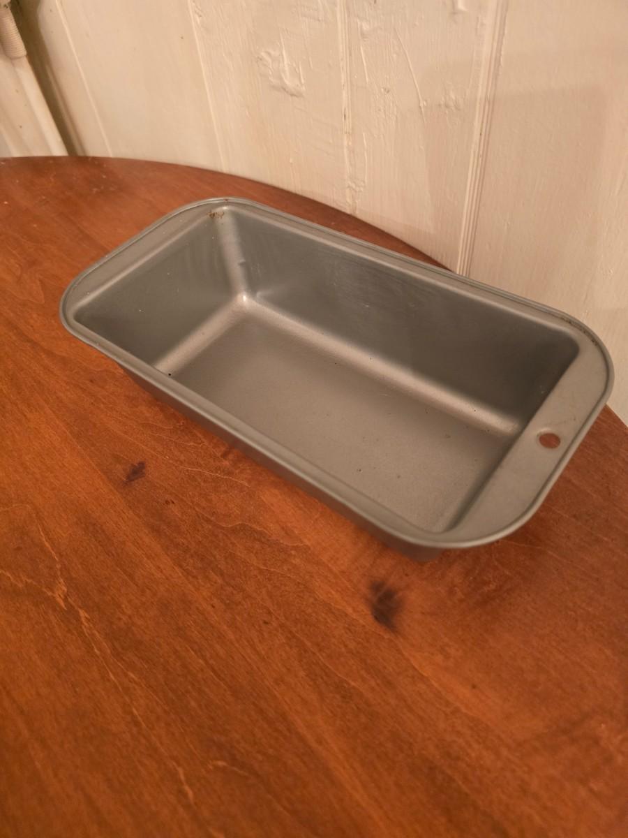Loaf pan, 2 cooking sheets and a plastic serving tray