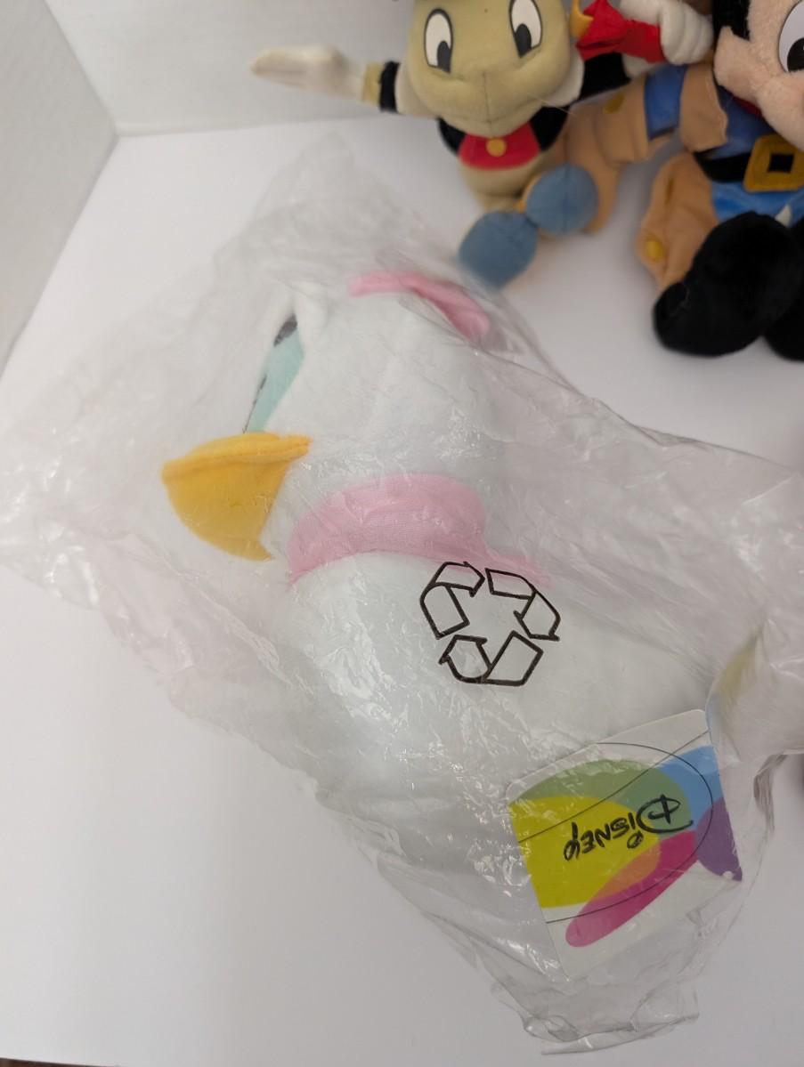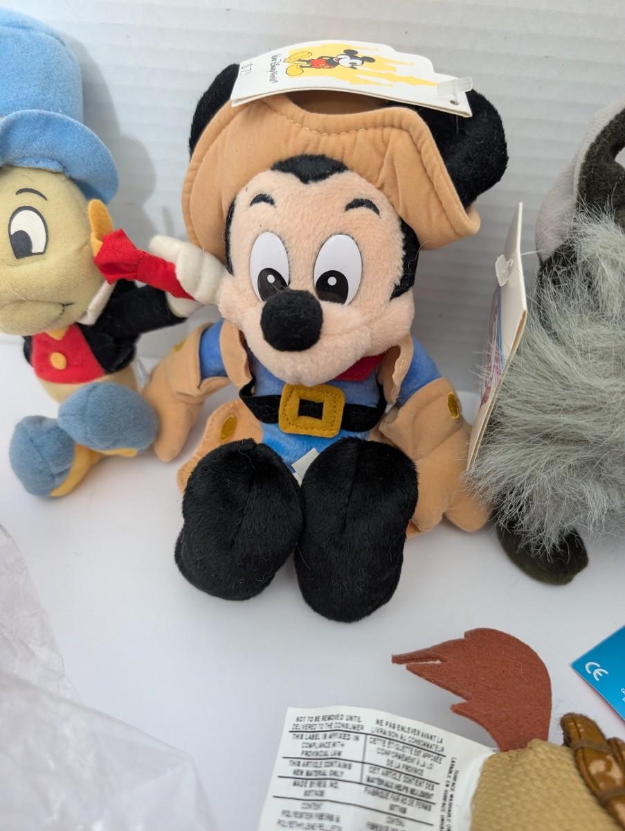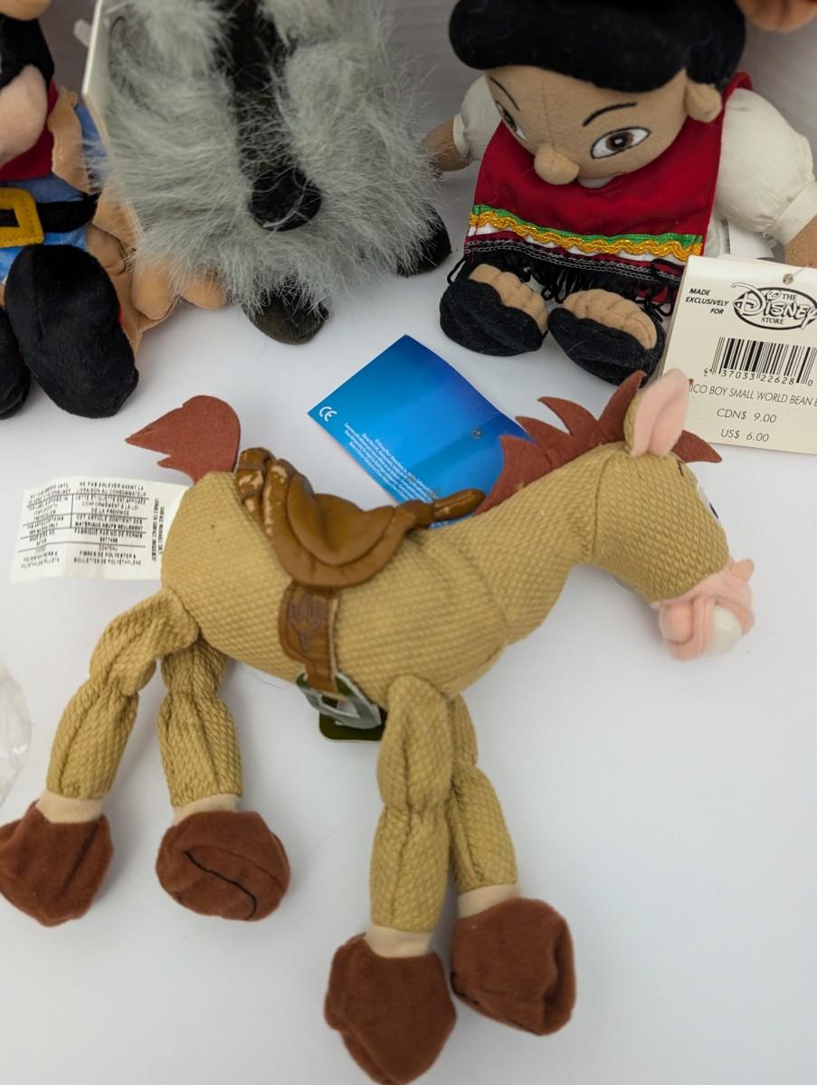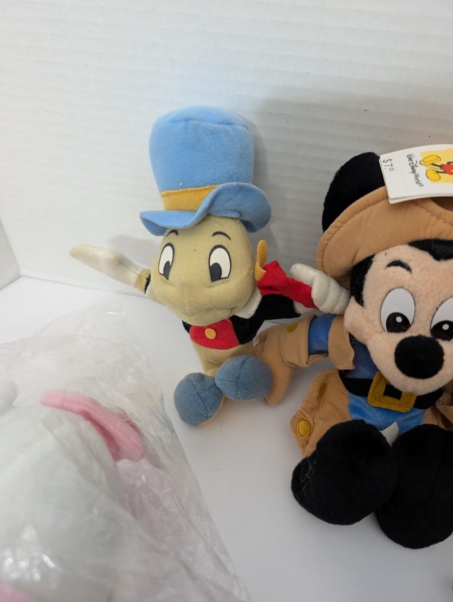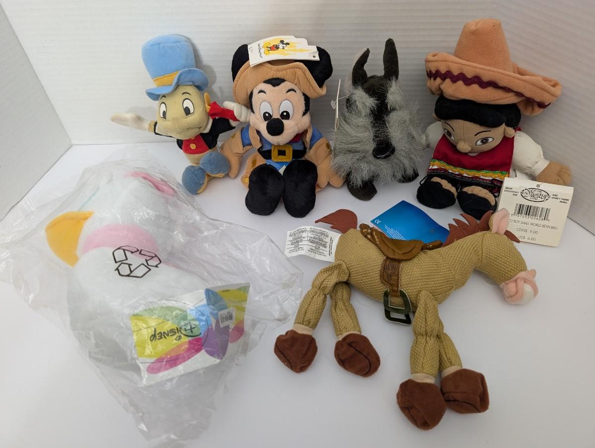 Disney plush lot, bean bag plush, Jiminy Cricket, Mickey Mouse explorer, Great Mouse Detective, Small World plush, Toy Story horse, Disney Store collectible, vintage Disney toys, character plush bundle