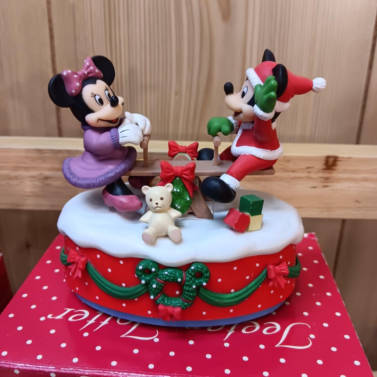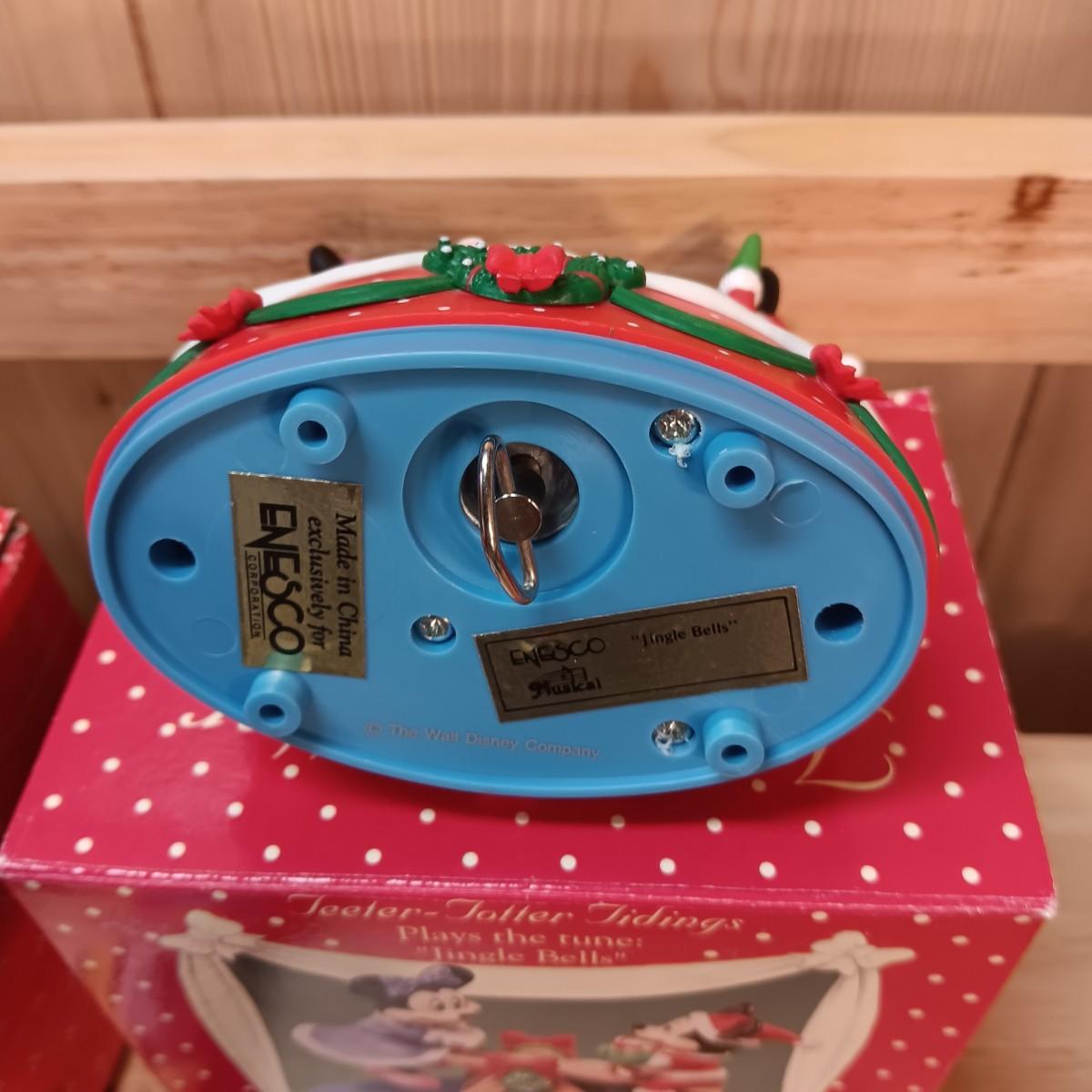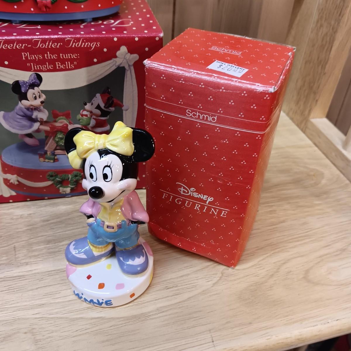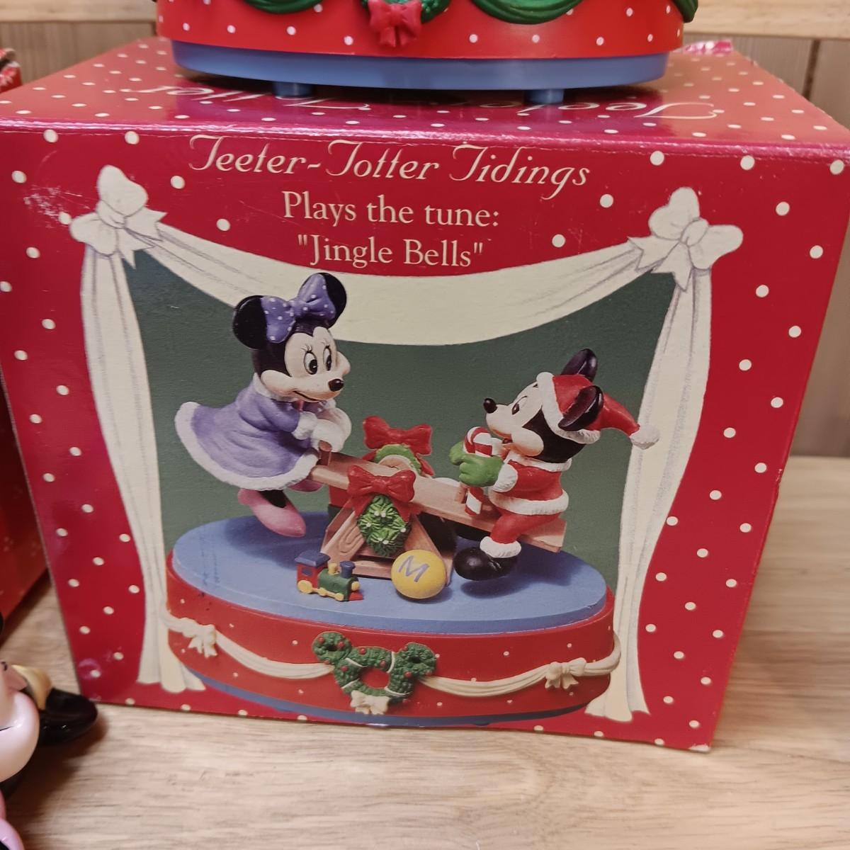 DISNEY CERAMIC FIGURINES AND MICKEY & MINNIE ON A MOVING SEESAW MUSIC BOX