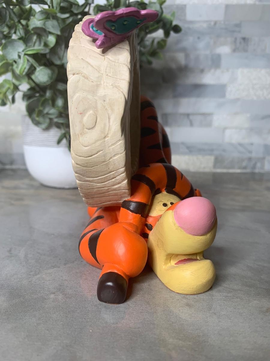 Adorable tigger hiding from the butterfly. He is so silly! This is a Classic Disney Tigger Resin Figurine Picture Frame 4” by 4” and his butterfly.