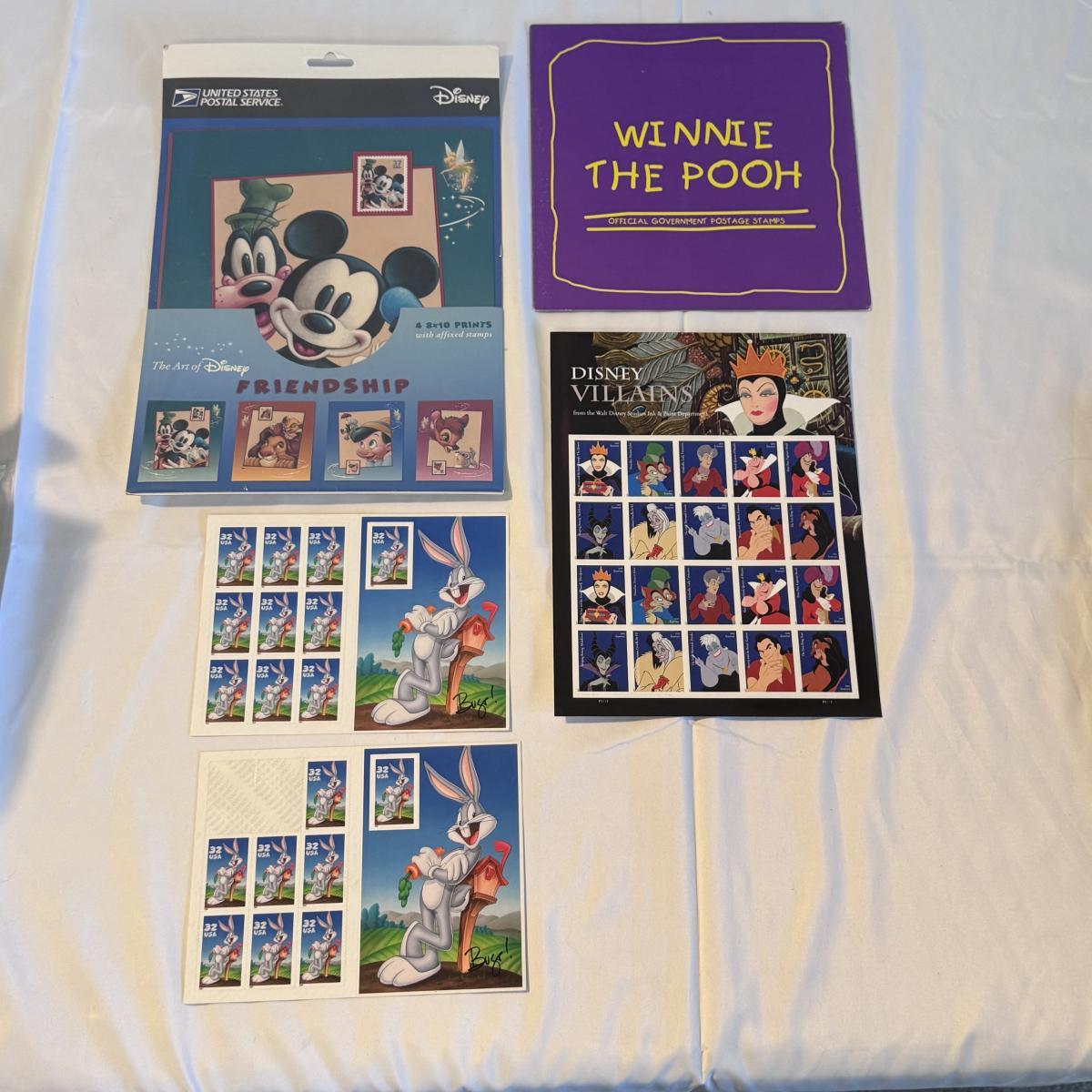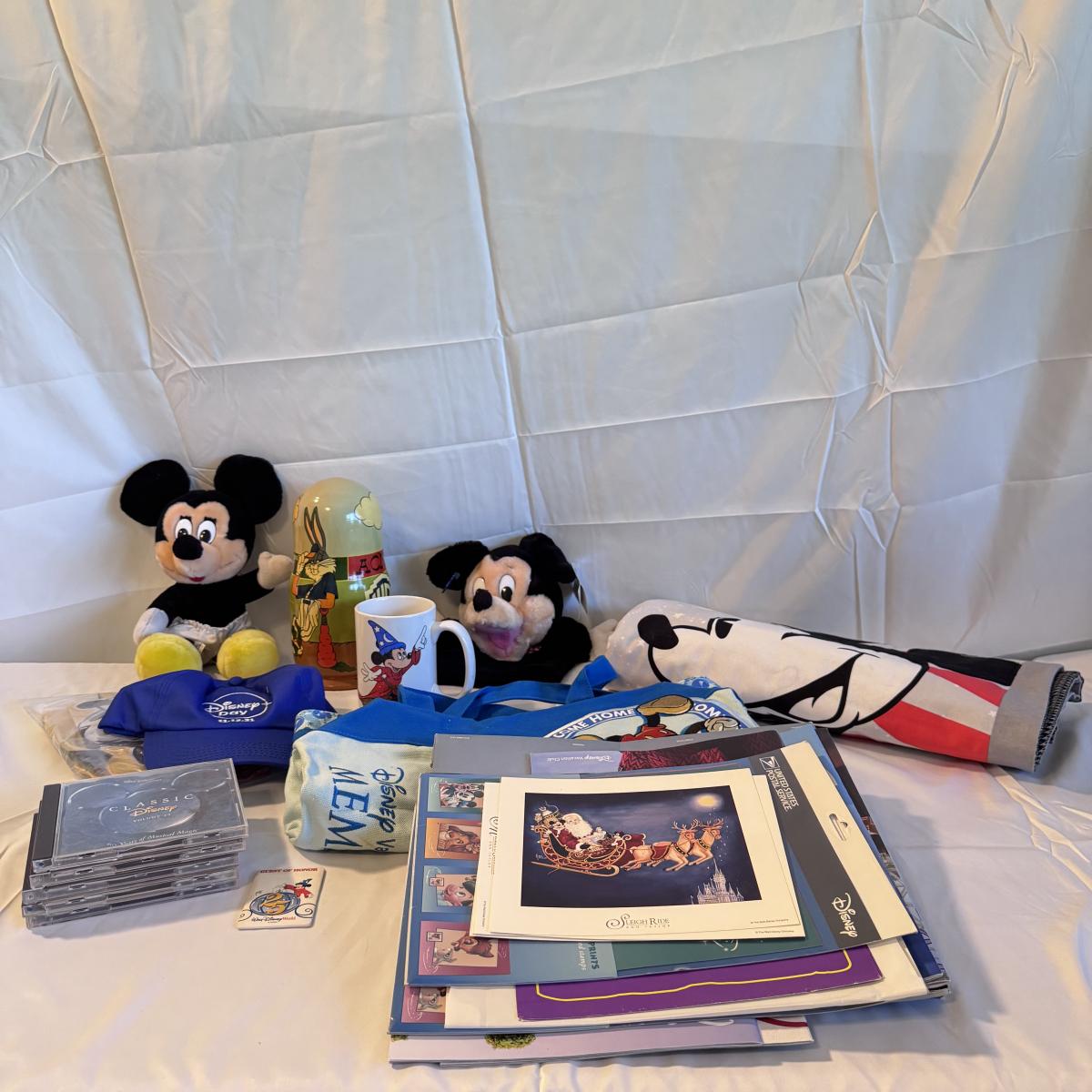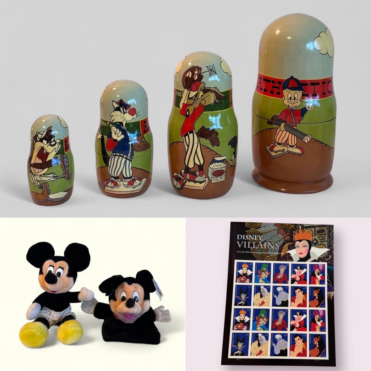This lot includes several Disney items, perfect for the avid Disney collector. You’ll find a set of Looney Tunes nesting dolls, a sparkly Mickey Mouse mug, a Disney Land Minnie Mouse stuffed animal, and a Mickey Mouse hand puppet. You’ll also find five Classic Disney CD’s, a Disney Day hat, a Mickey and Minnie Mouse wall hanging quilt, Disney themed bags, and several Disney stamps. The canvas bag has a small stain, see photo. The wall hanging quilt is the largest item that measures 34.5” x 41”H. Shipping available.