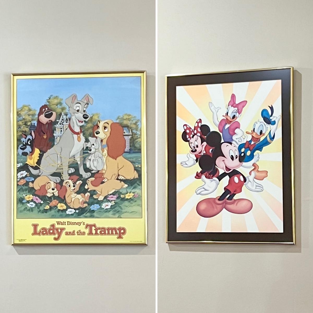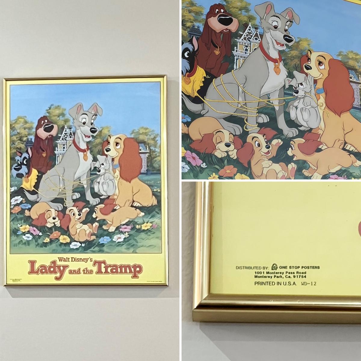 Mickeys poster has anti glare glass ~ Mickey & friends = 27.25” H x 21.25” W ~ Lady & The Tramp = 28.25” W x 22.25” W