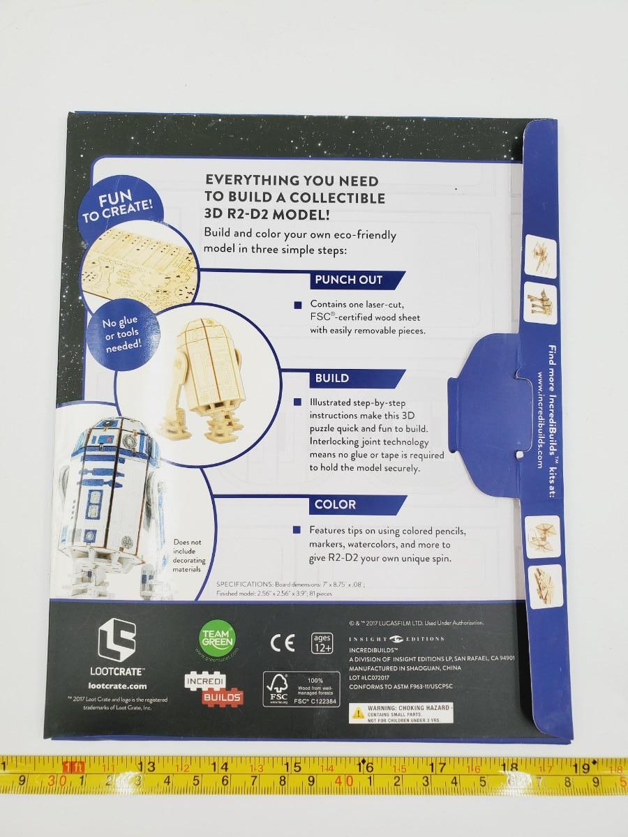 Includes easy to assemble laser cut wood pieces still sealed, step by step instructions, coloring and crafting ideas and a R2-D2 booklet. Ages 12+