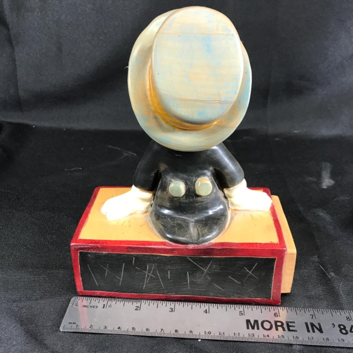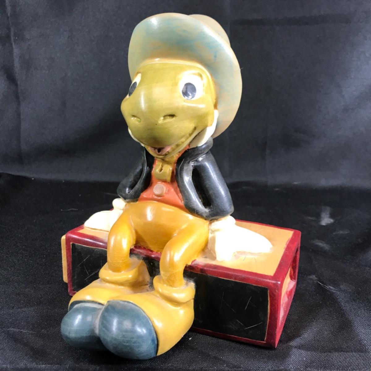 Up for auction is a licensed Walt Disney production Jiminy cricket wooden statue it. It is overall in good condition with some slight crazing to the varnish; see pictures.