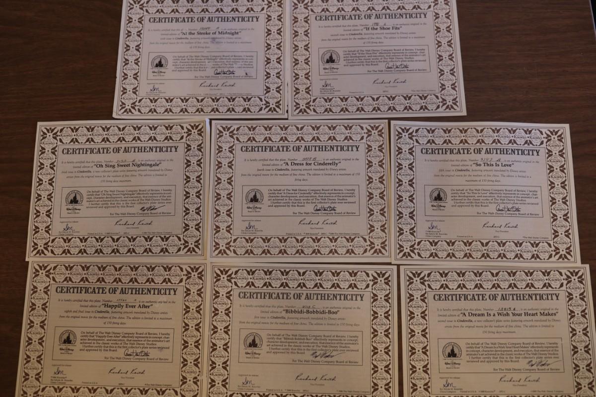 Collection of 8 Disney Knowles "Cinderella" with Certificate of Authenticity, original boxes and informational booklets.