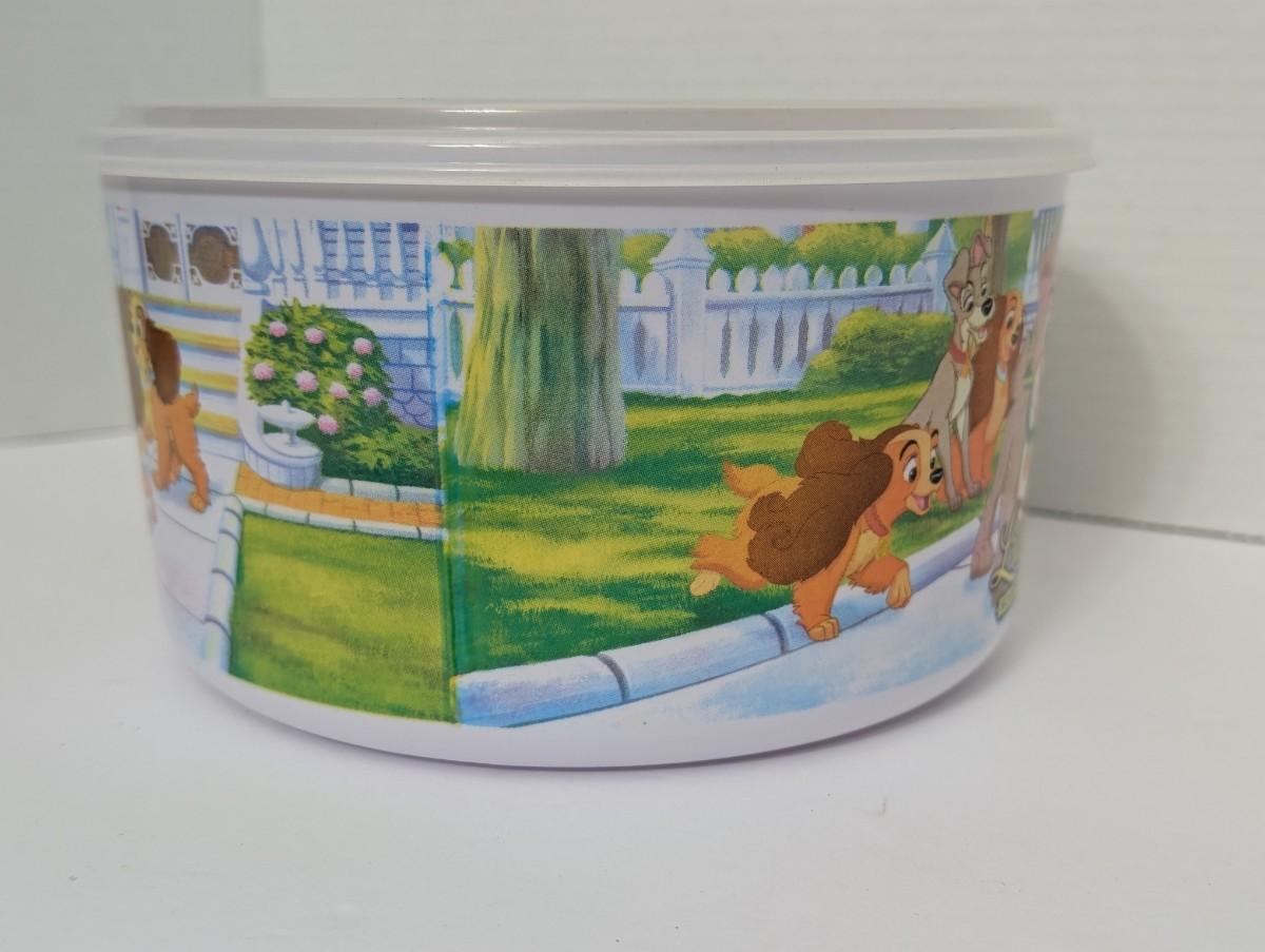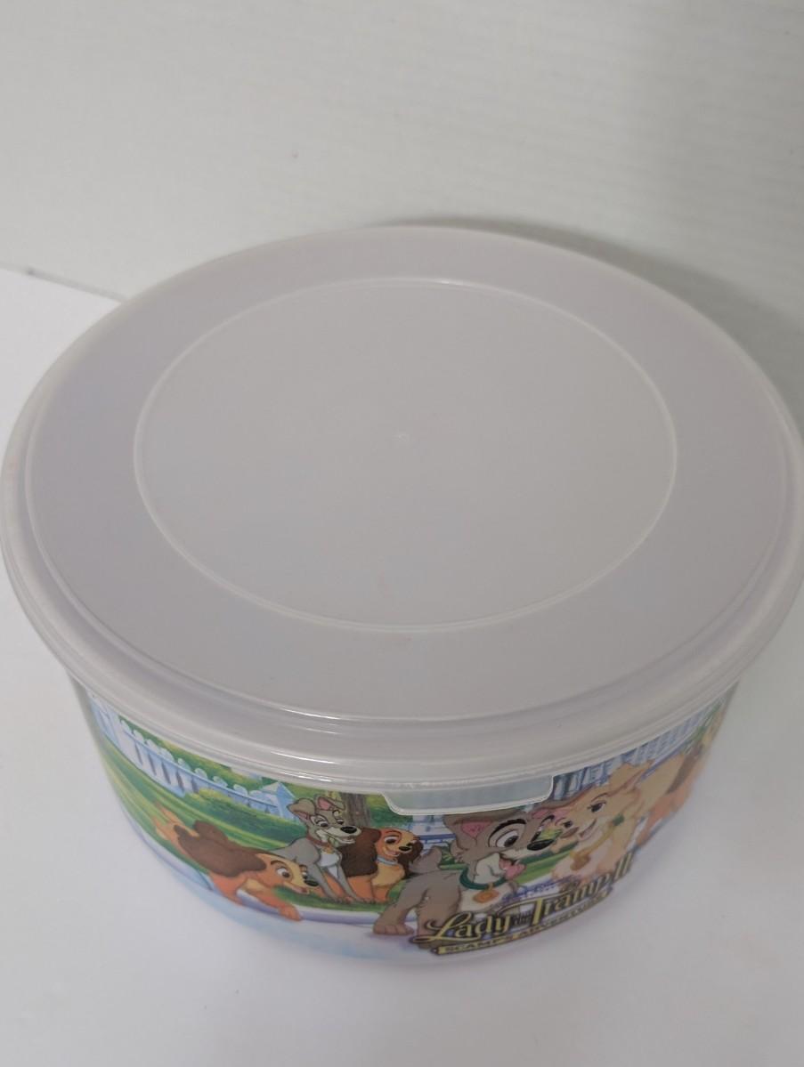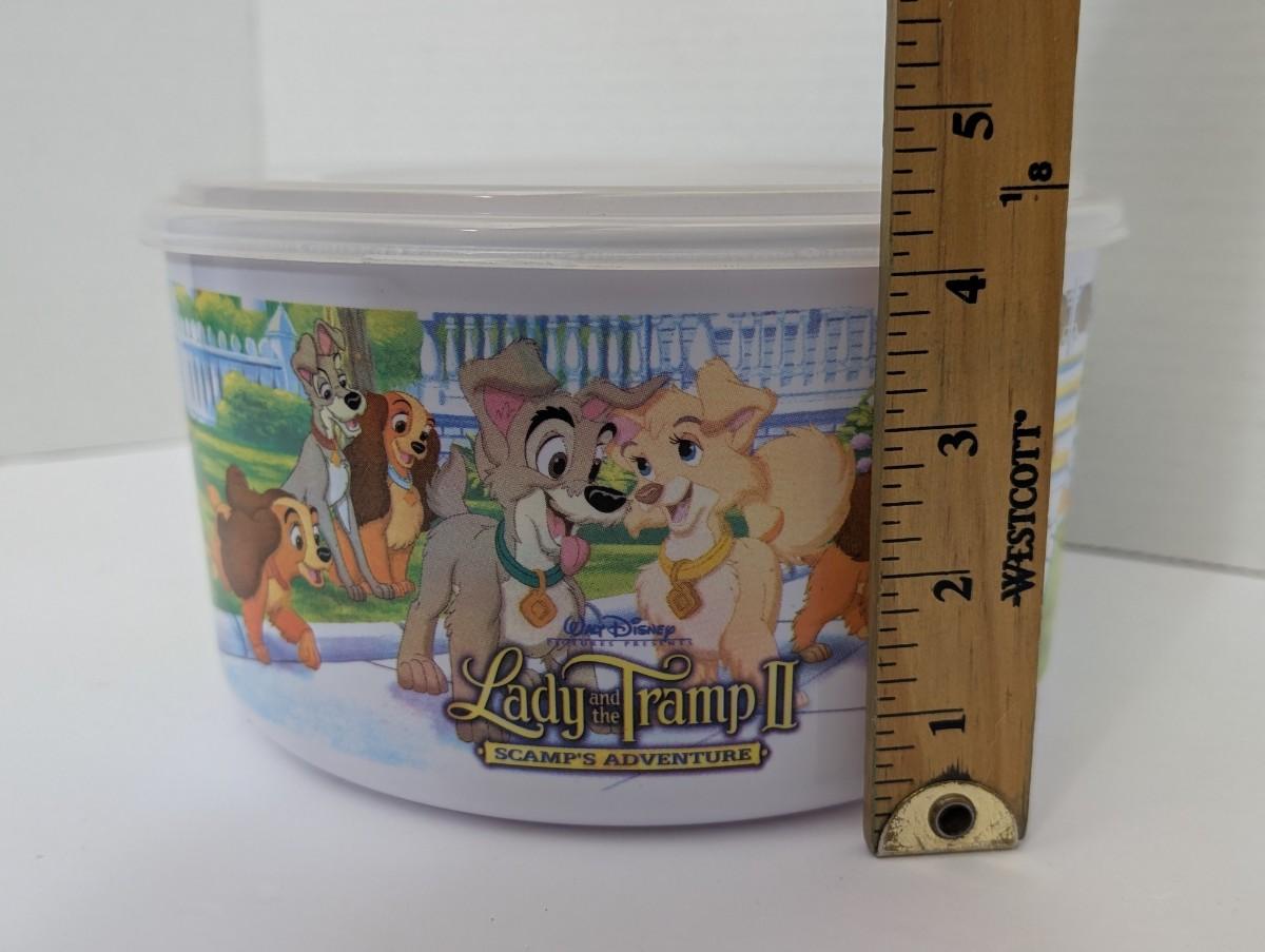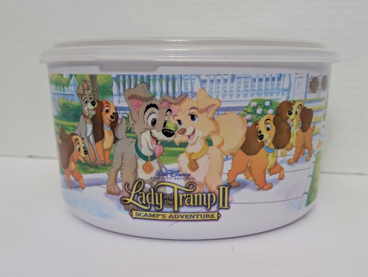 Disney Lady and the Tramp II, Scamp’s Adventure, Kellogg’s bowl, 2000 collectible, vintage Disney, promotional item, cereal bowl, plastic bowl with lid, Disney kitchenware, animated movie collectible, Scamp and Lady, Disney memorabilia, nostalgic 2000s, Kellogg Company, Disney collectible