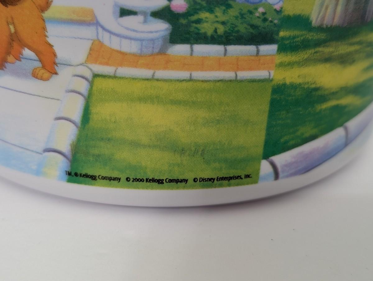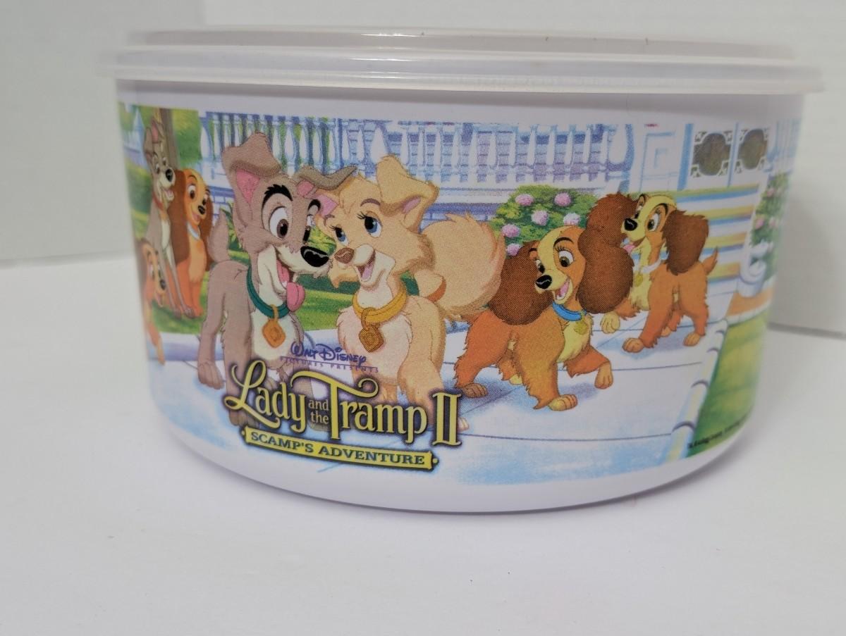 Disney Lady and the Tramp II, Scamp’s Adventure, Kellogg’s bowl, 2000 collectible, vintage Disney, promotional item, cereal bowl, plastic bowl with lid, Disney kitchenware, animated movie collectible, Scamp and Lady, Disney memorabilia, nostalgic 2000s, Kellogg Company, Disney collectible