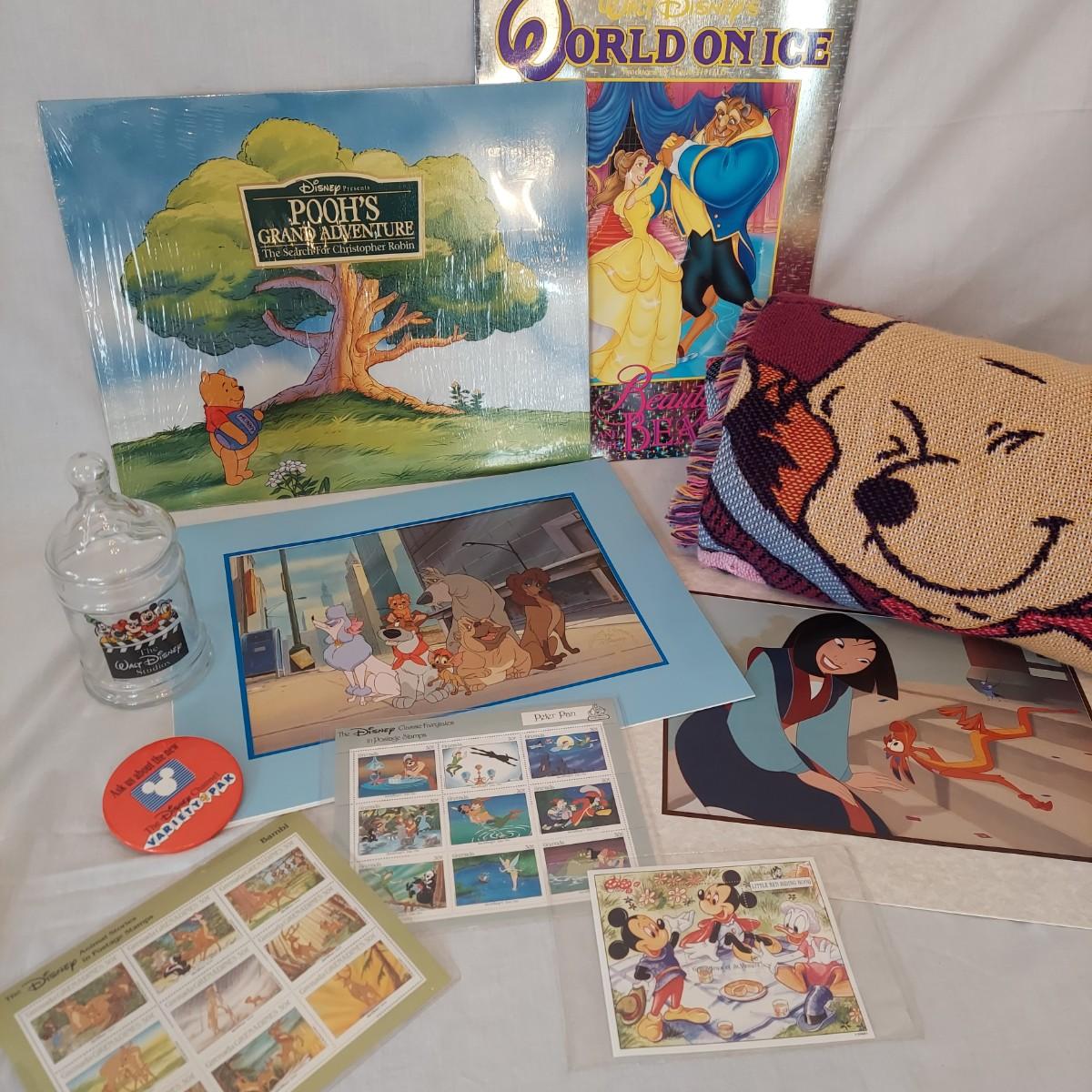 This lot includes many Disney lithograph prints and collectible stamps. There are also other small Disney items including two keychains, a watch, a pin and two trinket jars. It has a Winnie the Pooh blanket and poster, and two Disney on Ice programs as well. The blanket has a few small snags. Most of the lithos measure 11" x 14". The Snow White one is 12" x 16". The Winnie the Pooh and Little Mermaid packs are sealed and include four lithos each. All sales are final. No returns or refunds. Please bid accordingly. Shipping available. Shipping available. Shipping can be costly. We suggest contacting our preferred local shipping provider, Postage Express, with dimensions and getting an estimate before bidding: (828) 670-5501or postageexpress@yahoo.com.