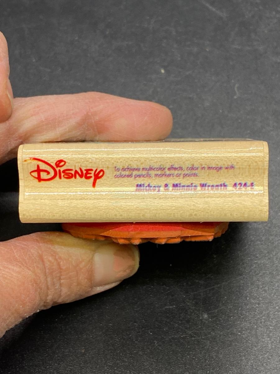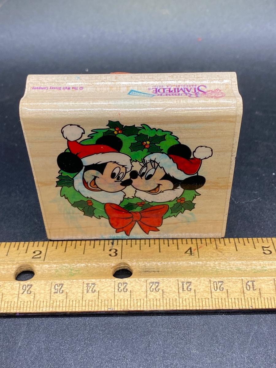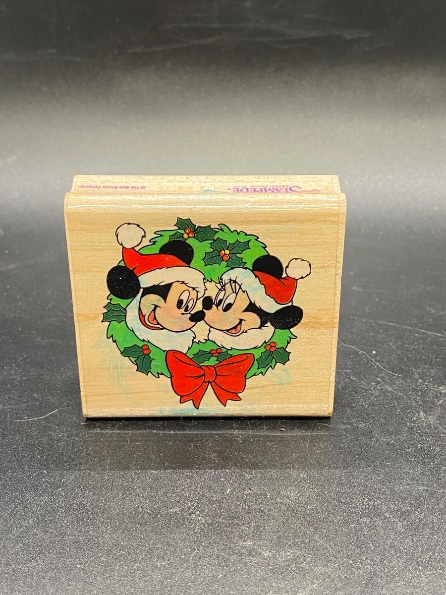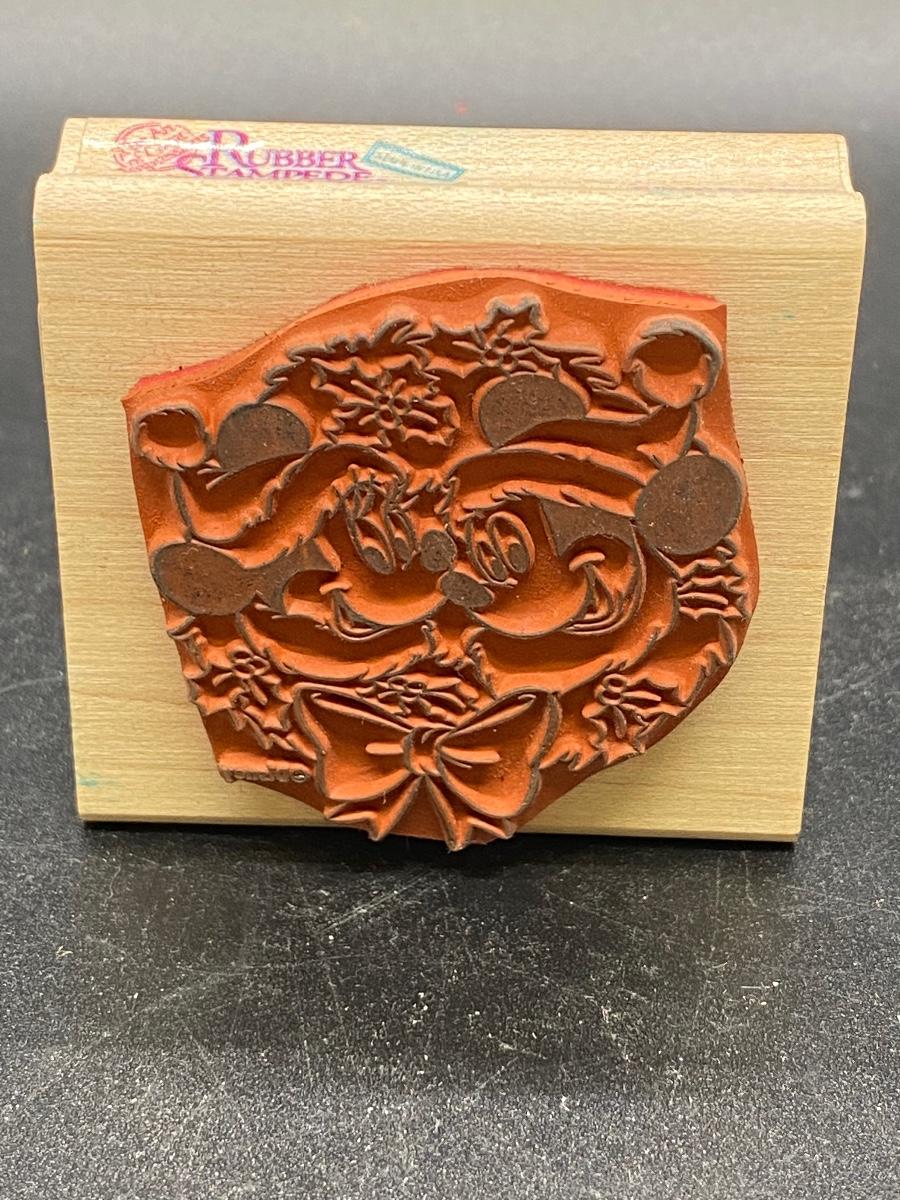 Disney Mickey and Minnie Mouse Christmas holiday wreath rubber stamp. About 2" size. Good used condition.