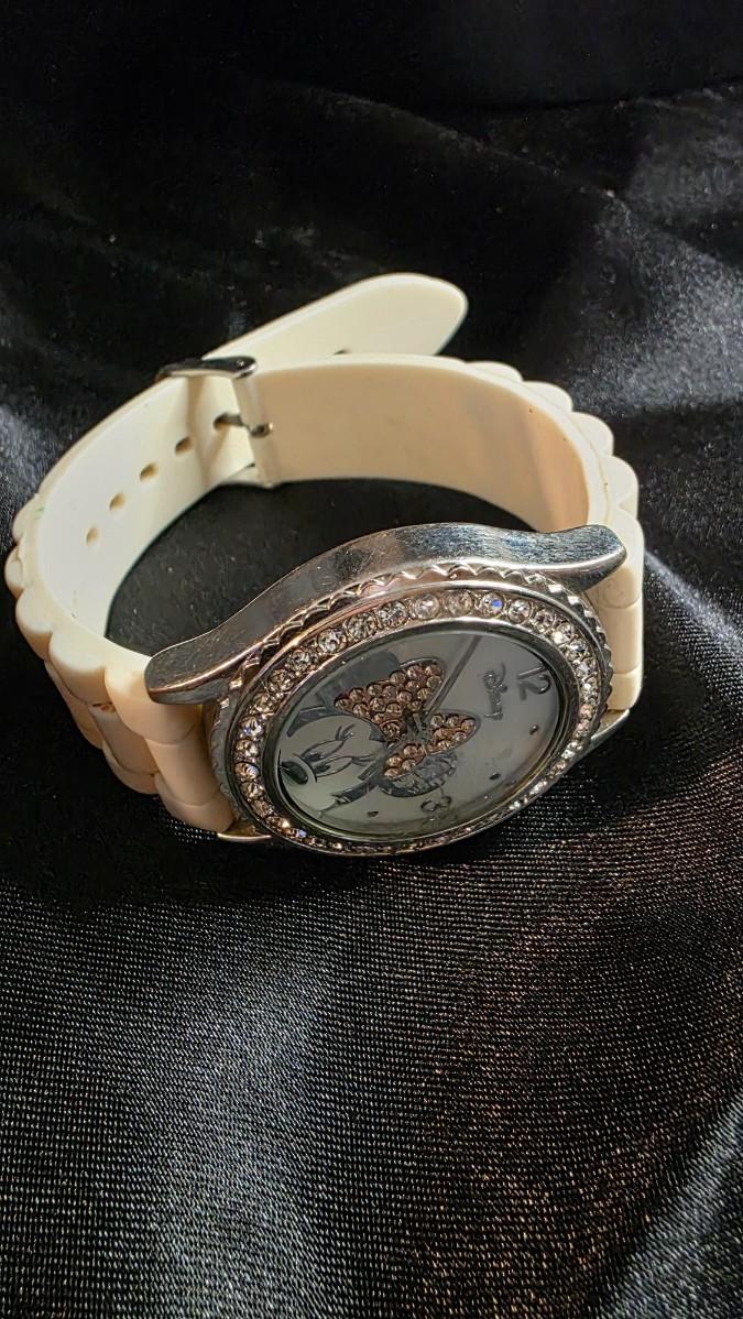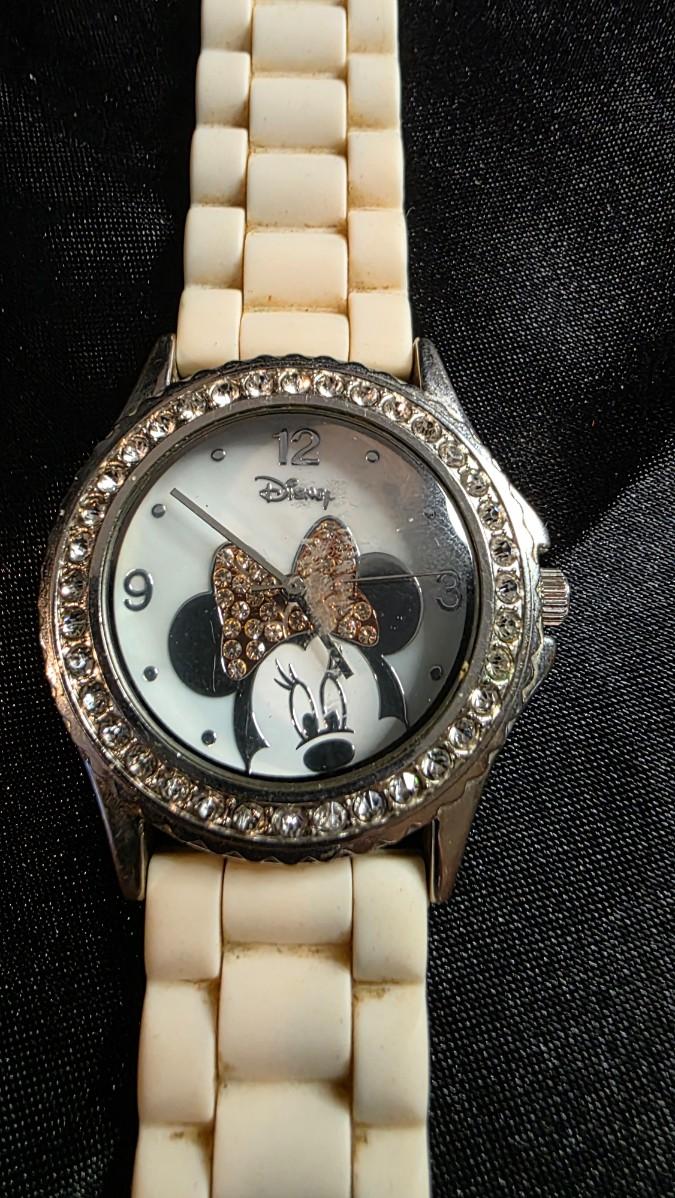 In the playful wink of a spotlight moment, where polka dots swirl and bows flutter with every giggle, a Minnie Mouse watch captures the essence of timeless mischief—a round face framed by a bezel of sparkling rhinestones that dance like paparazzi flashes, Minnie’s iconic silhouette striking a pose with hands forming her signature bow, the white rubber strap soft and sporty against the wrist, the quartz heart ticking with the carefree rhythm of a girl who knows the world is her stage. The crystal gleams clear, the Disney signature nestled proudly beneath her smiling face, every detail a burst of joy that turns timekeeping into a celebration of fun and femininity.