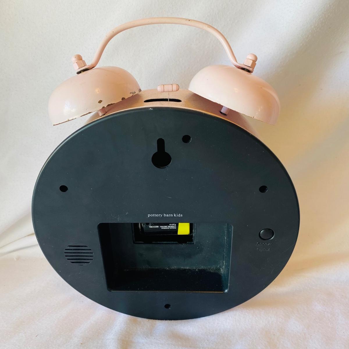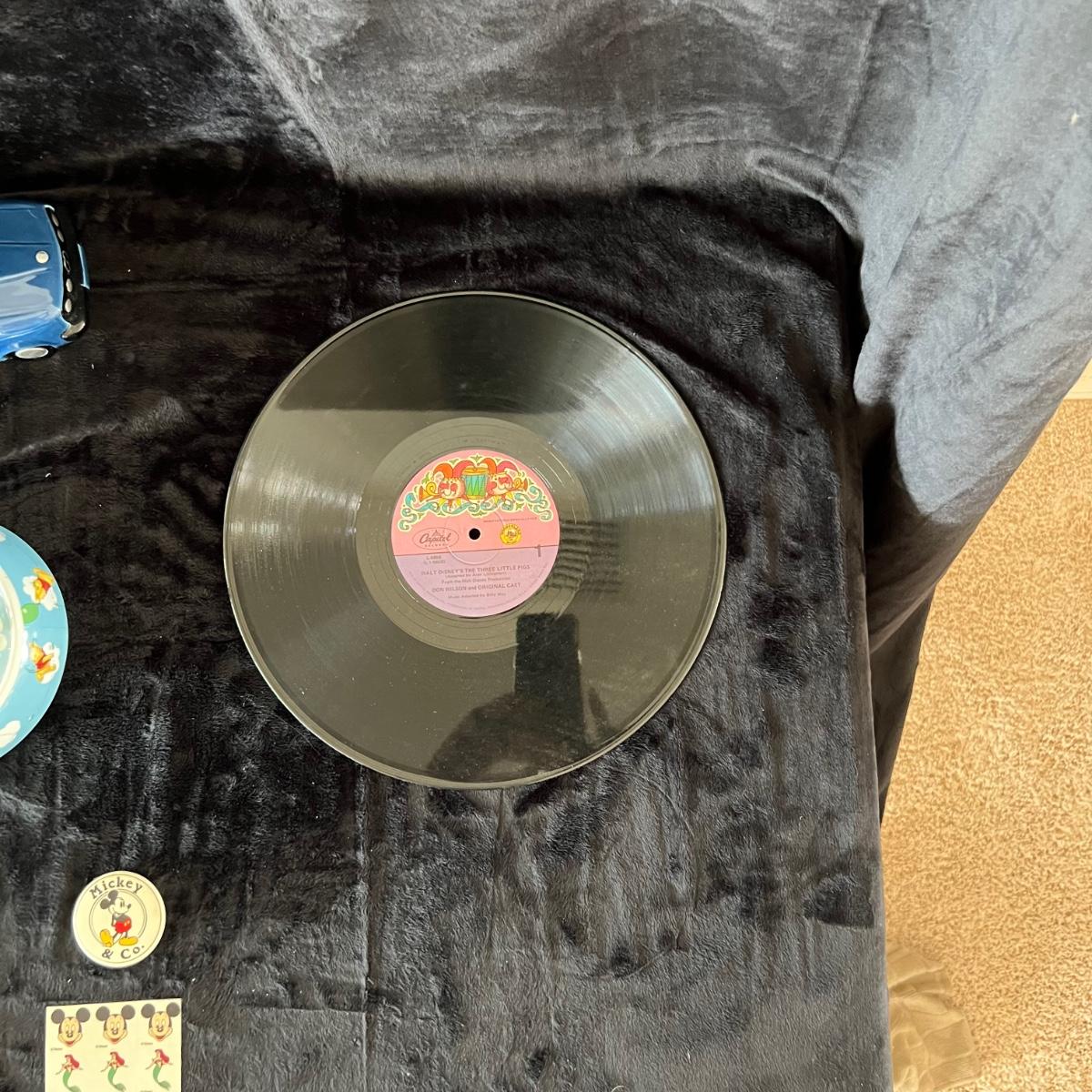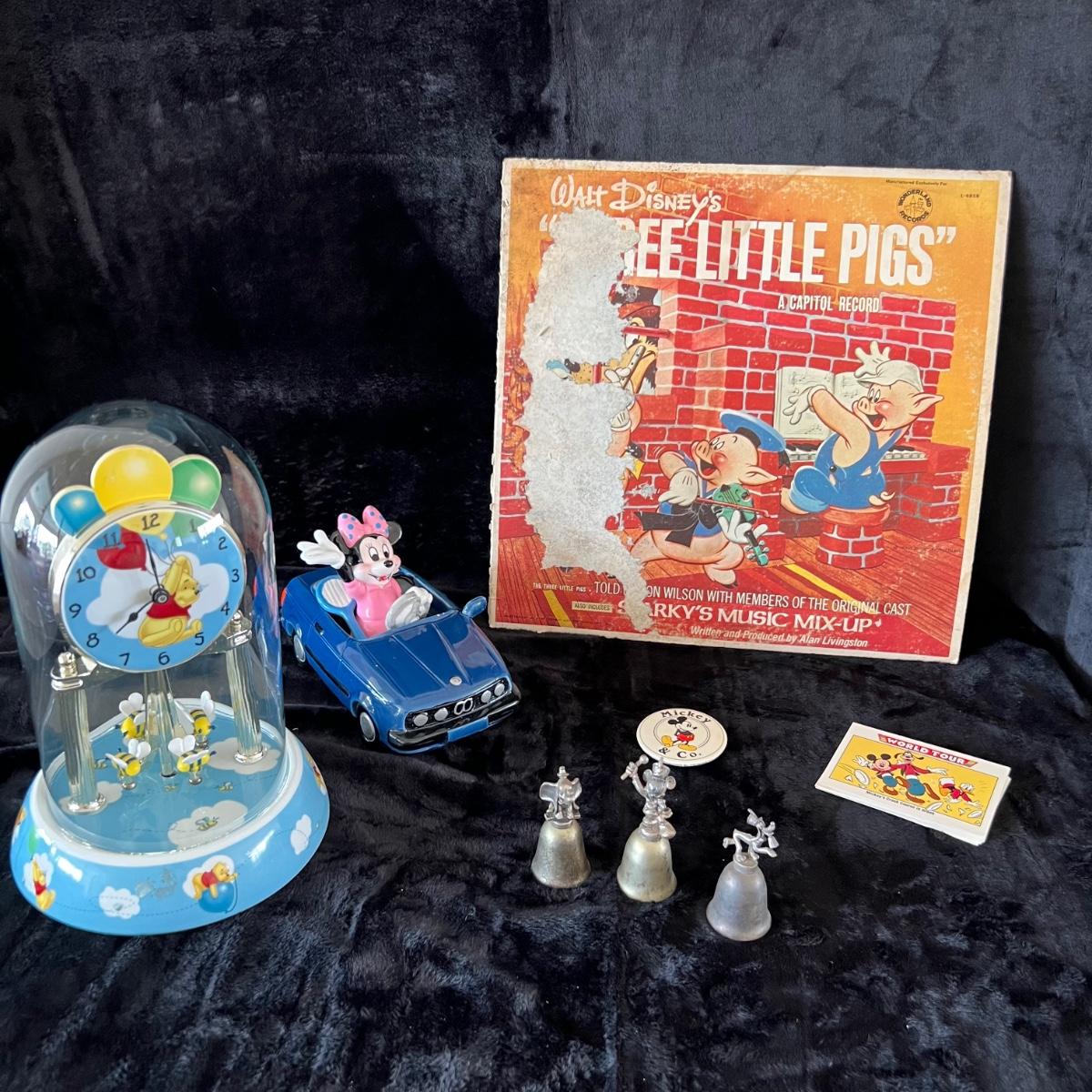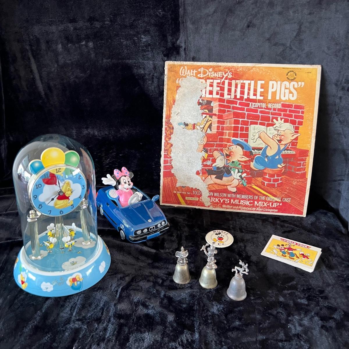 Assortment of Disney Collector Cards and stickers and one Mickey Mouse Pin.. Three Little Pigs Album is in good condition. Three small silver Disney Characters Bells. Pink Pottery Barn Kids metal clock. Measuring 8.25”L x 3”W x 11.5”H. Shipping available.