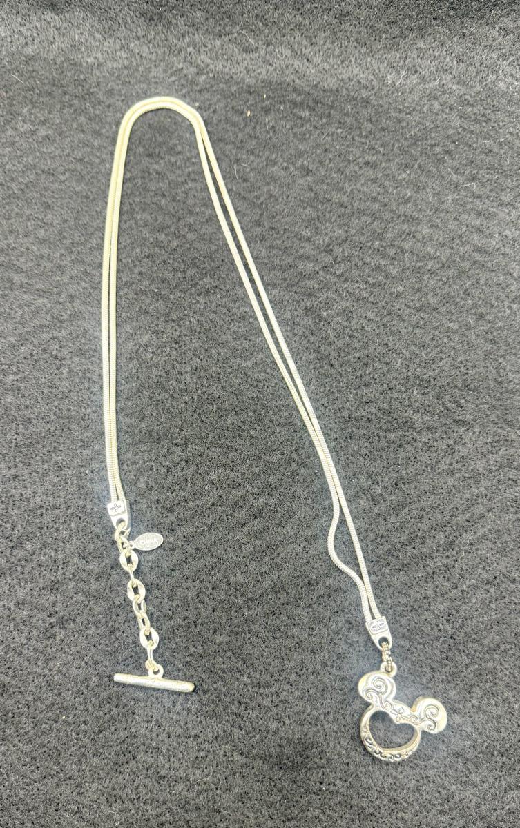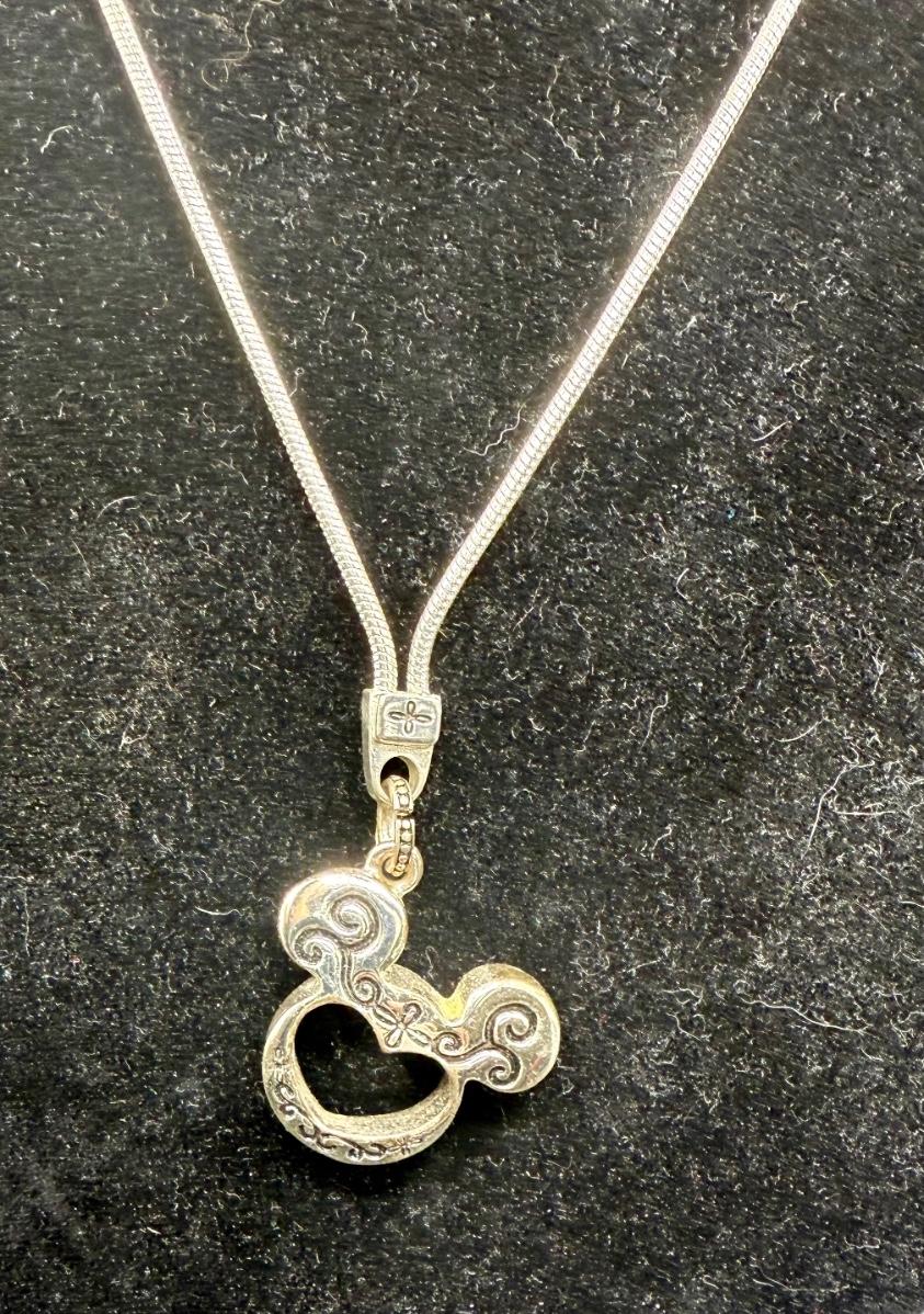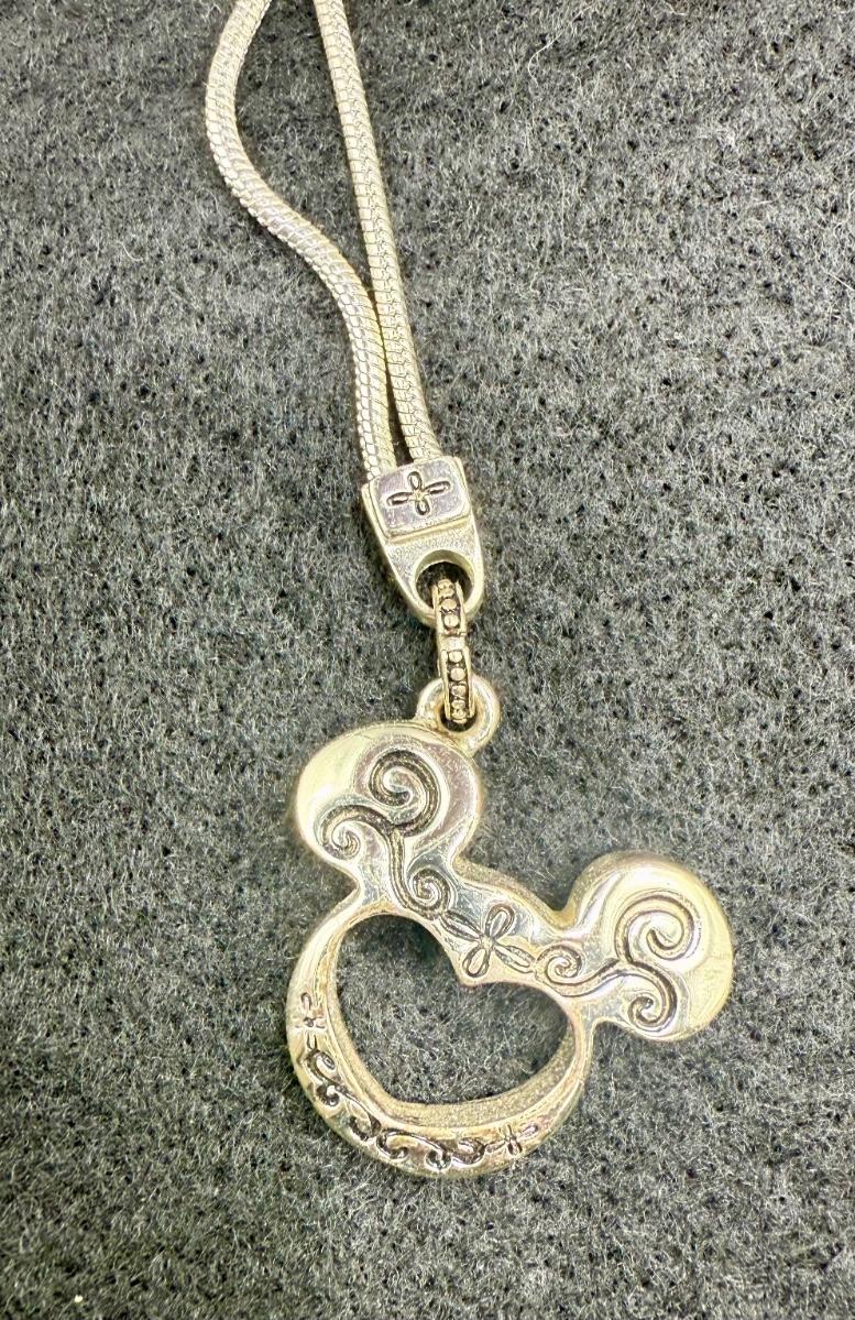 Mouse ears shaped chunky silver tone pendant with a heart-shaped opening. Great condition. Made in china for Disney