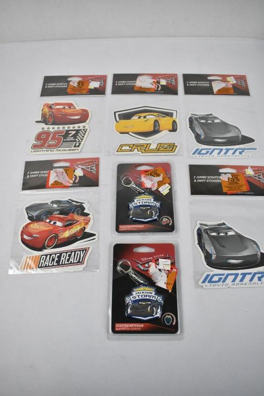 Disney Pixar Cars 3: 5 Jumbo Scented Stickers & 2 Scented Keychains - New