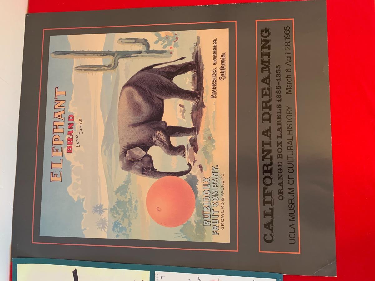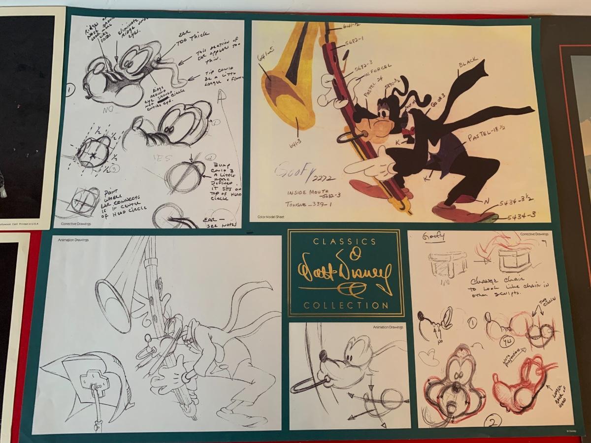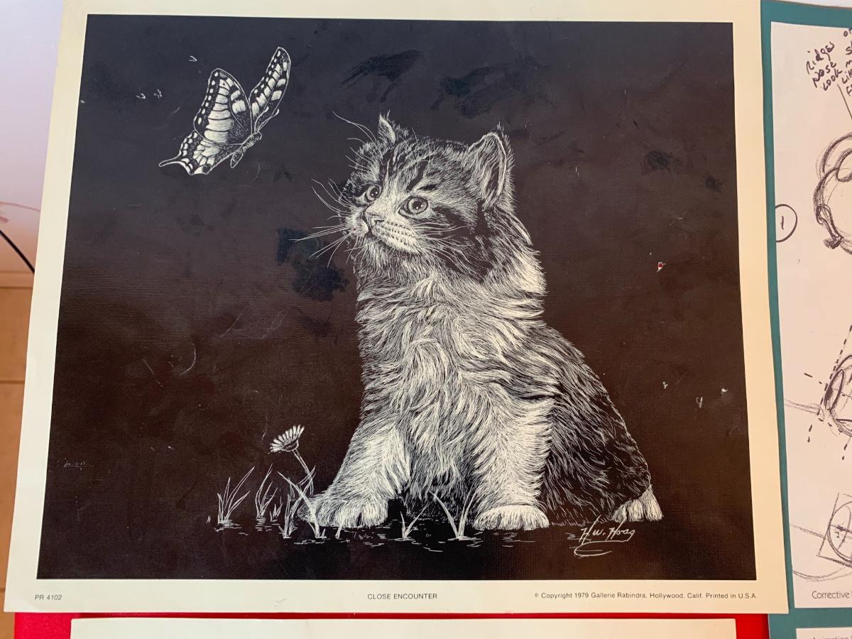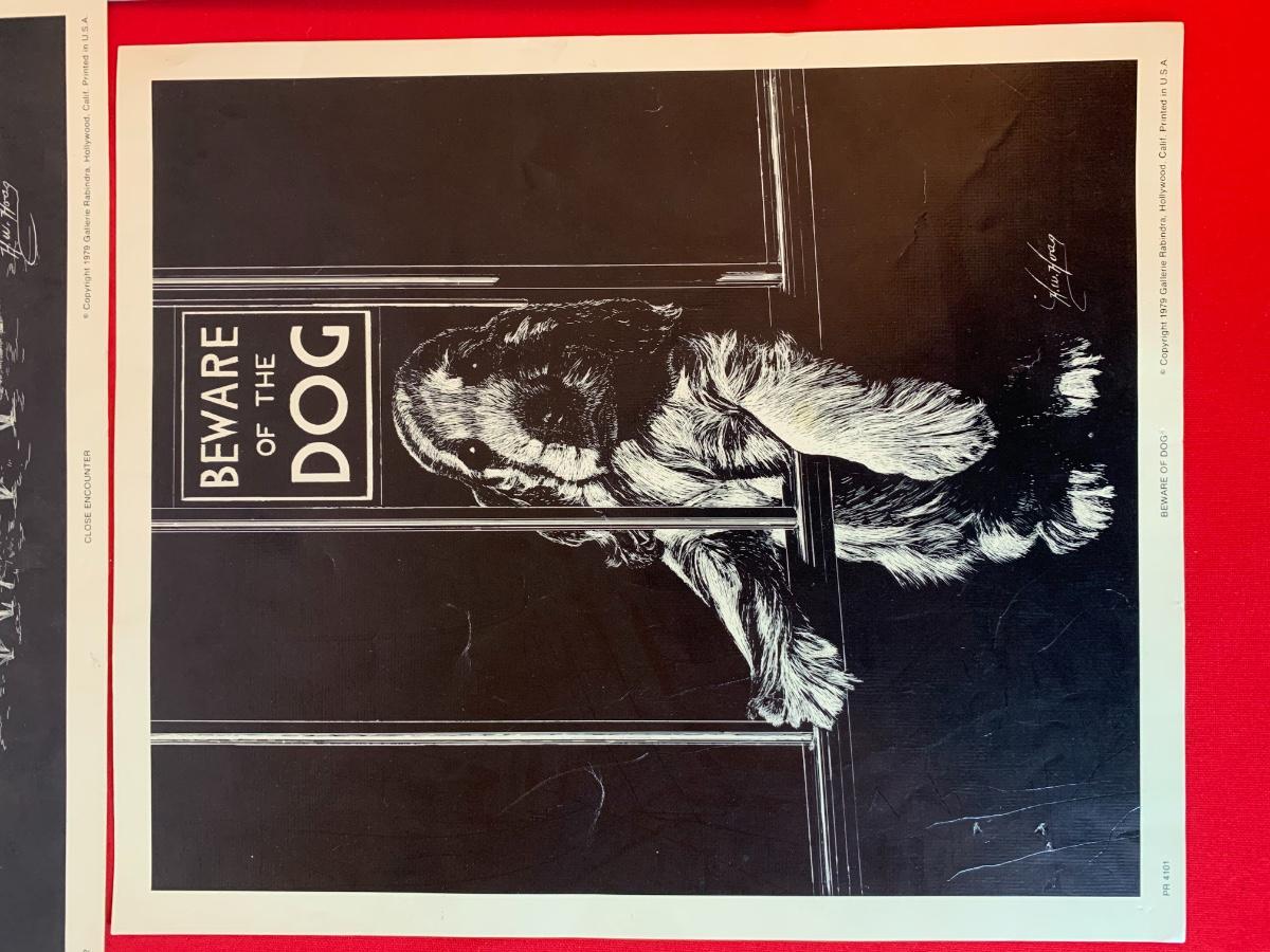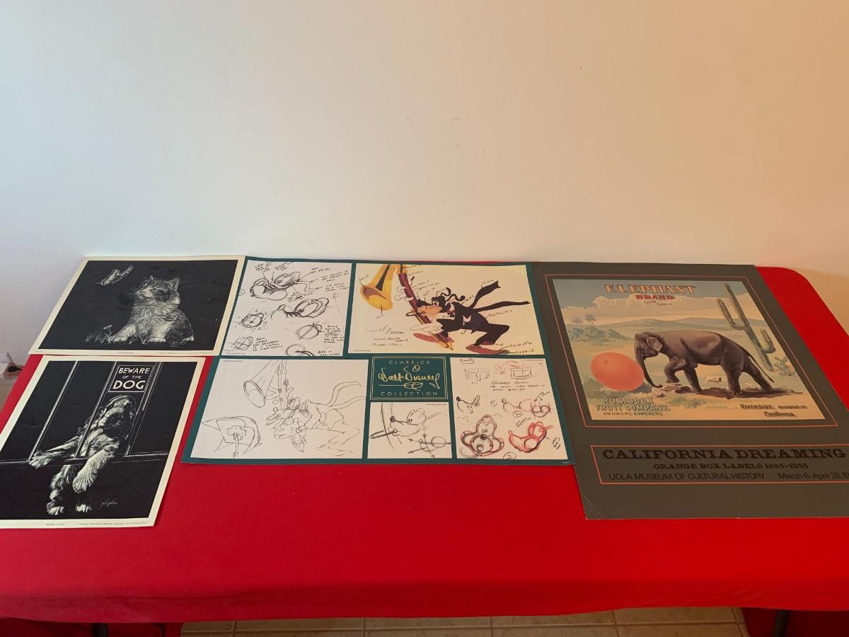 Lot includes a Disney poster print on Goofy Animation, two 1979 black and white cat/dog prints and a California Dreaming elephant fruit poster print.