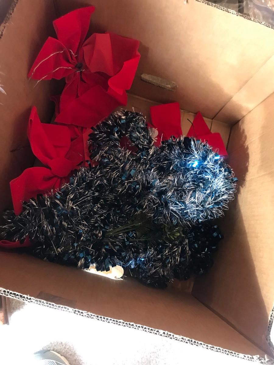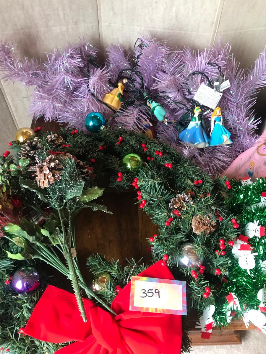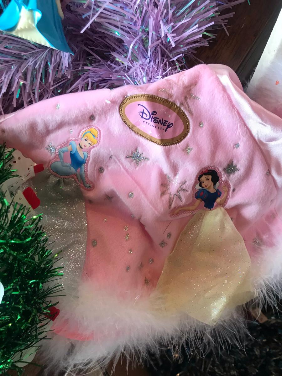 How cute, a lavender tree with blow mold string lights, a Disney Princess tree skirt. The DP stand is not photographed, but there. Plus other greenery!