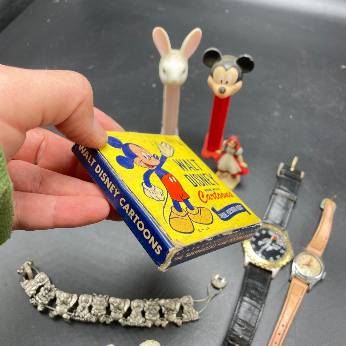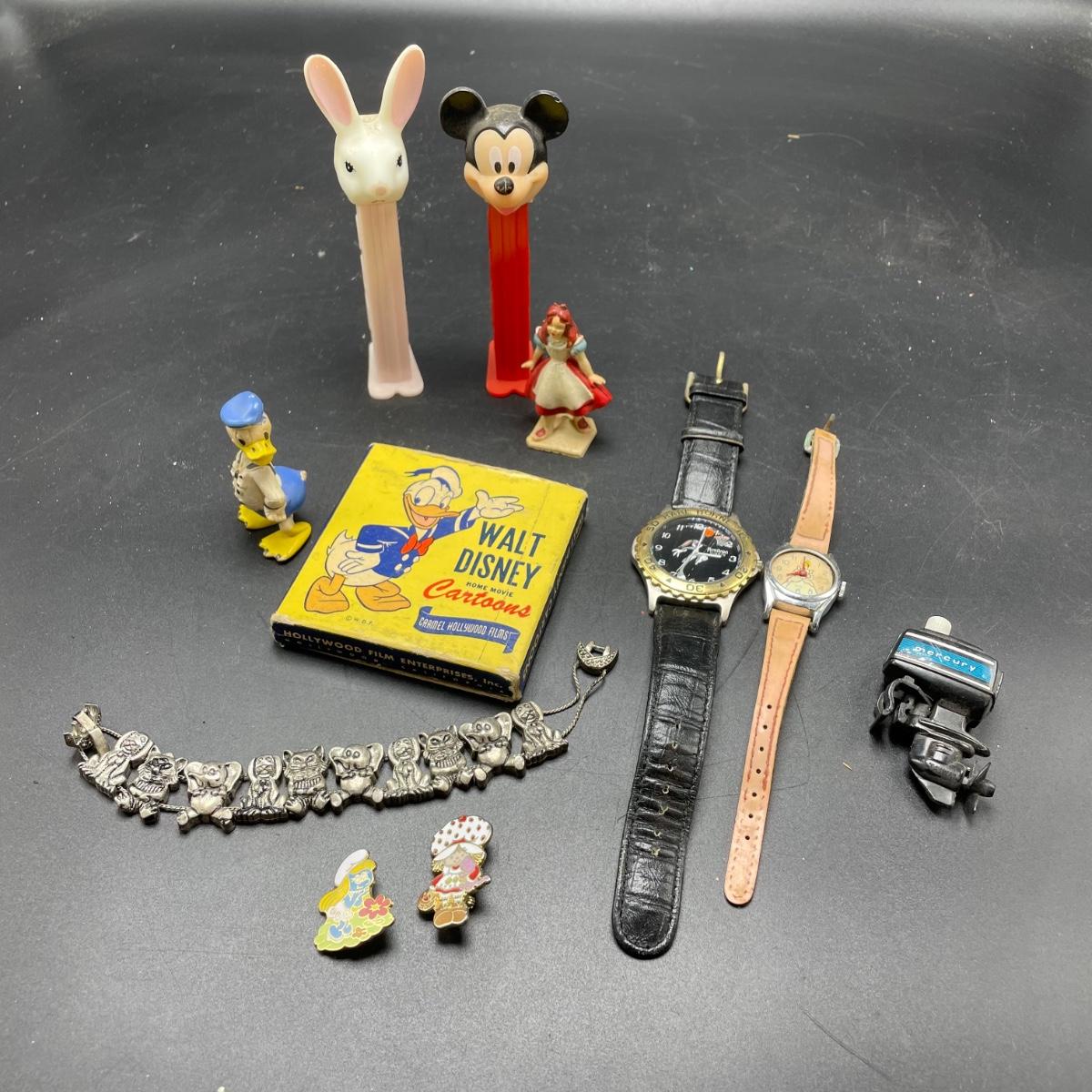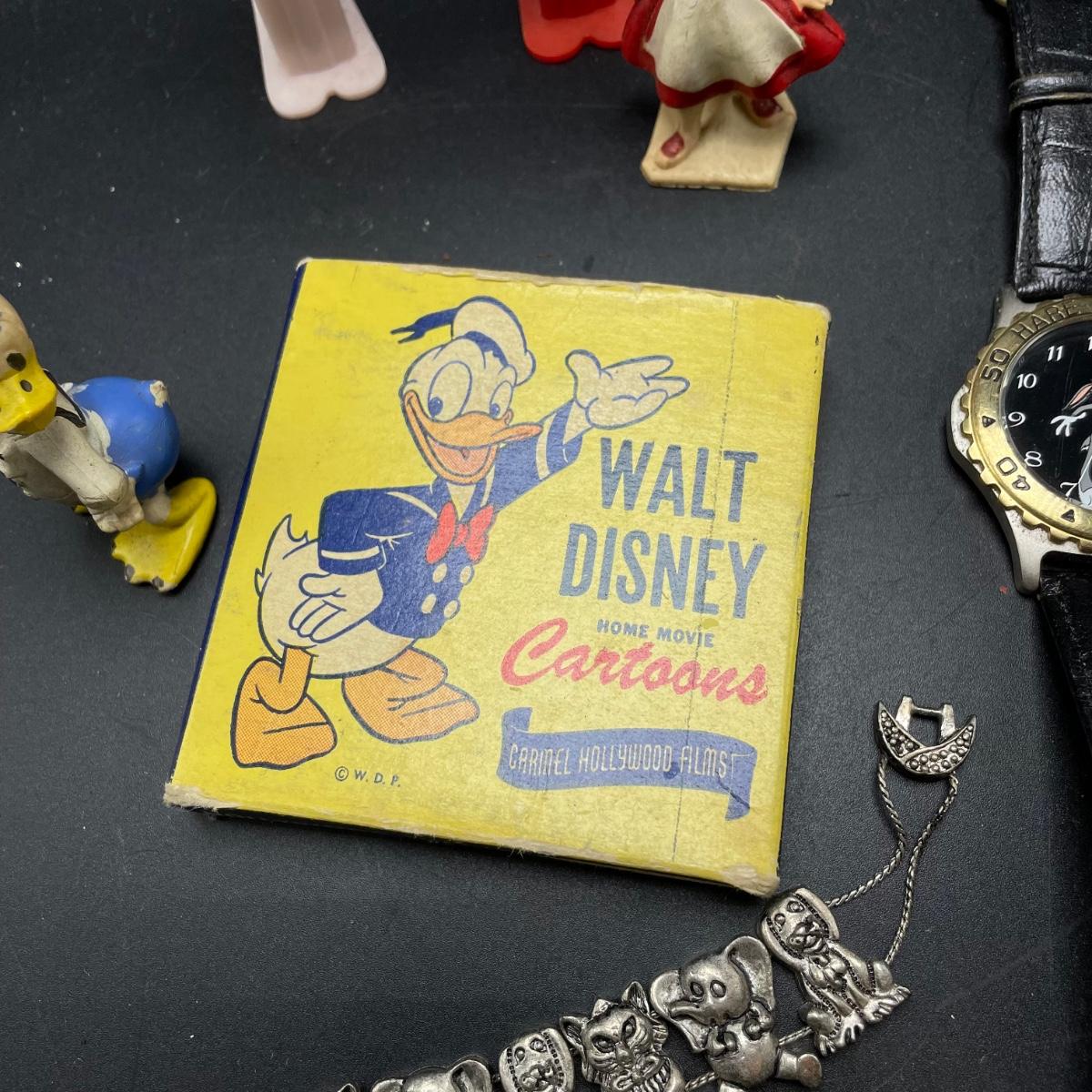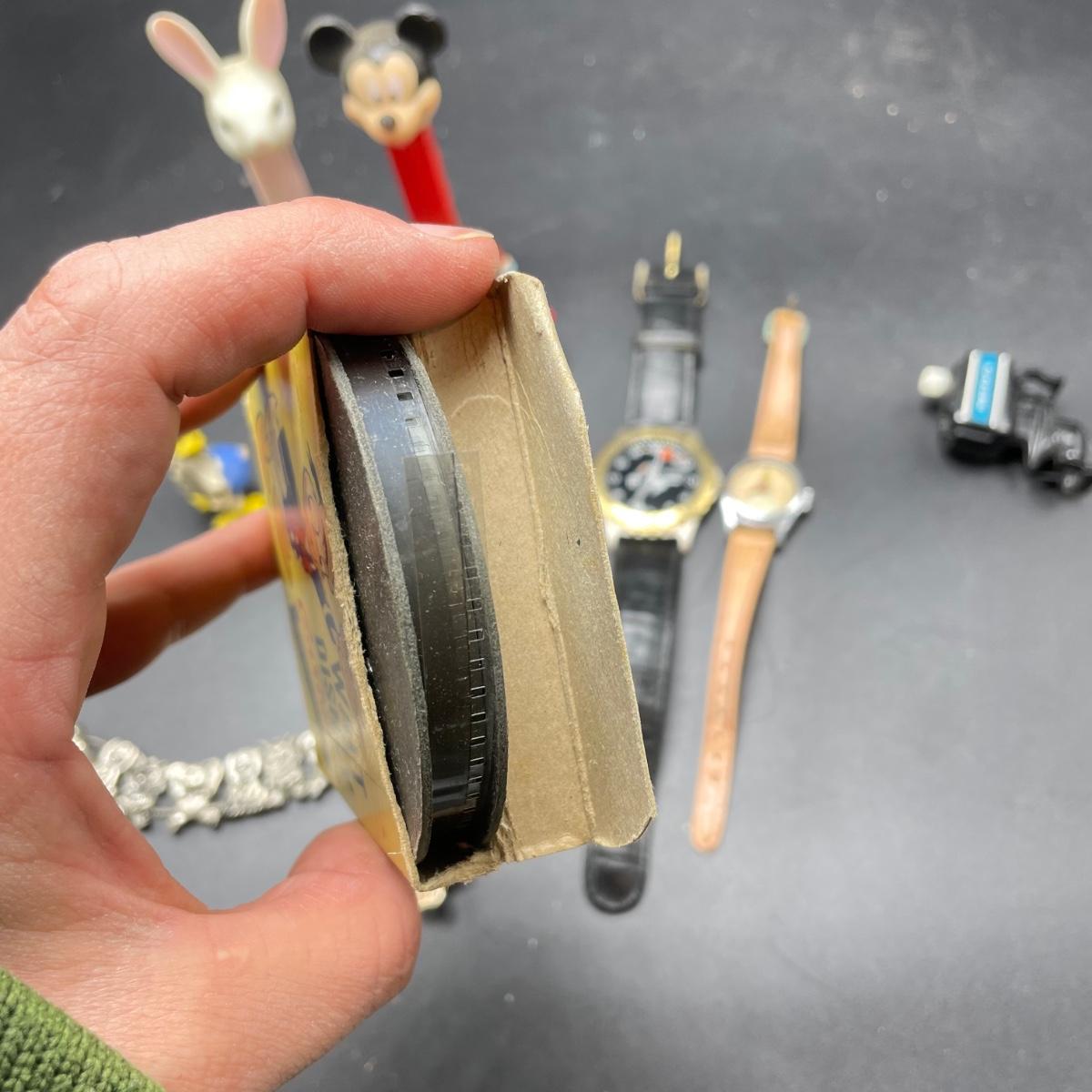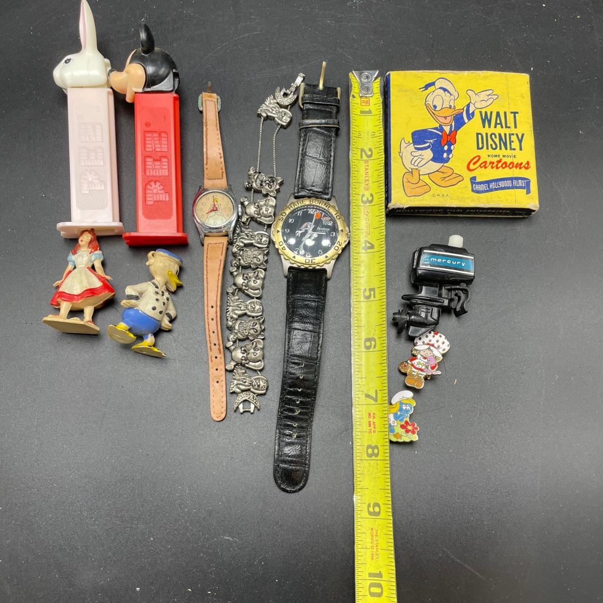 Classic Characters and more. Walt Disney Home Movie Cartoon reel with vintage Donald toy and Mickey Pez Dispenser. Lot features a Bugs Bunny and Cinderella watch, the Cinderella watch is missing it’s glass cover. A Strawberry ShortCake and Smurfette pin with an animal chain bracelet. Lot also includes another vintage character, a bunny Pez Dispenser and a working wind up boat engine. See images. Shipping available.