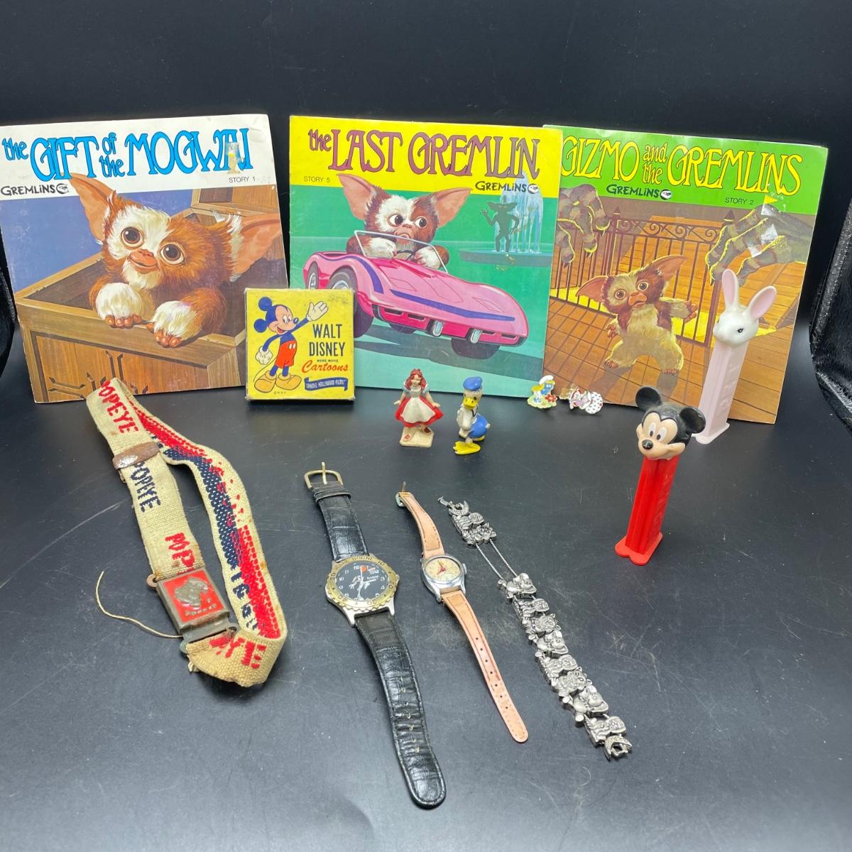Gremlin Vinyl/Books, Disney Reel, Popeye Belt, Vintage Pins/Toys (FR - SS)