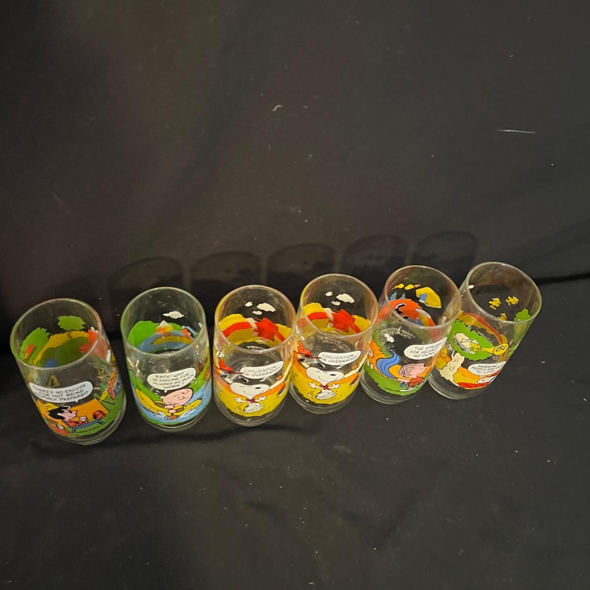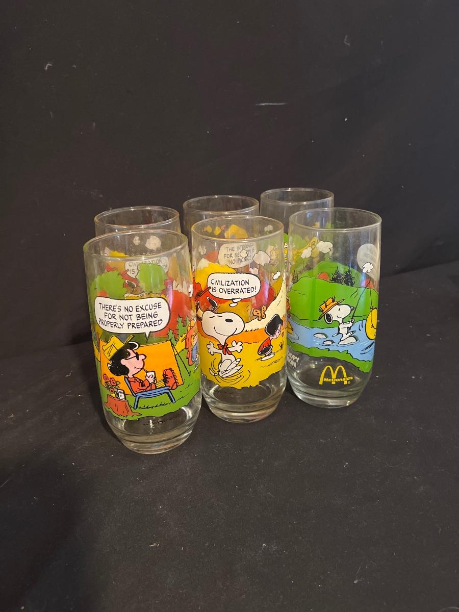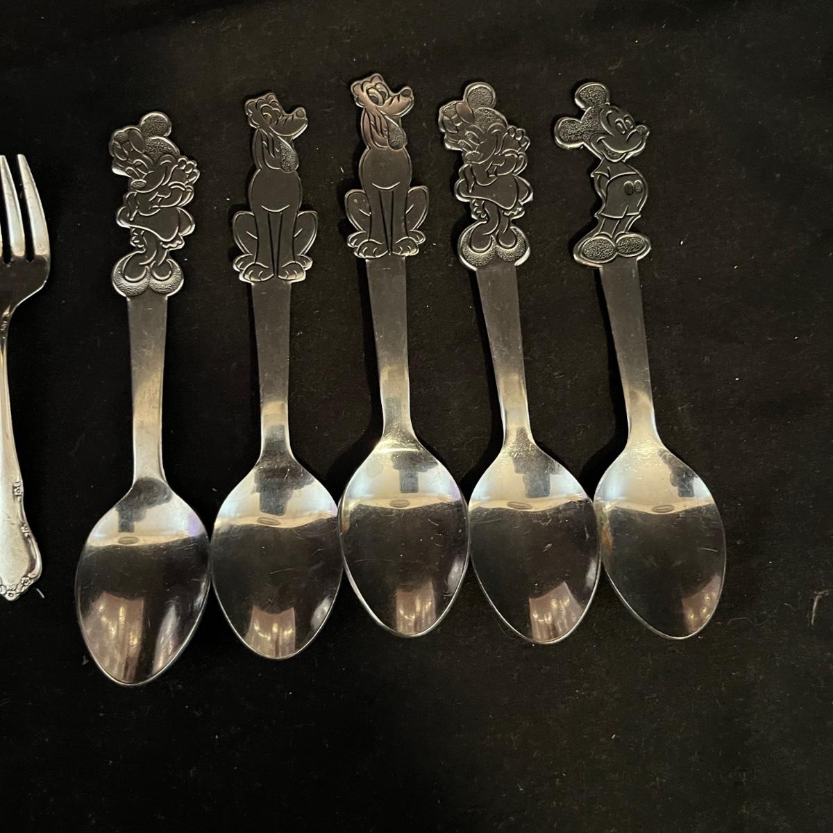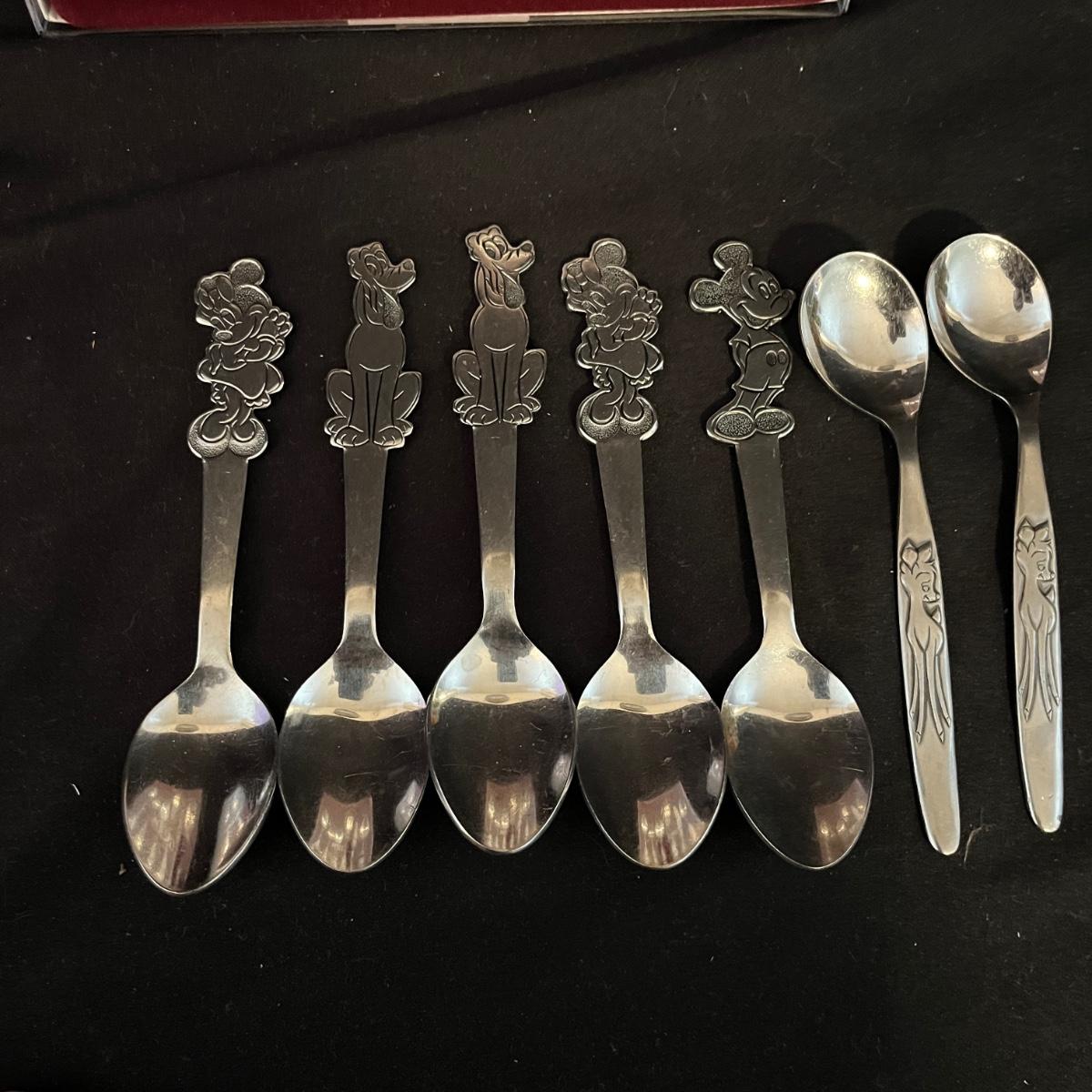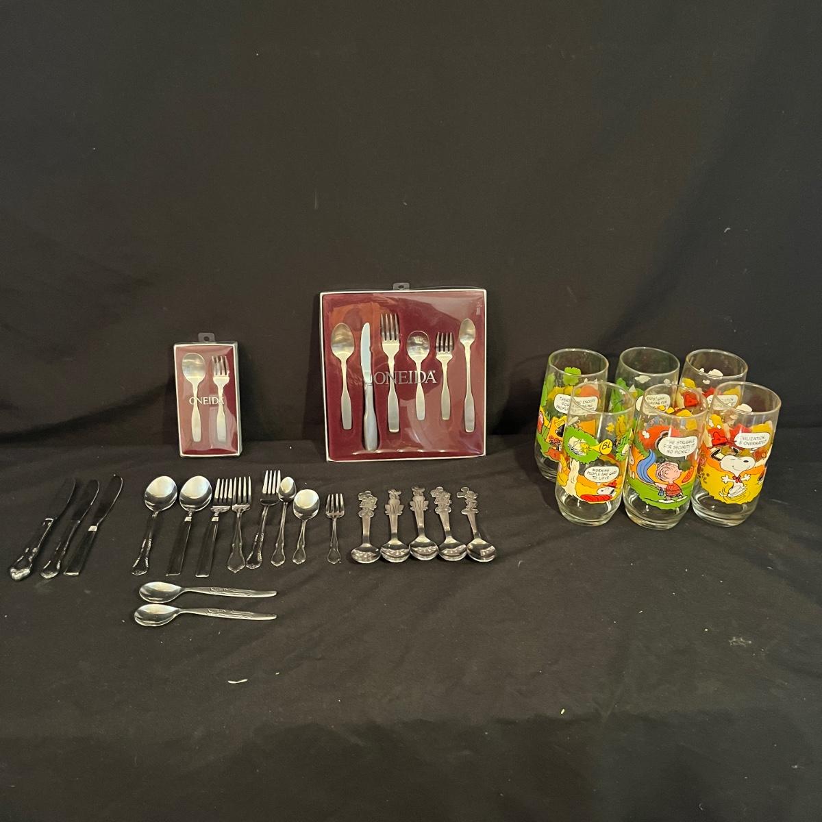 Lot includes six Peanuts glasses from McDonalds, seven Disney spoons, two packages of Oneida flatware and more spoons, forks and knives. Glasses measure 3”D x 6”H.