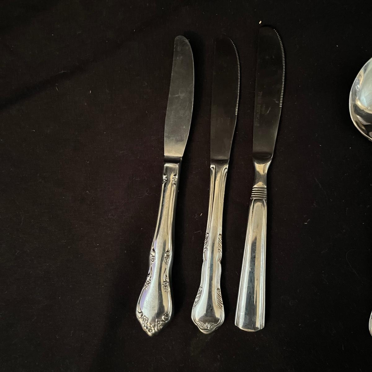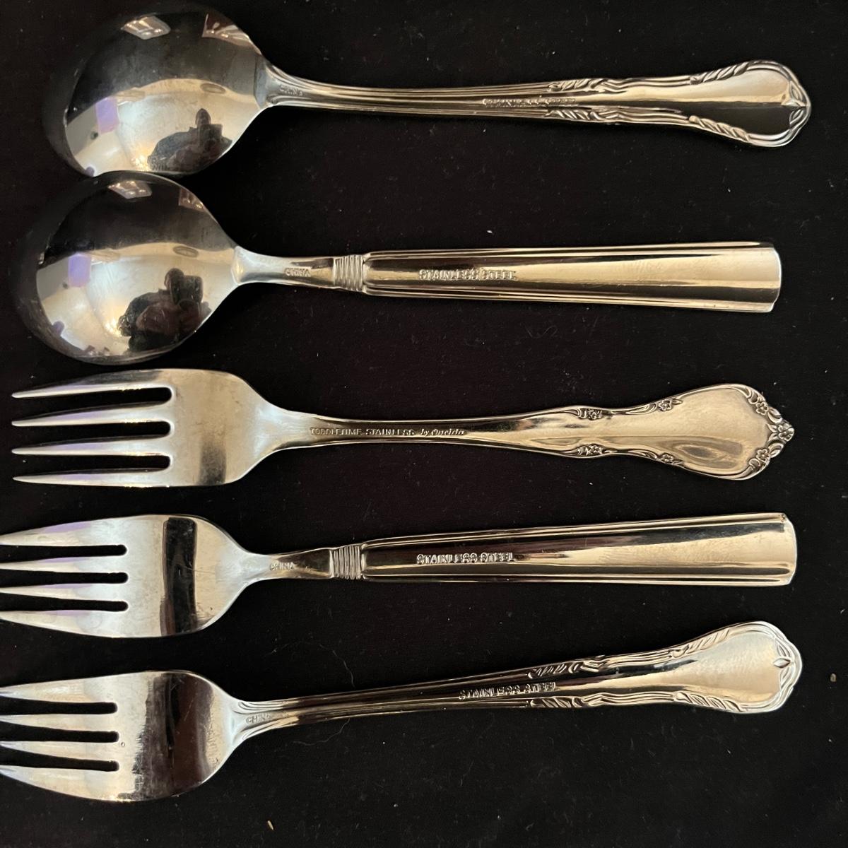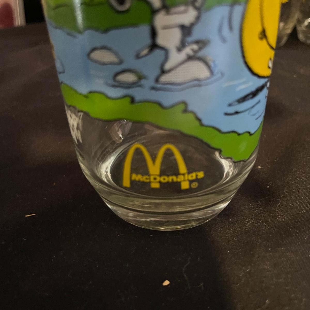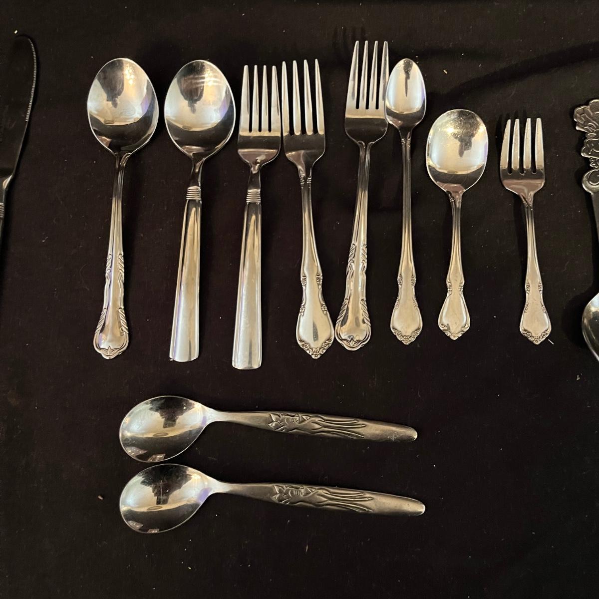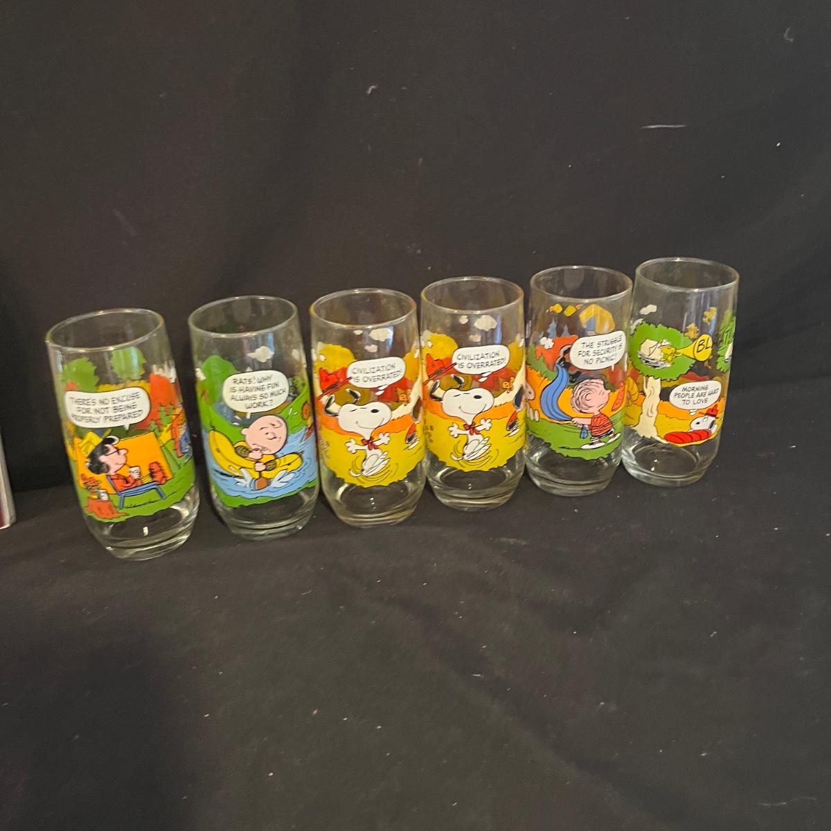 Lot includes six Peanuts glasses from McDonalds, seven Disney spoons, two packages of Oneida flatware and more spoons, forks and knives. Glasses measure 3”D x 6”H.