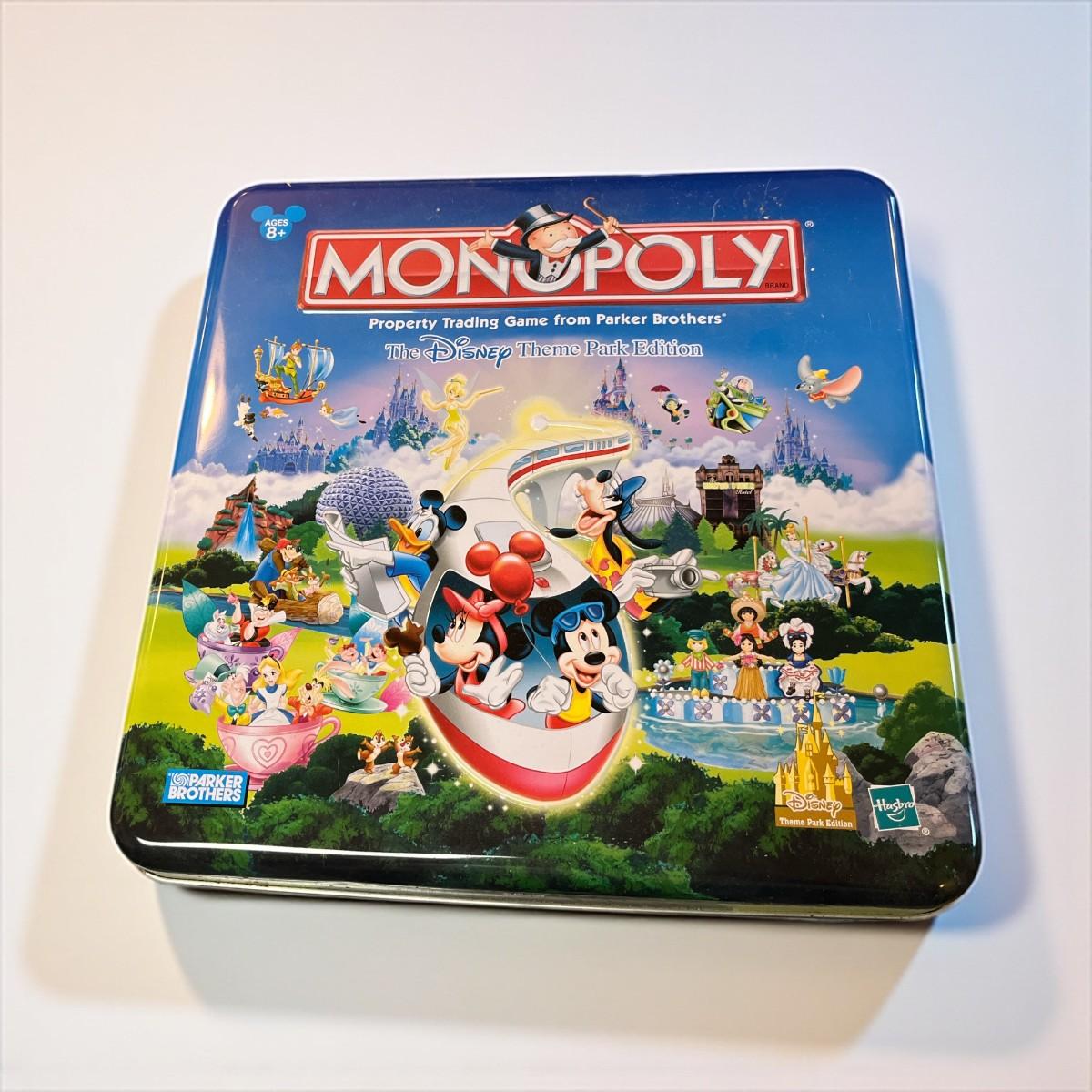Disney Theme Park Monopoly Game in Metal Tin. Missing Dice, Houses and Player pieces.