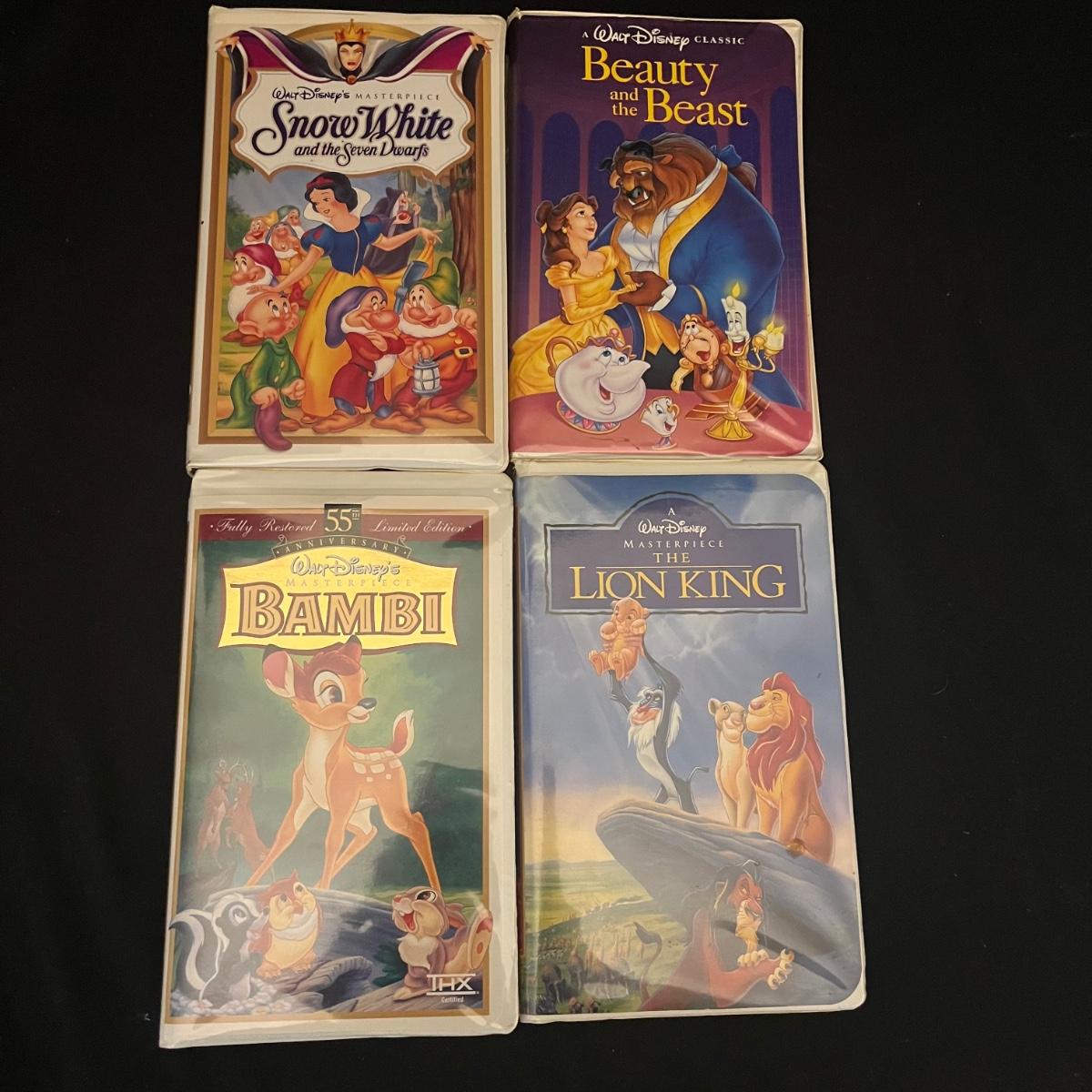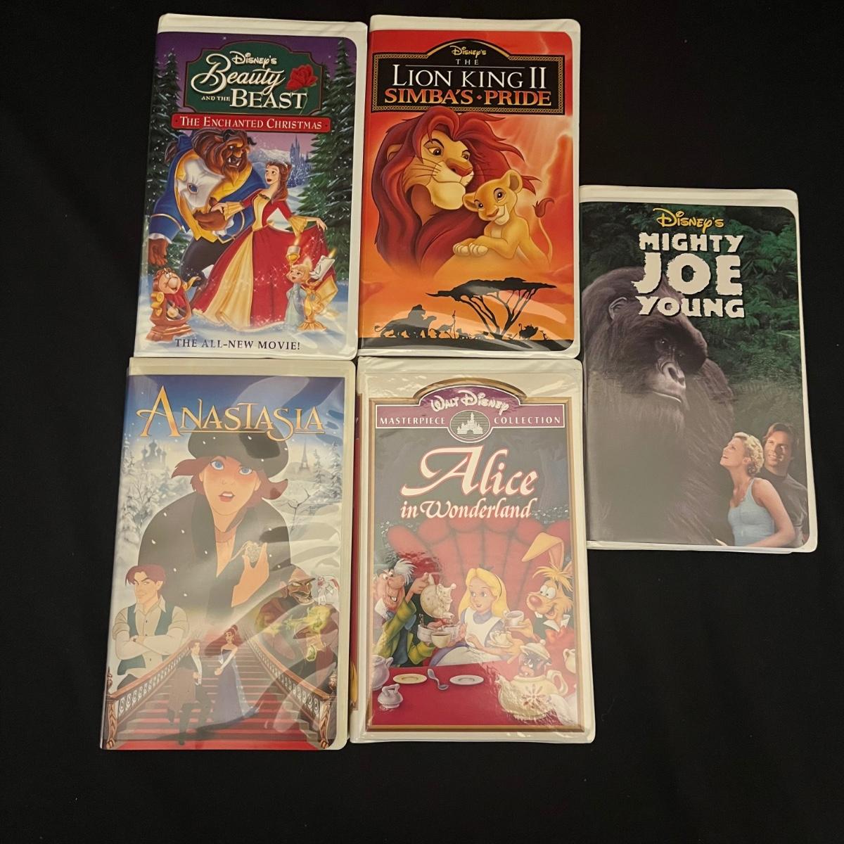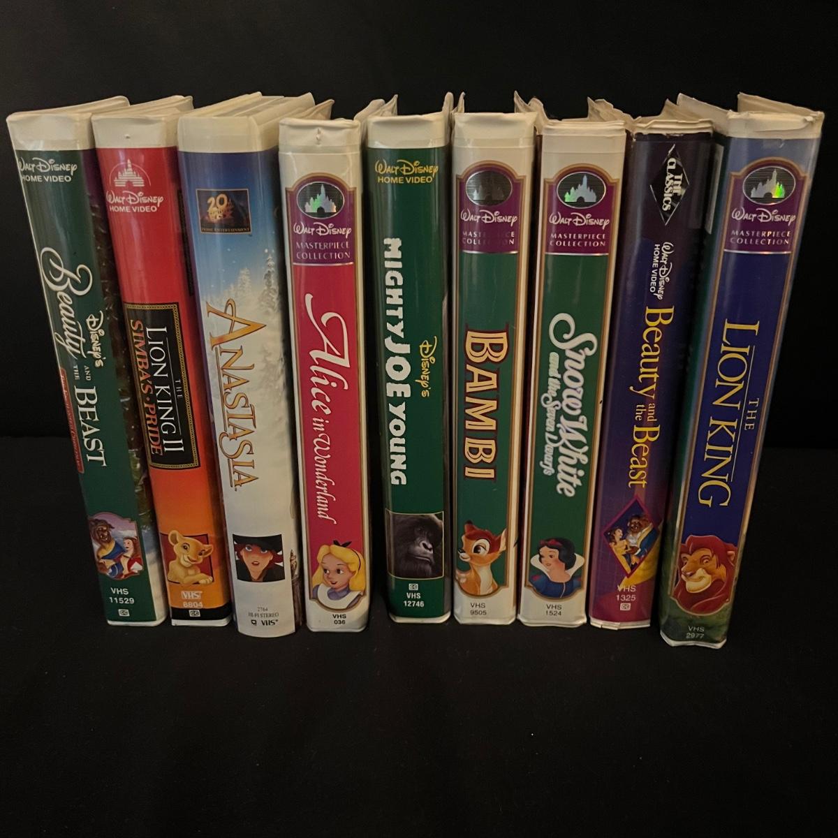 Lot contains nine Disney VHS movie including Bambi, Beauty and the Beast, Lion King, Lion King 2, Snow White, Alice in Wonderland, Anastasia, Beauty and the Beast The Enchanted Christmas and Mulan (in the wrong case of "Mighty Joe Young").
