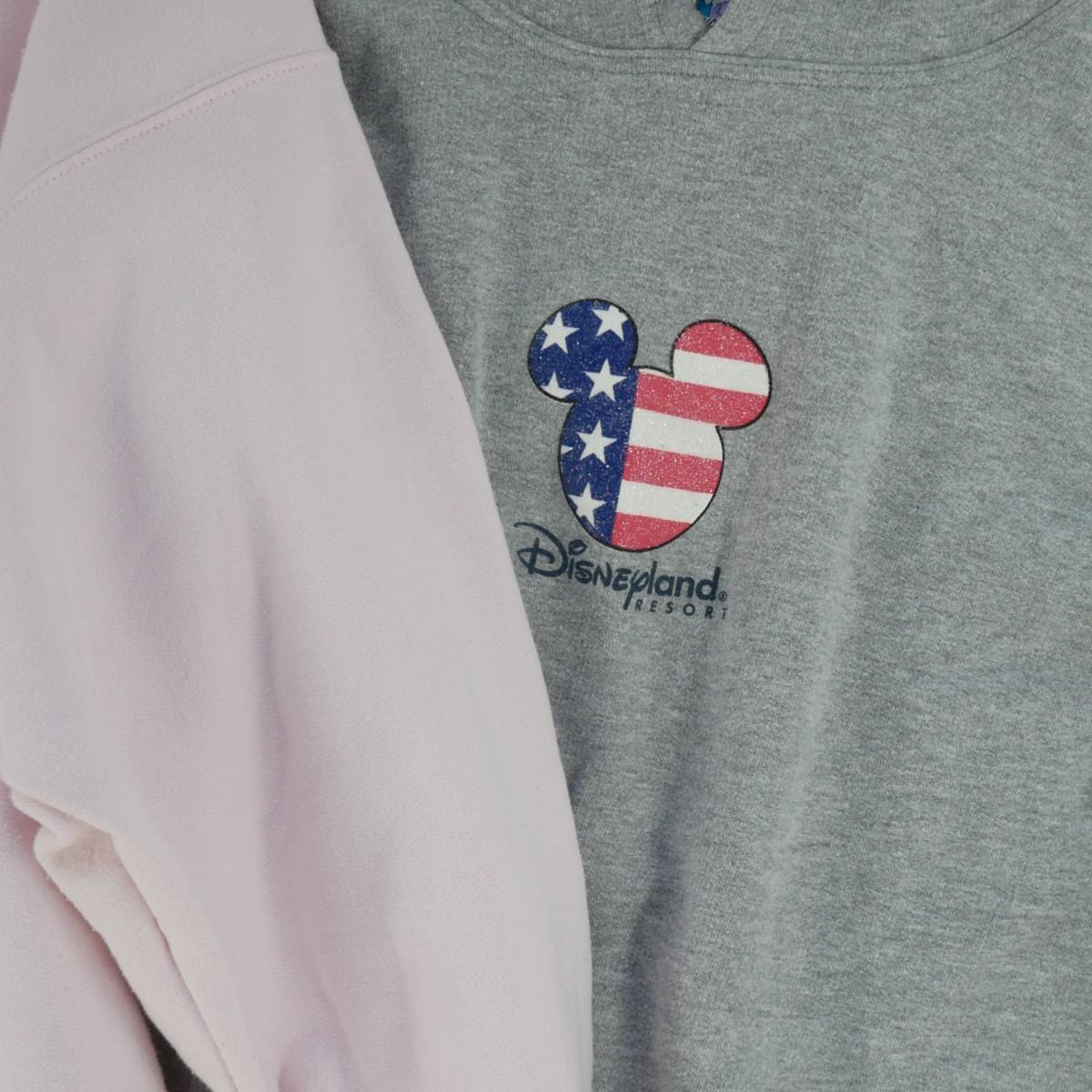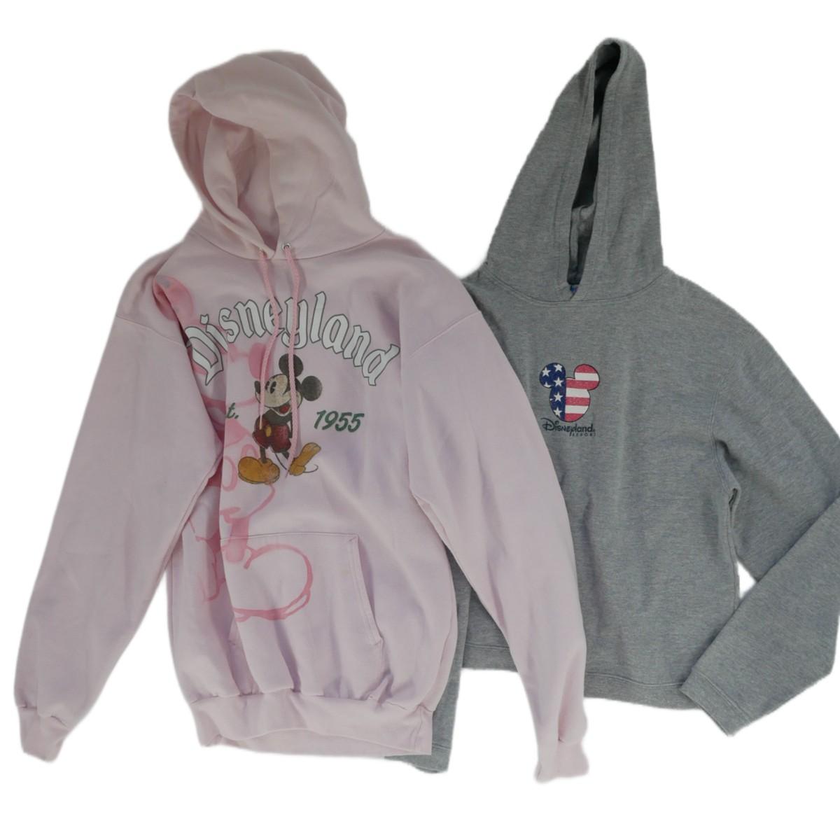 Two Disney Disneyland hoodies in size M. Pink hoodie has multiple stains and small tearing.