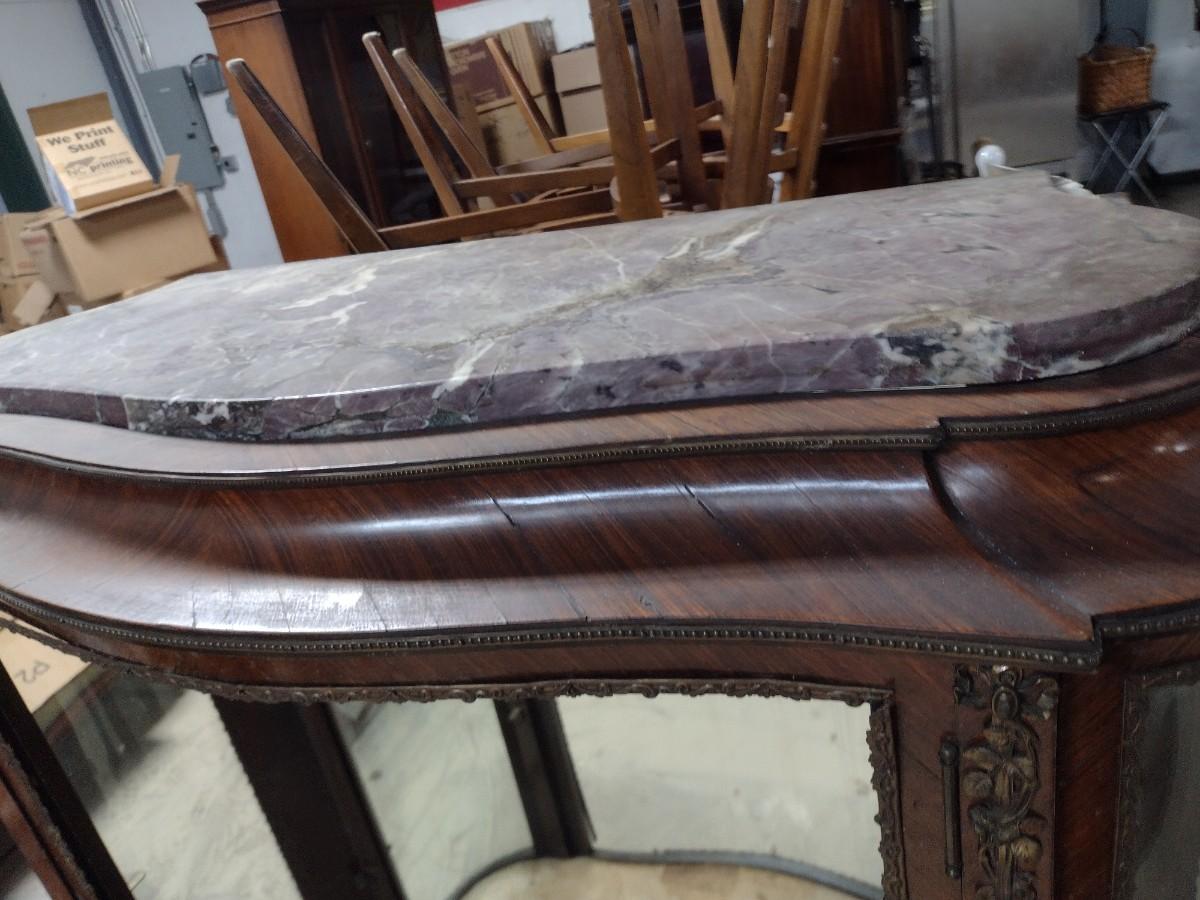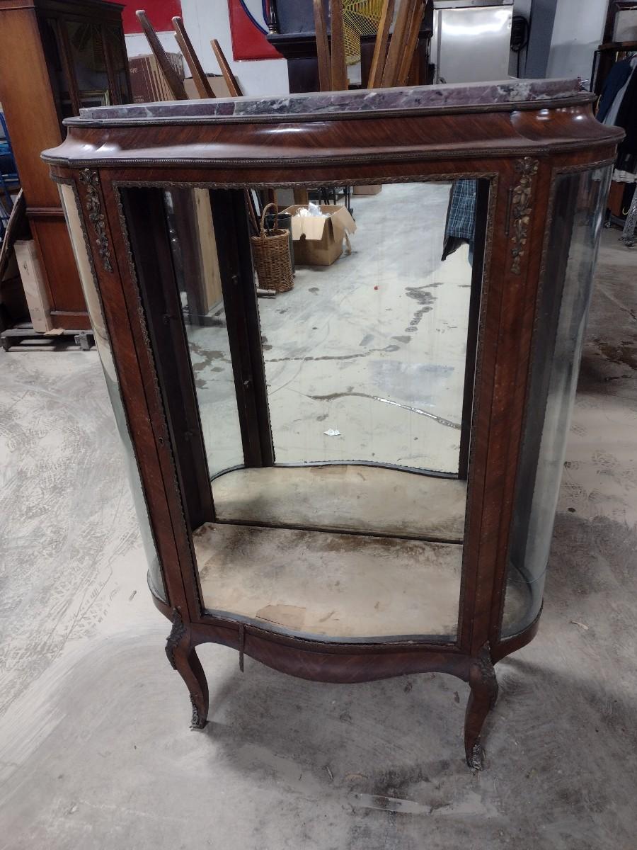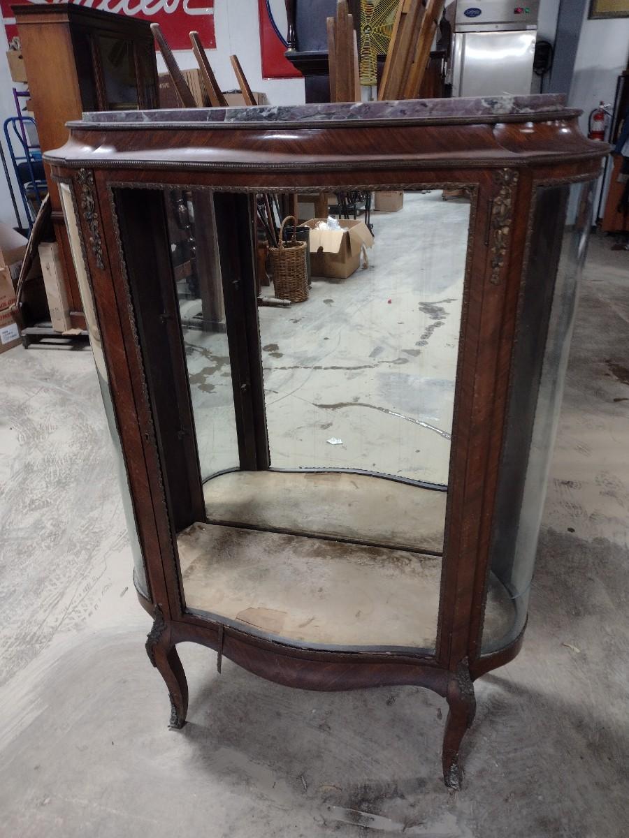 Vintage Mahogany Finish French Design Marble Top Curio Display Cabinet. Missing door, side glass is cracked, and some delamination of wood finish.
