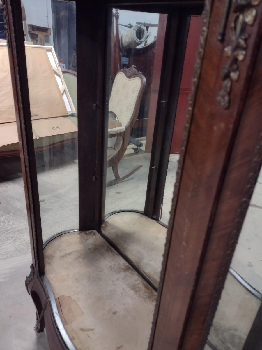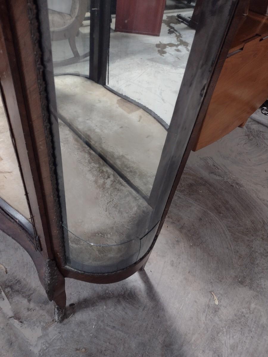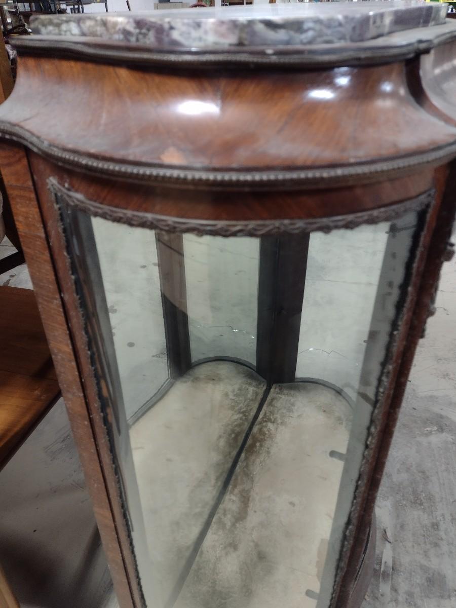 Vintage Mahogany Finish French Design Marble Top Curio Display Cabinet. Missing door, side glass is cracked, and some delamination of wood finish.