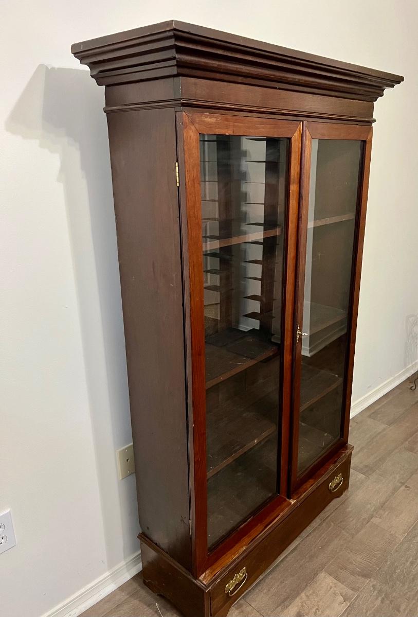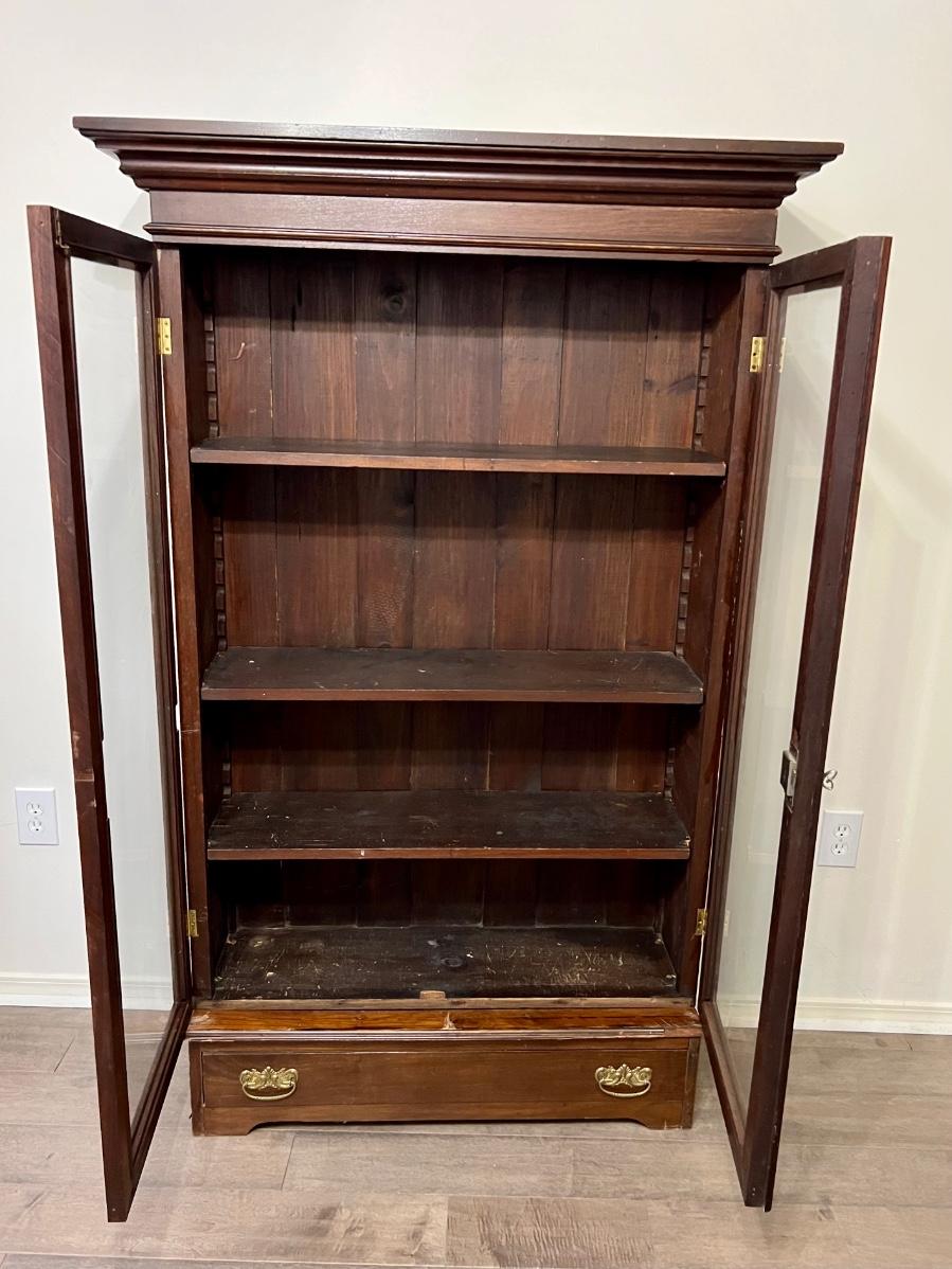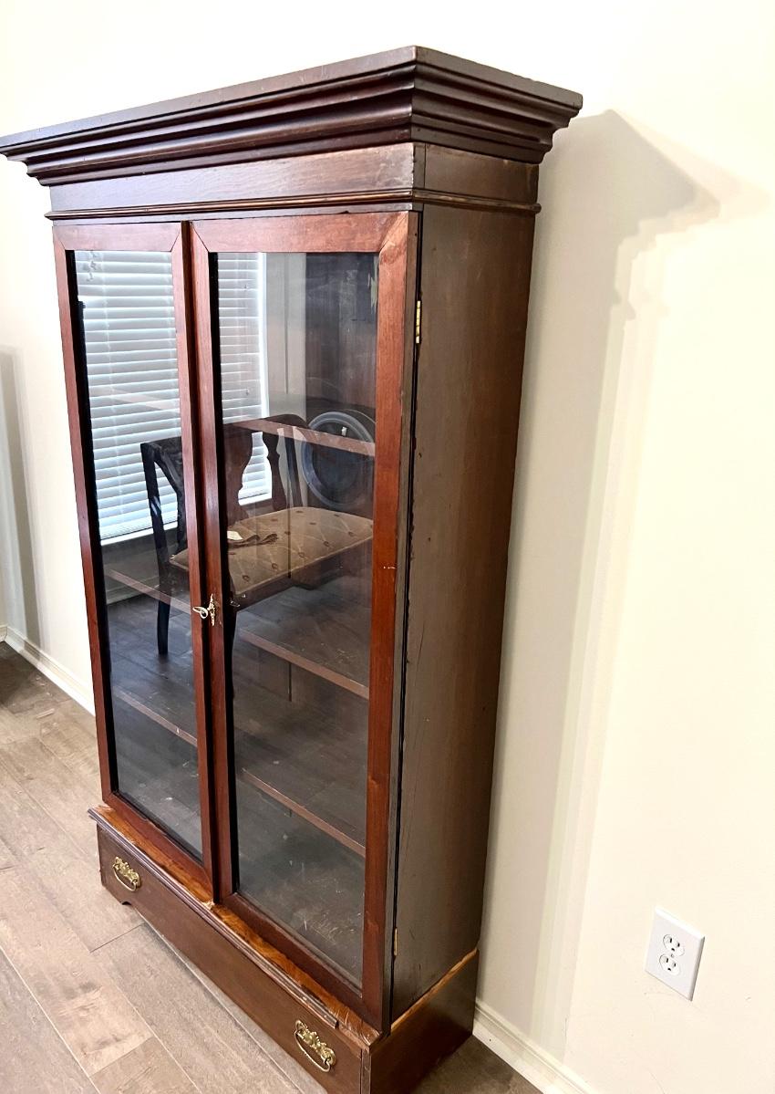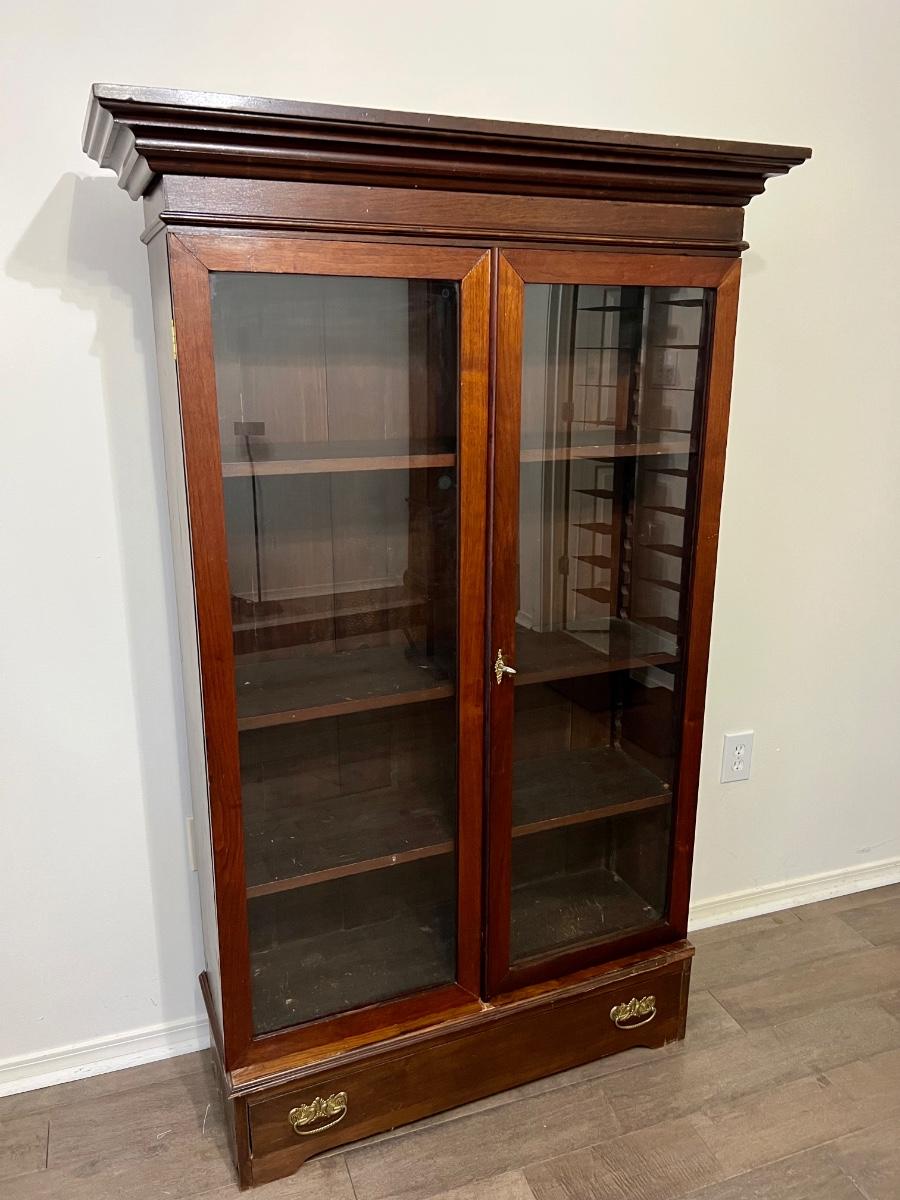 Display cabinet is possibly hand made. Has a key to lock but has been well loved, showing scratches and use. Could be a project piece or use as is. Measures 64 inches tall, 40 inches wide and 14 inches deep