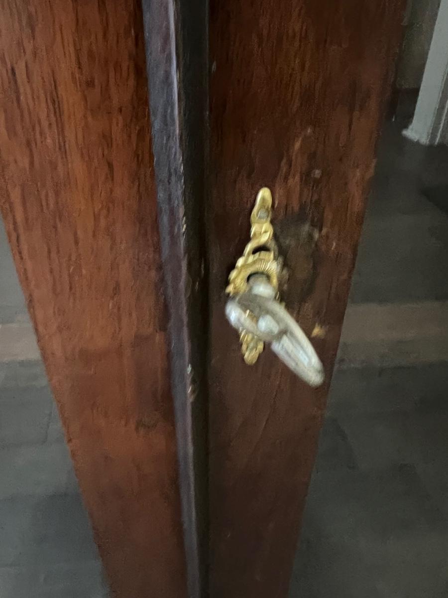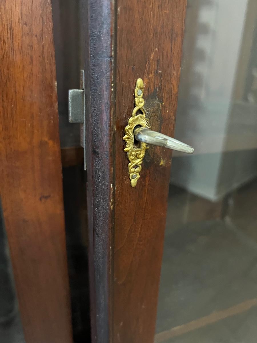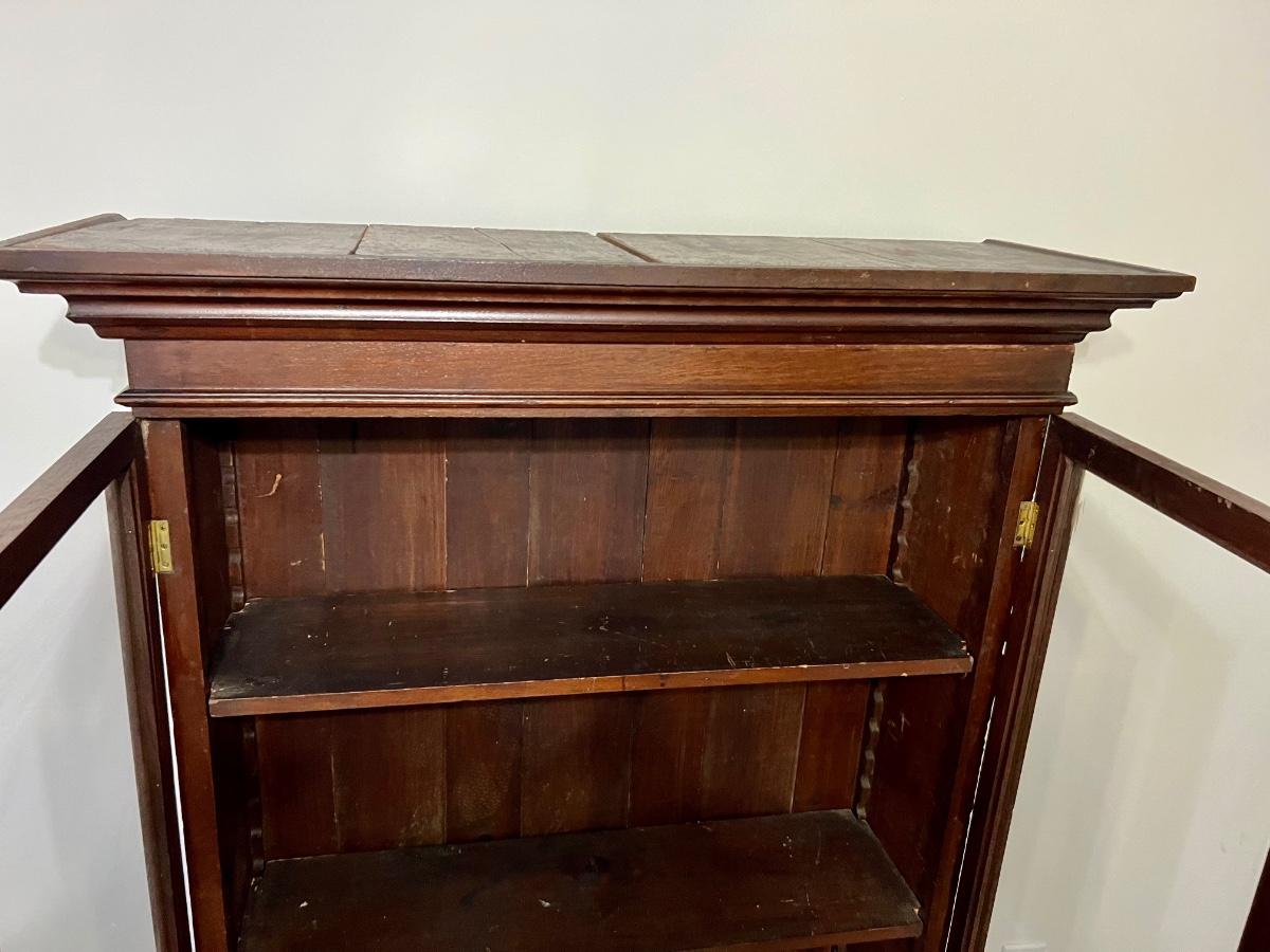 Display cabinet is possibly hand made. Has a key to lock but has been well loved, showing scratches and use. Could be a project piece or use as is. Measures 64 inches tall, 40 inches wide and 14 inches deep