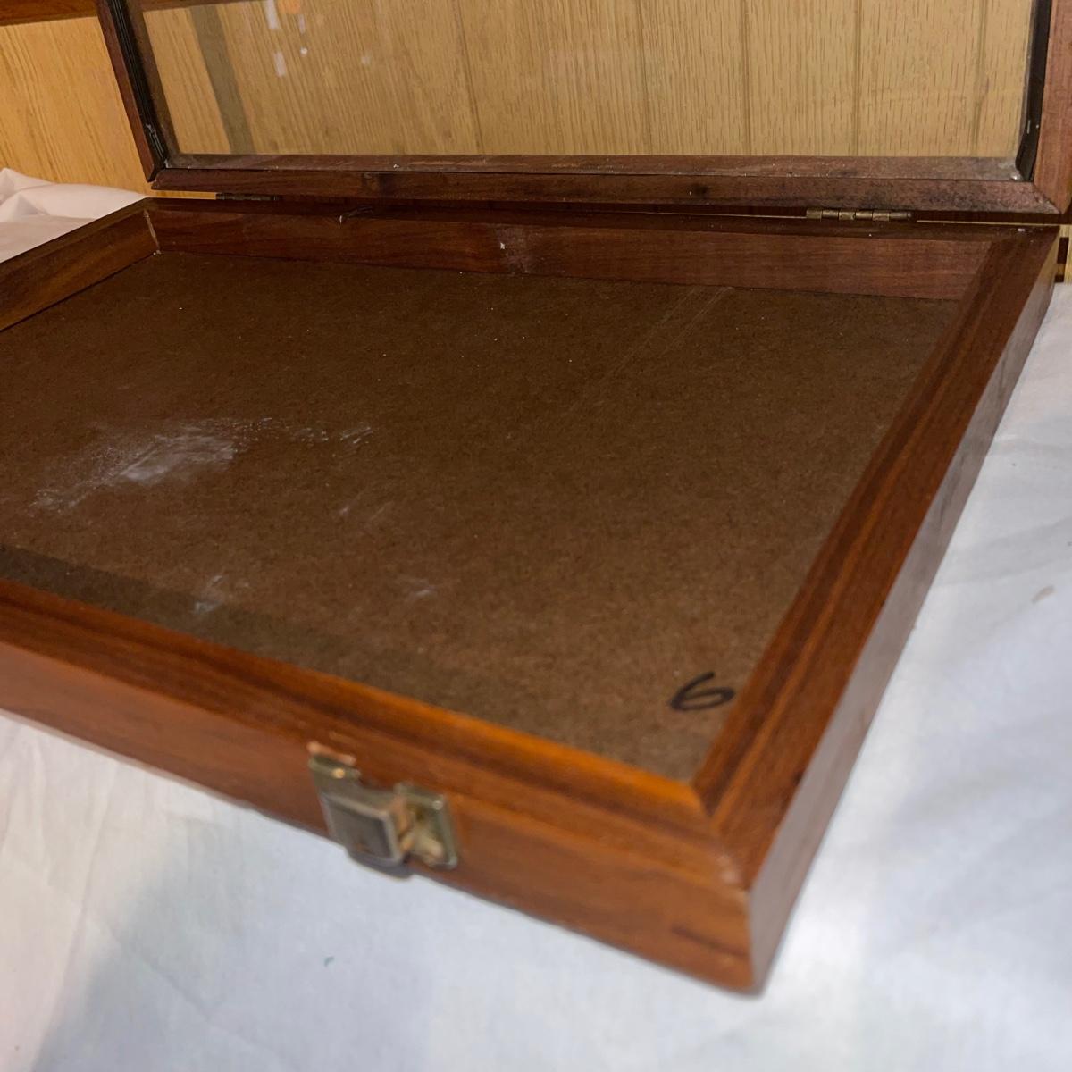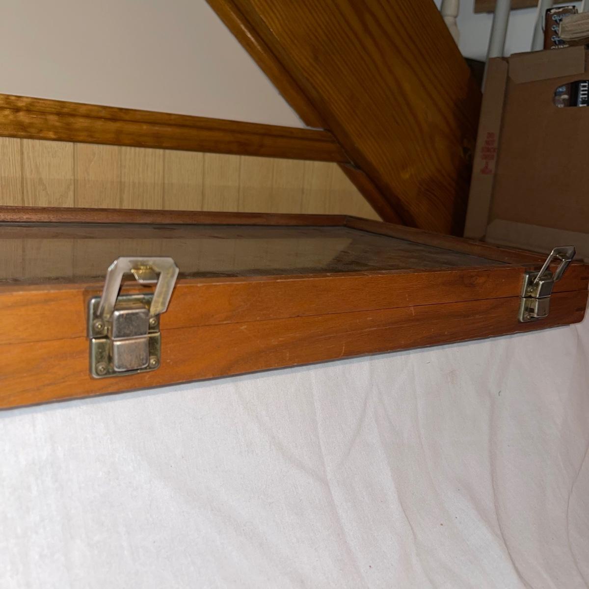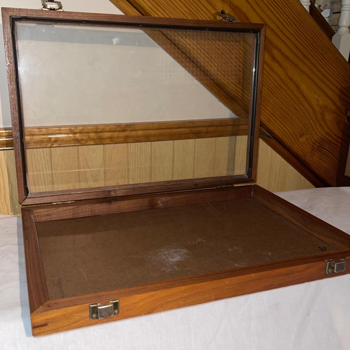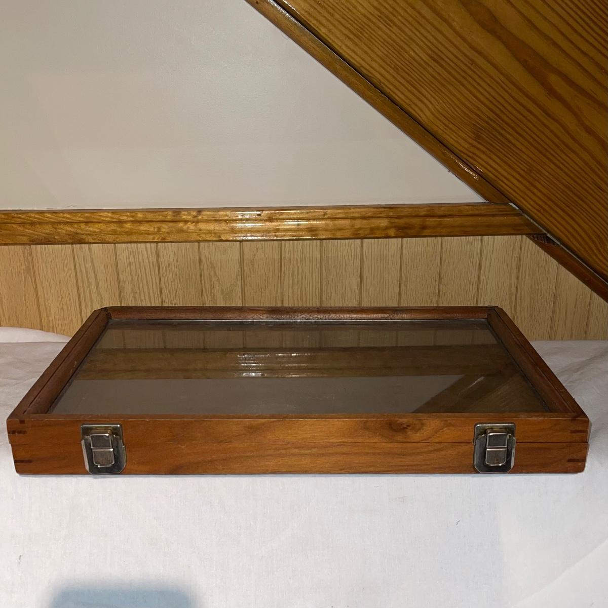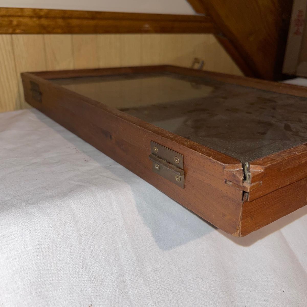 A small display case with a glass lid and an old desk drawer. The display case measures 12” wide x 18.25” long and 2” tall with the lid closed. The Hamilton desk drawer is 16.5” wide x 32.5” long and 2” tall.