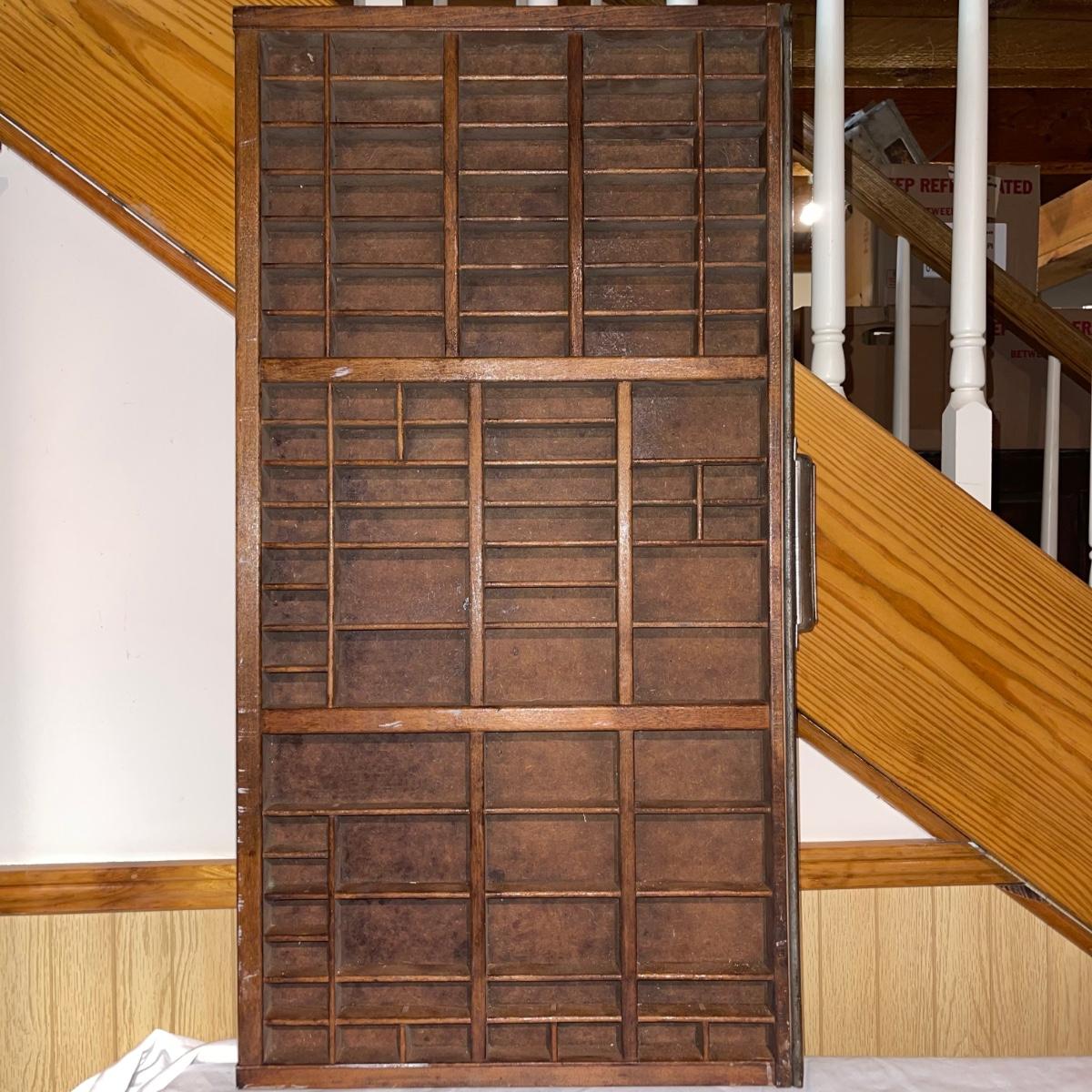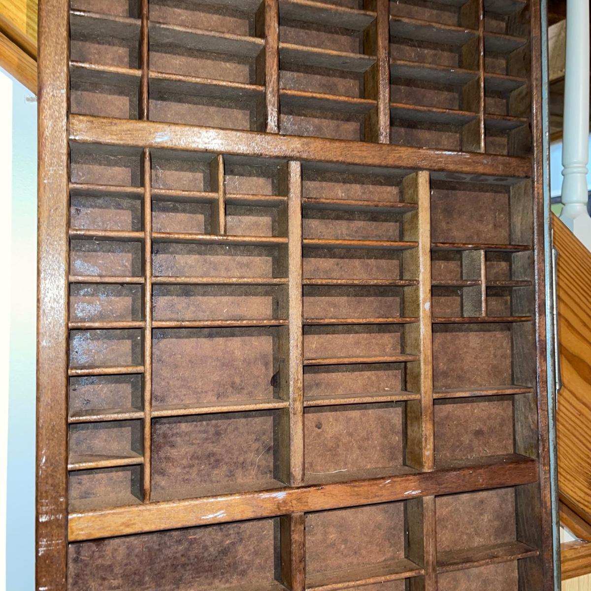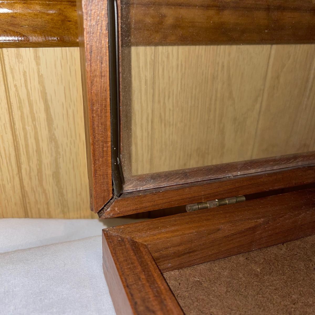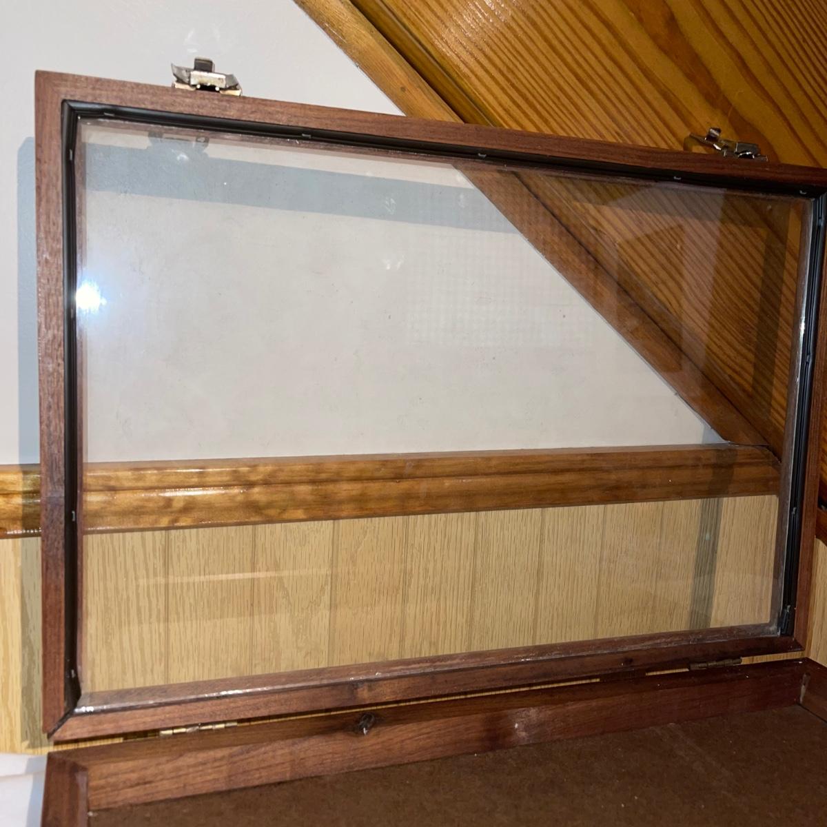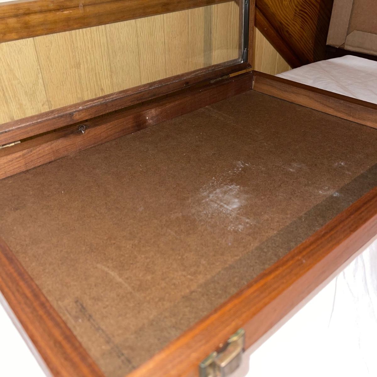 A small display case with a glass lid and an old desk drawer. The display case measures 12” wide x 18.25” long and 2” tall with the lid closed. The Hamilton desk drawer is 16.5” wide x 32.5” long and 2” tall.
