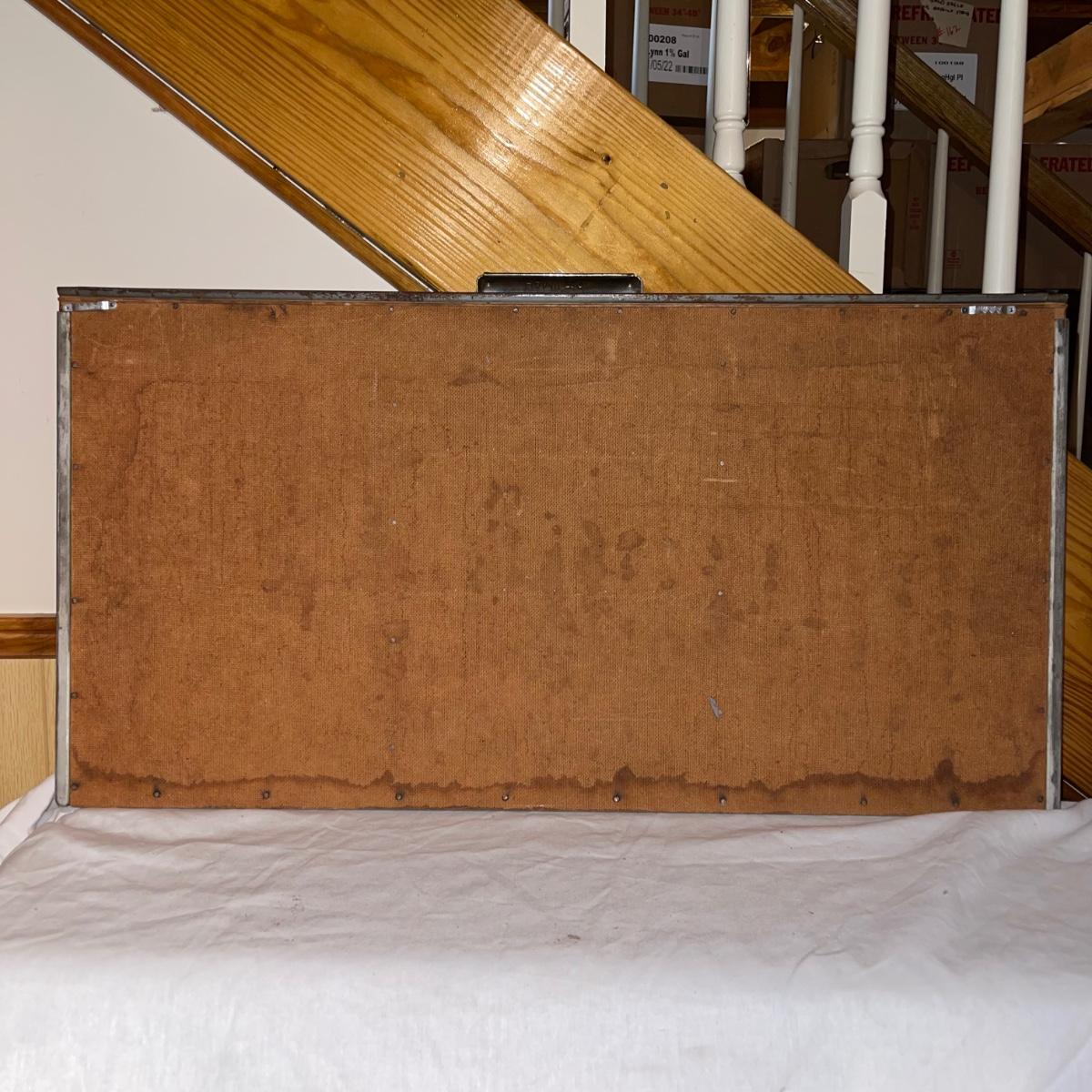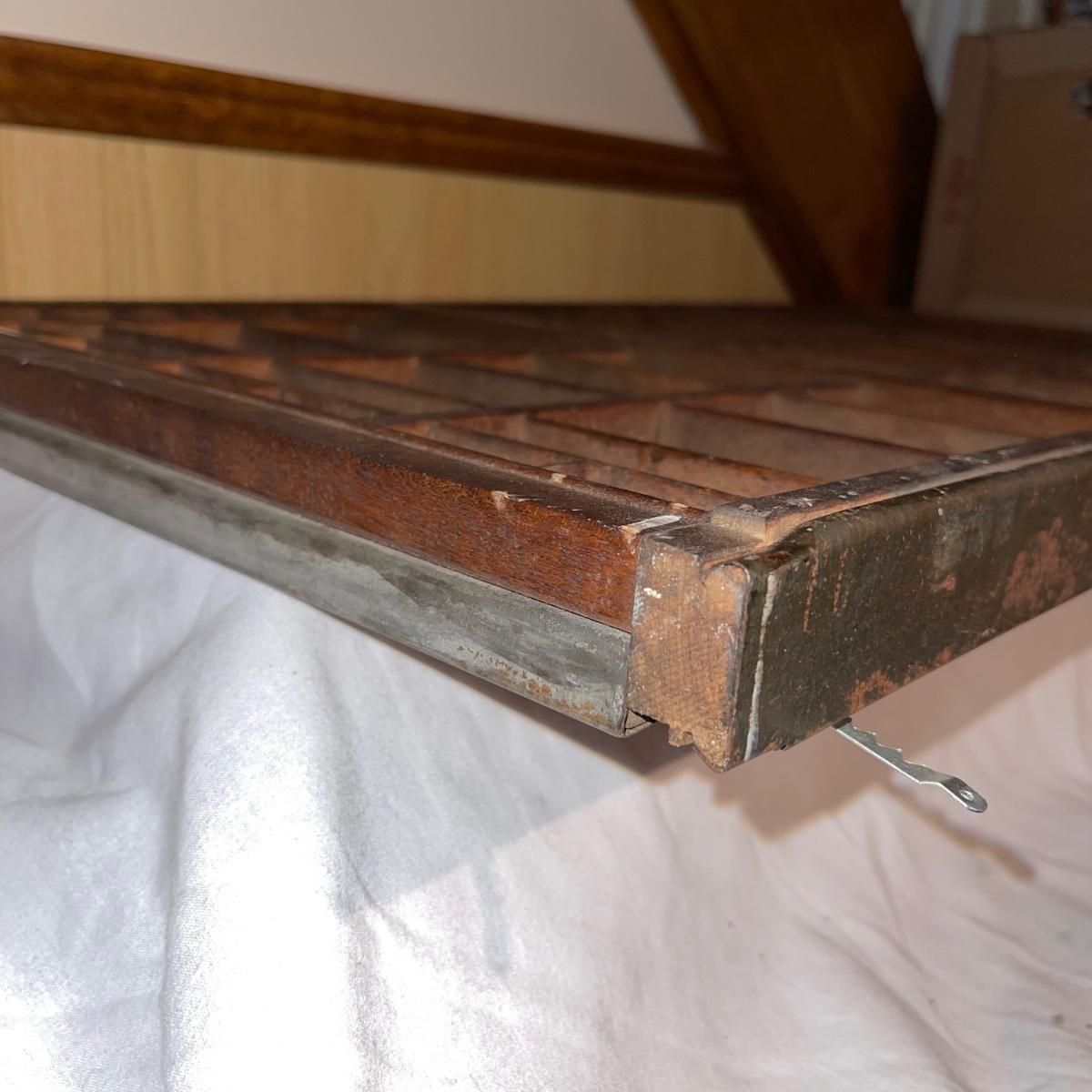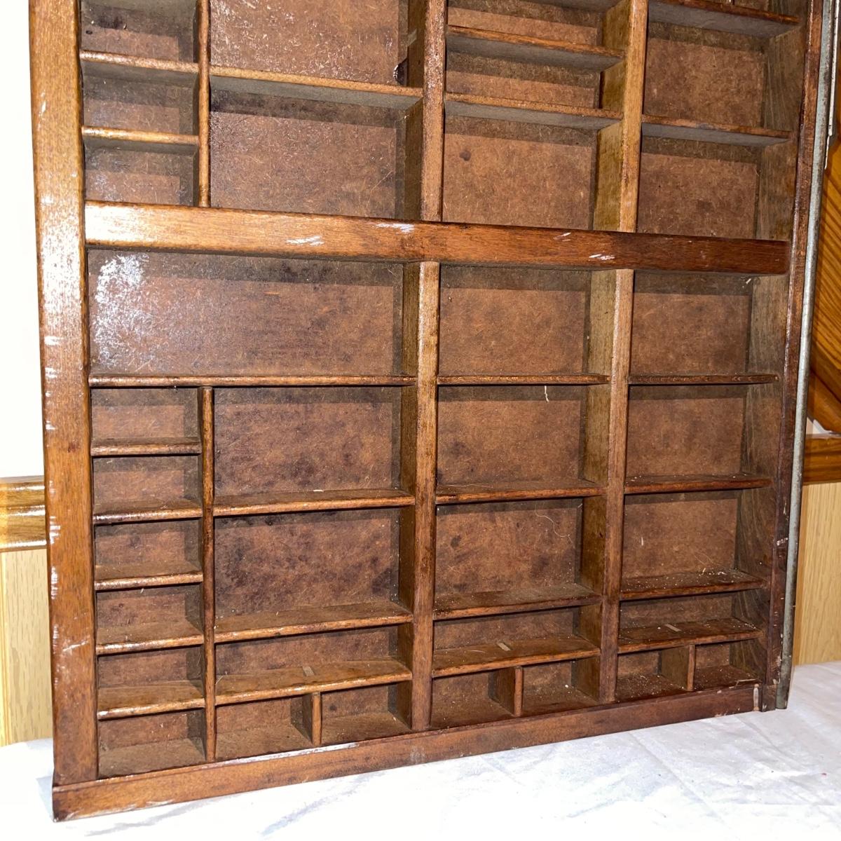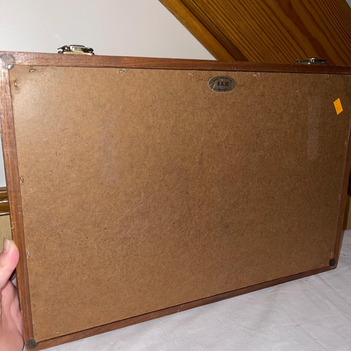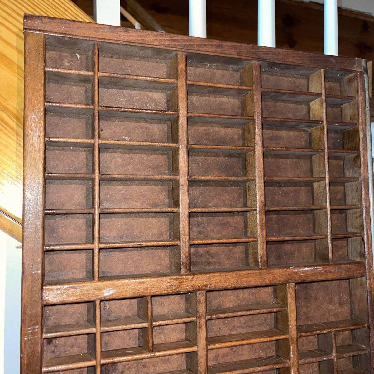 A small display case with a glass lid and an old desk drawer. The display case measures 12” wide x 18.25” long and 2” tall with the lid closed. The Hamilton desk drawer is 16.5” wide x 32.5” long and 2” tall.