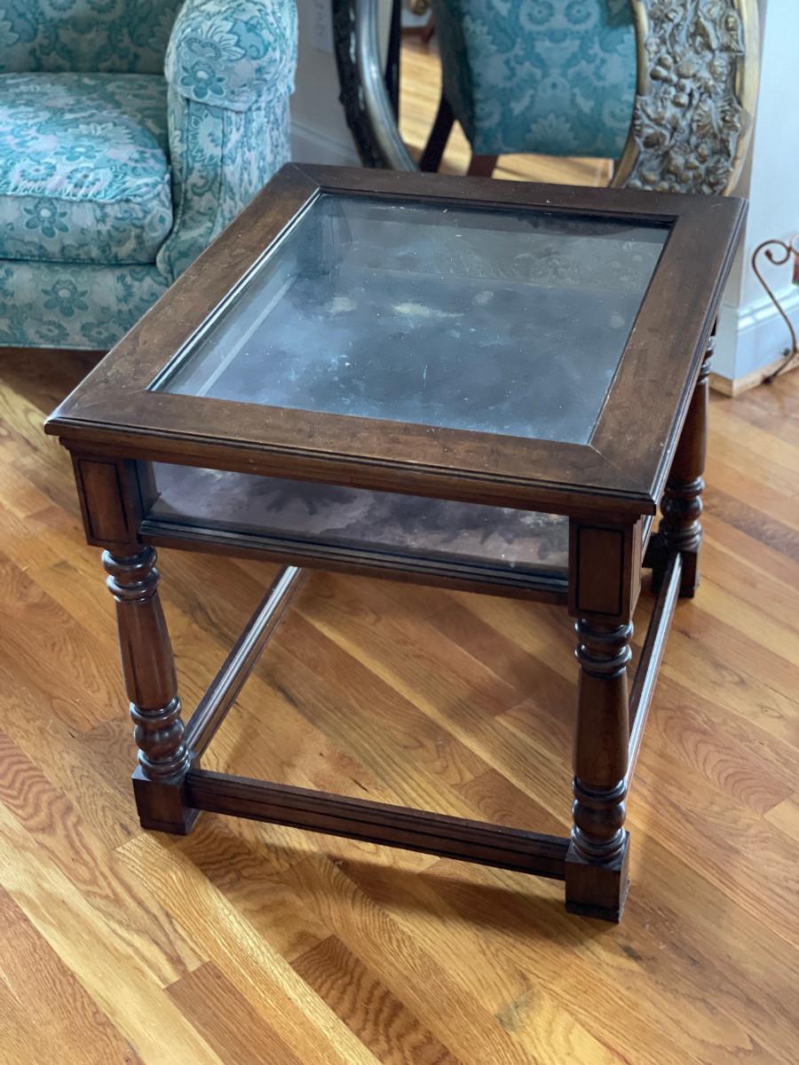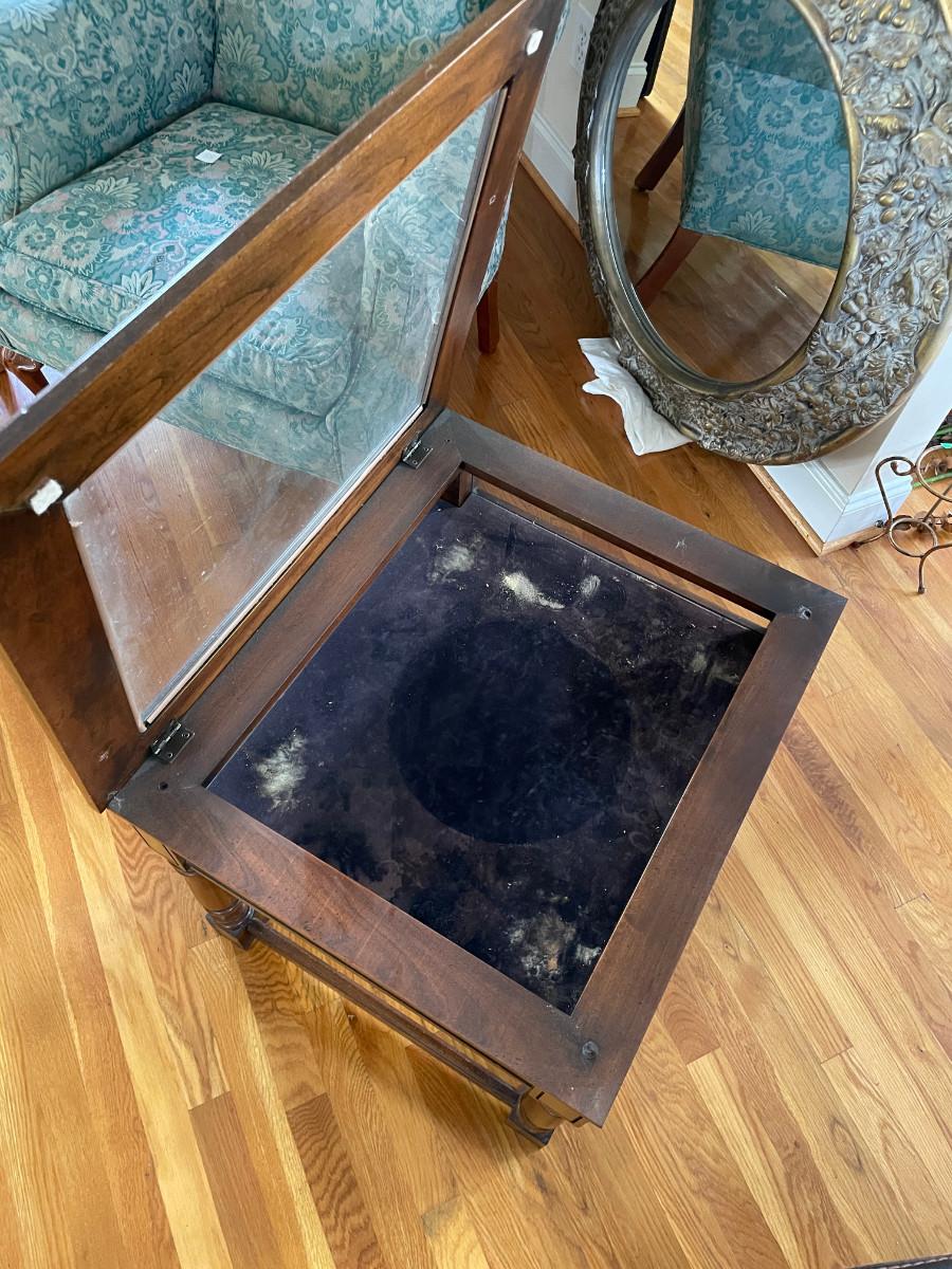 Top lifts up to showcase items inside. The bottom of case is felt lined. Inside needs cleaned. Approximately 25.5” by 22.5” and 21.25” tall.