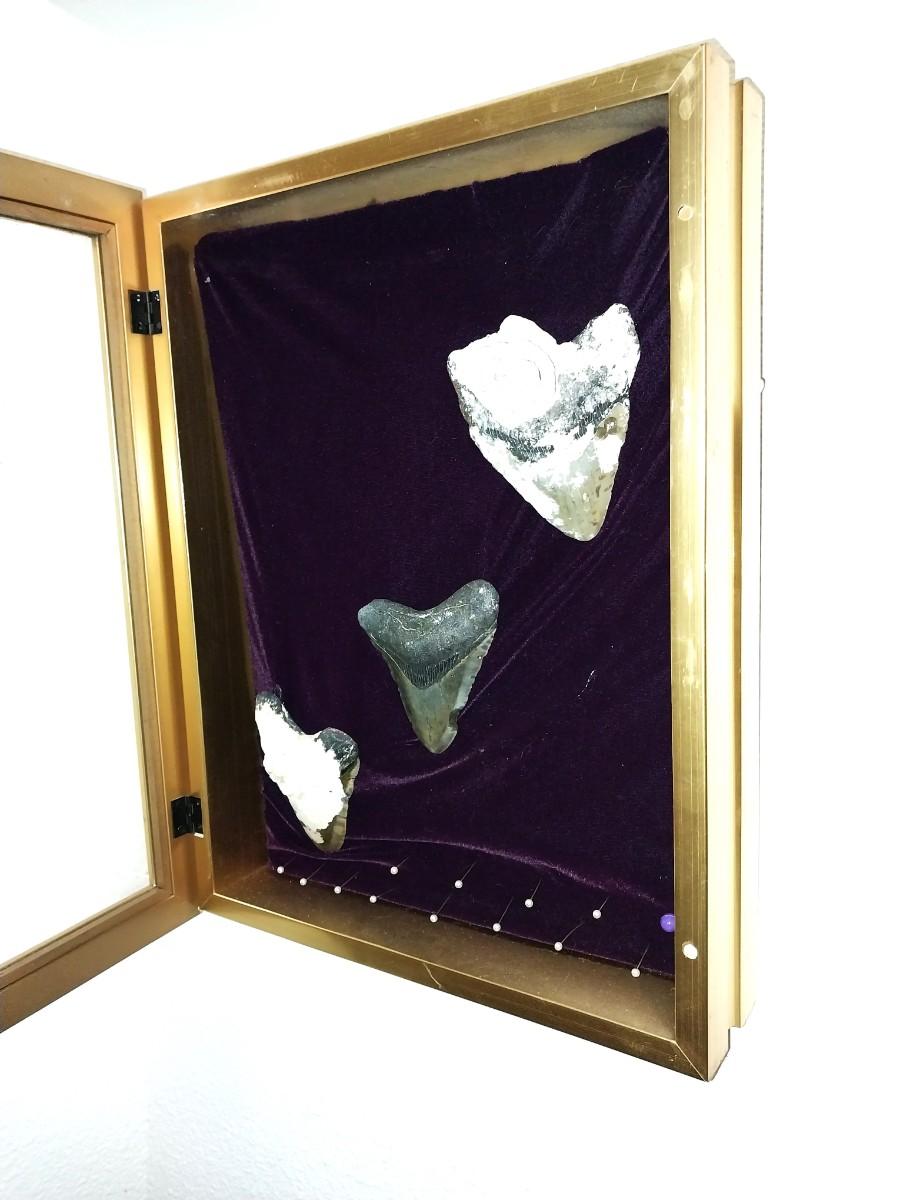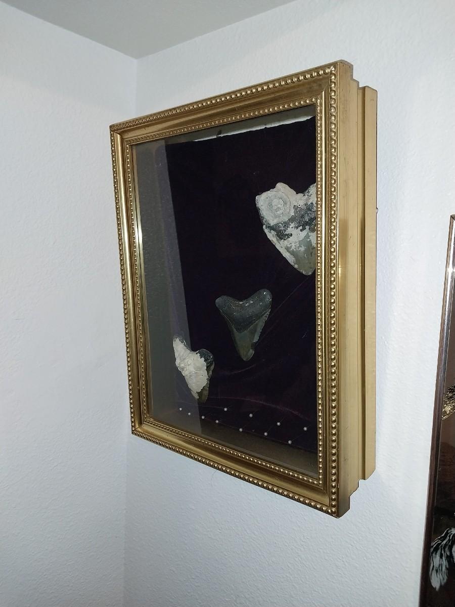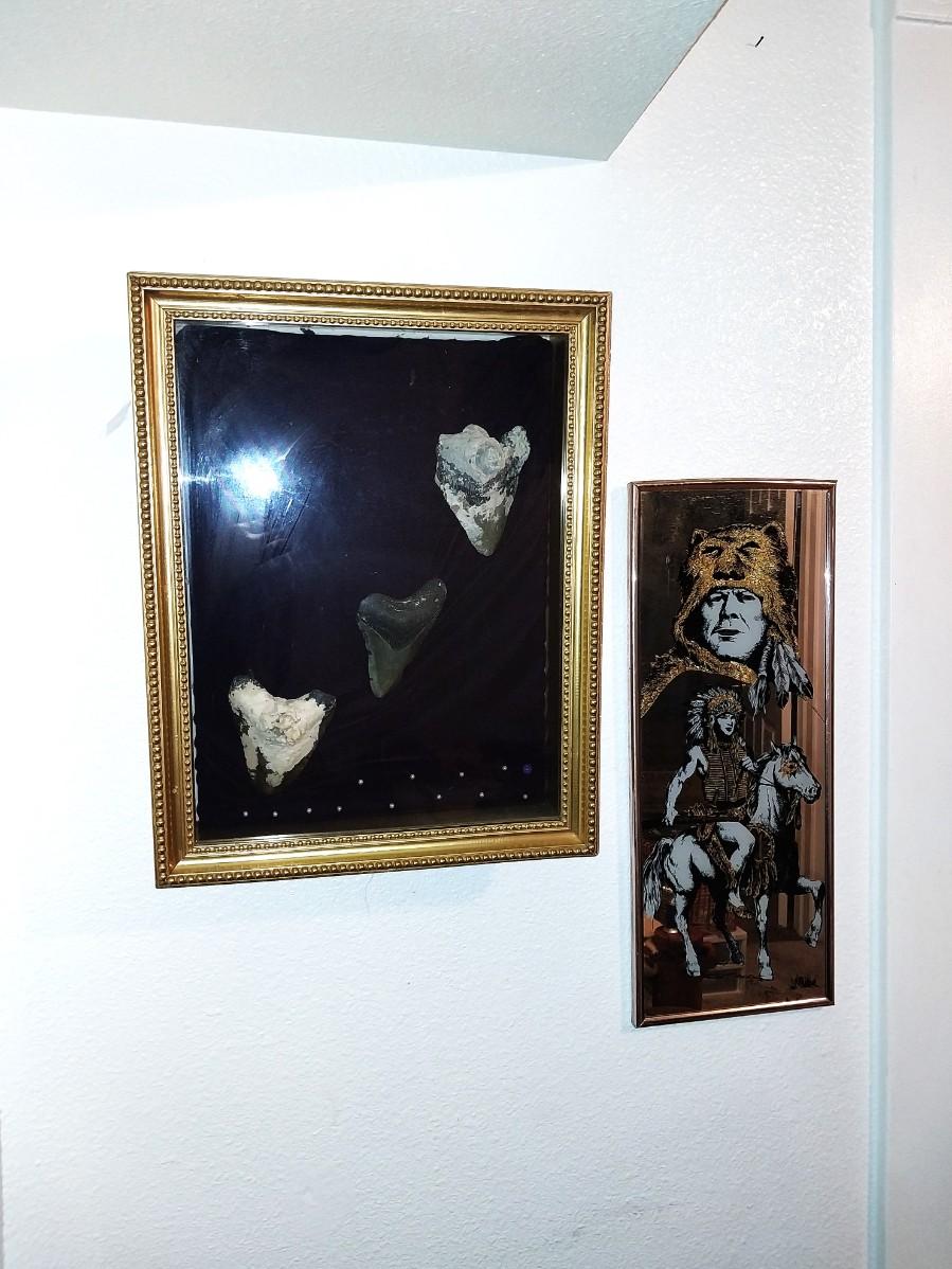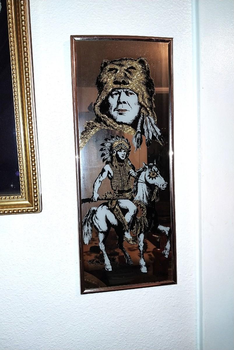 DISPLAY CASE WITH FOSSIL ARROW HEADS AND GOLD TONEMIRROR WITH NATIVE AMERICAN THEME