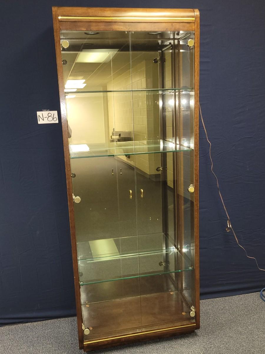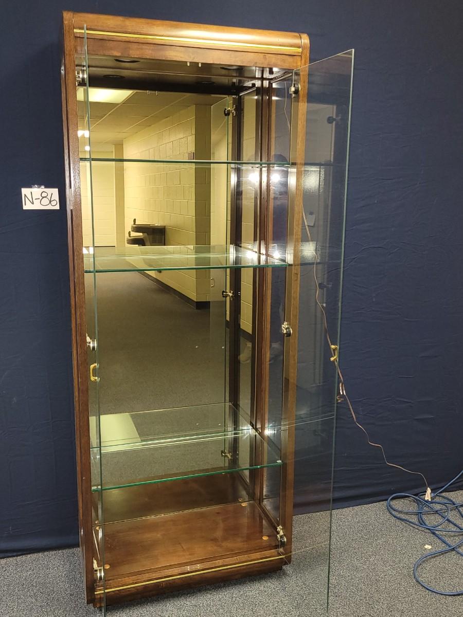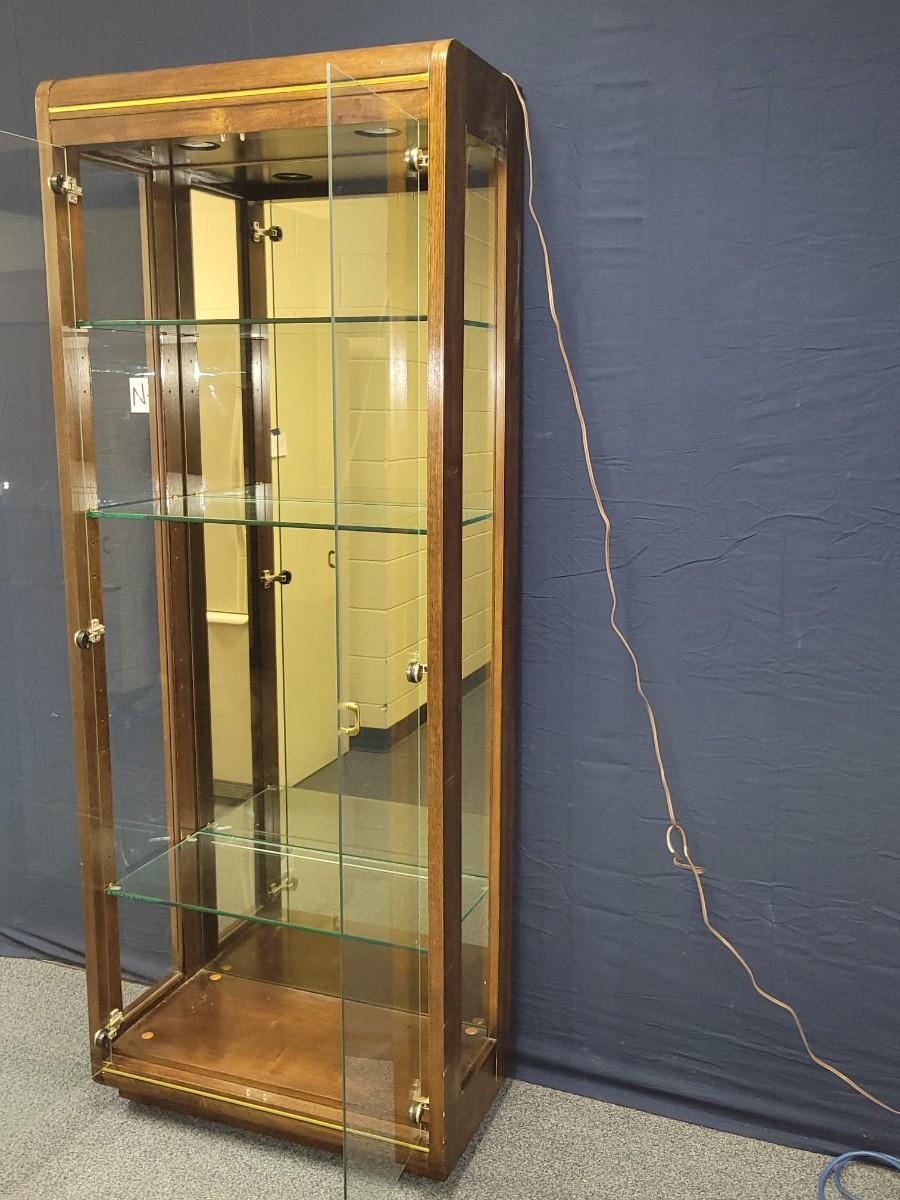 Has lights in top of case. Was used to display the porcelain dolls. This display case is solidly built. The shelves are adjustable. Lights do work - as shown in the picks. They operate on an adjustable dimming switch at the top of the inside of the cabinet. This is a VERY nice display case. Solid wood construction. Glass doors on front, glass inserts on sides, and mirrored back. This will come with an extra glass shelf (not shown).