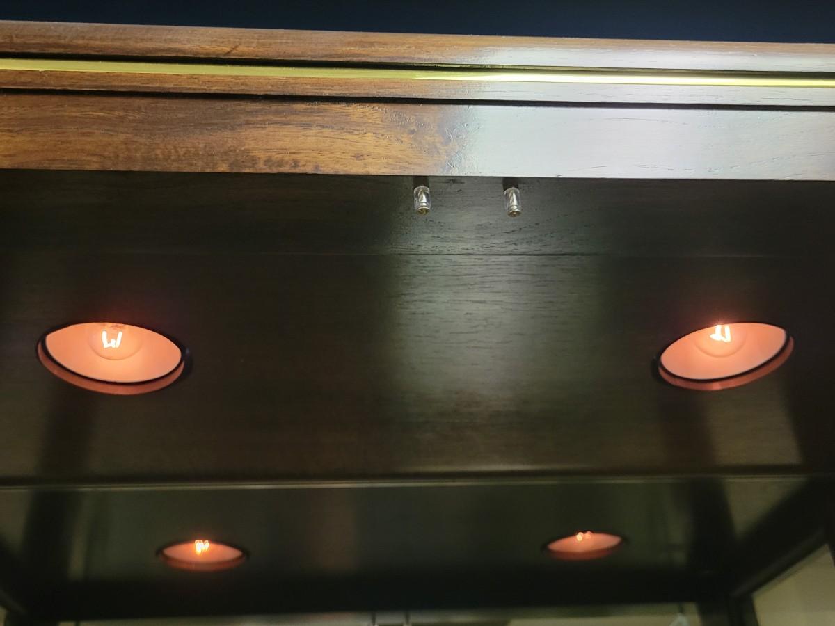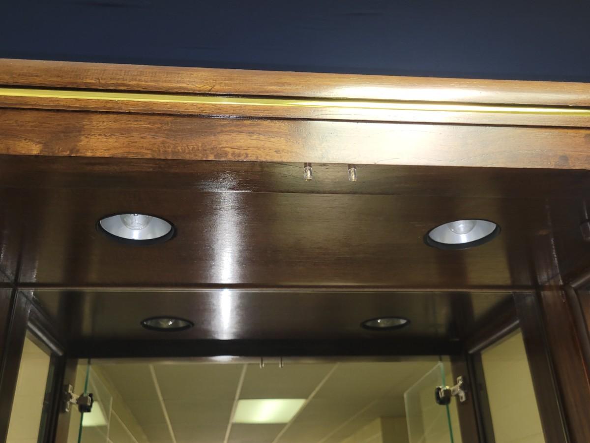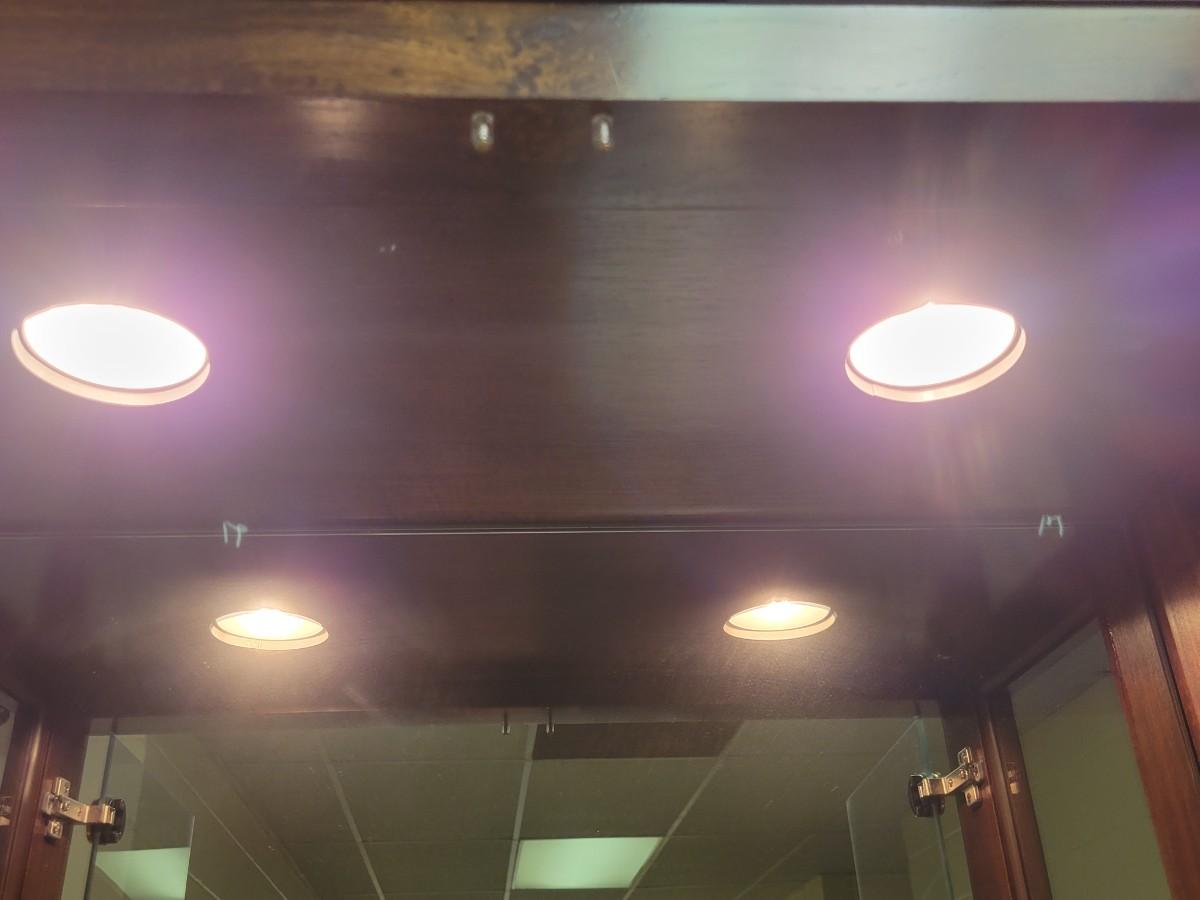 Has lights in top of case. Was used to display the porcelain dolls. This display case is solidly built. The shelves are adjustable. Lights do work - as shown in the picks. They operate on an adjustable dimming switch at the top of the inside of the cabinet. This is a VERY nice display case. Solid wood construction. Glass doors on front, glass inserts on sides, and mirrored back. This will come with an extra glass shelf (not shown).
