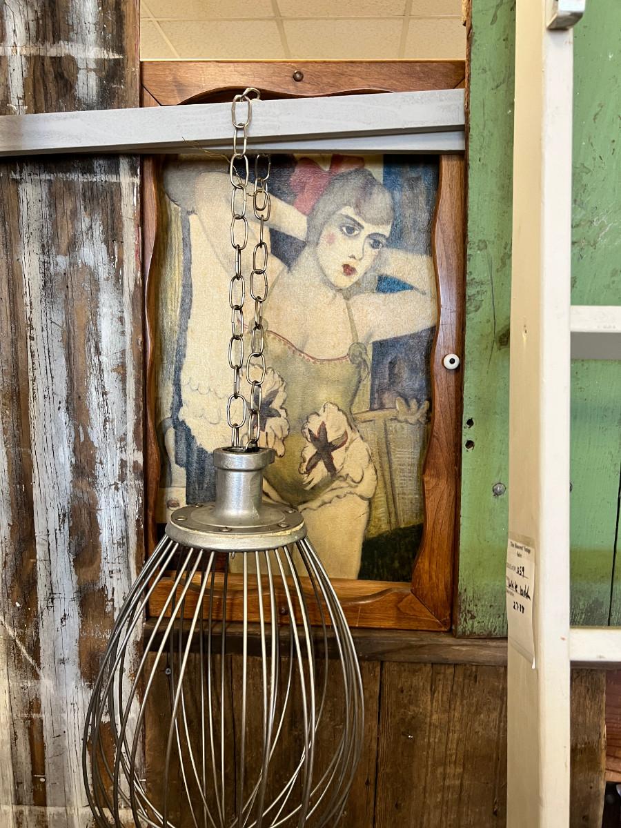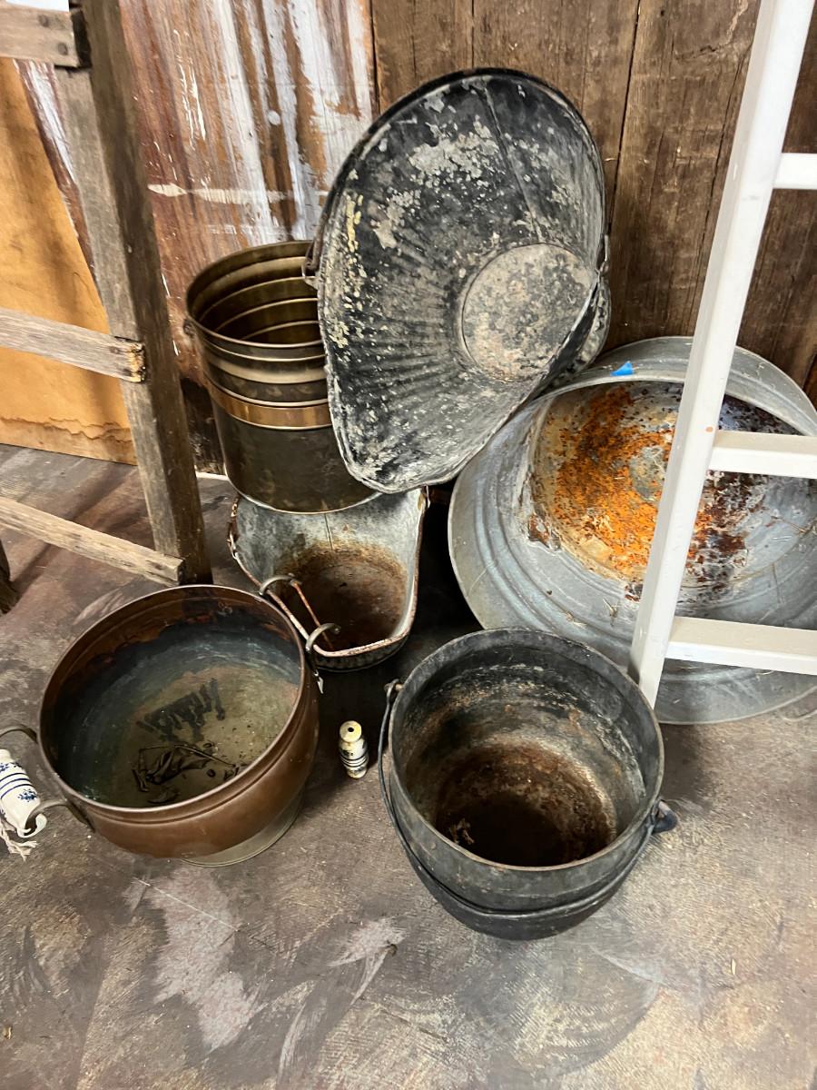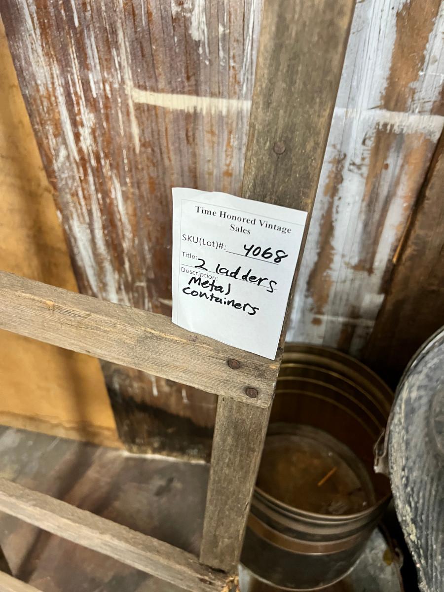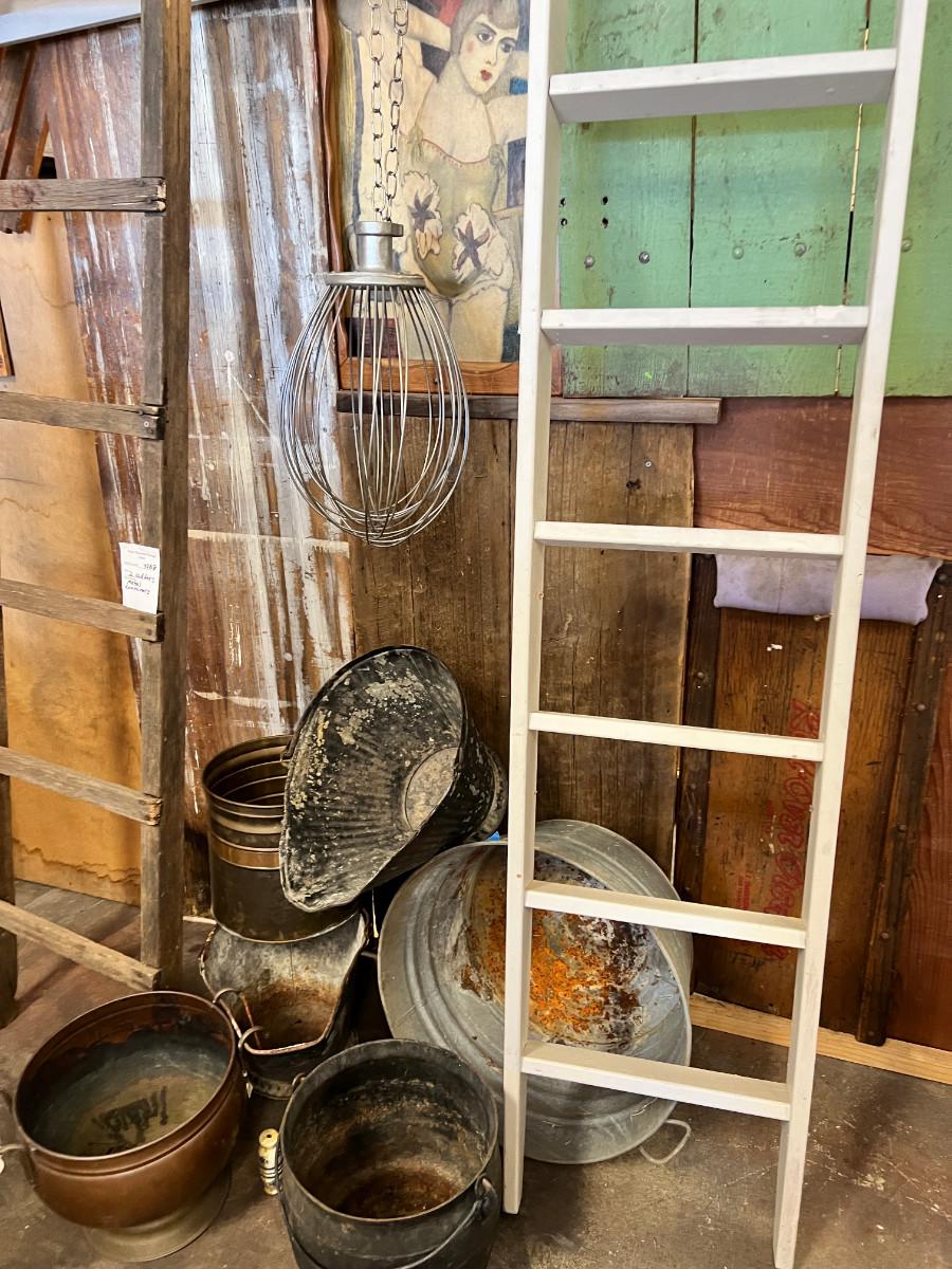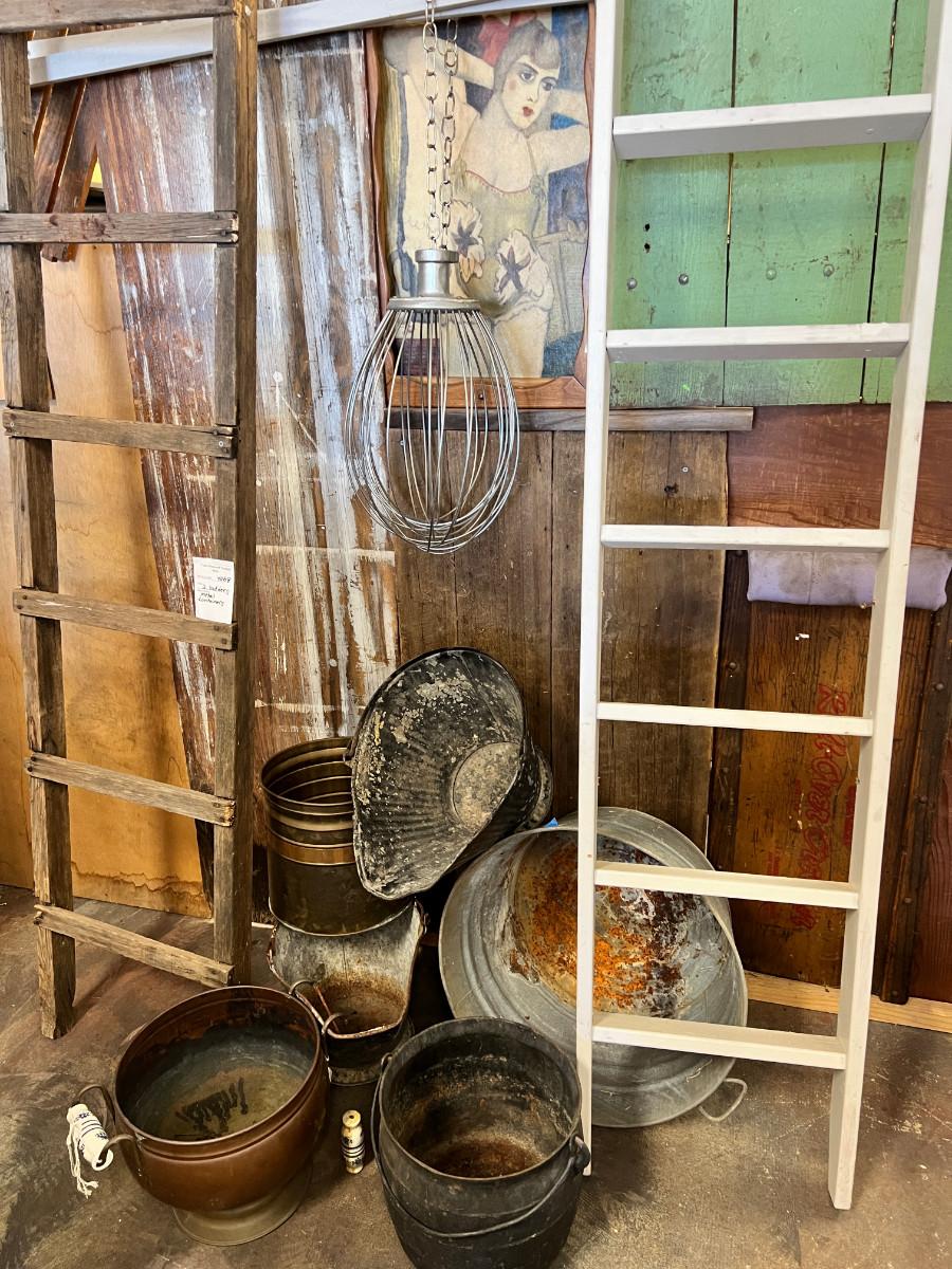 2 ladders and a variety of metal hobs, cans, tub, pail and an industrial mixer blade. You also get the bathing beauty that is in the background. This was all store decor that came out of the display I built out of my collection of old gates and barn wood. So the wood in the picture is not longer available, only the ladders, metal pieces and 1 painting.