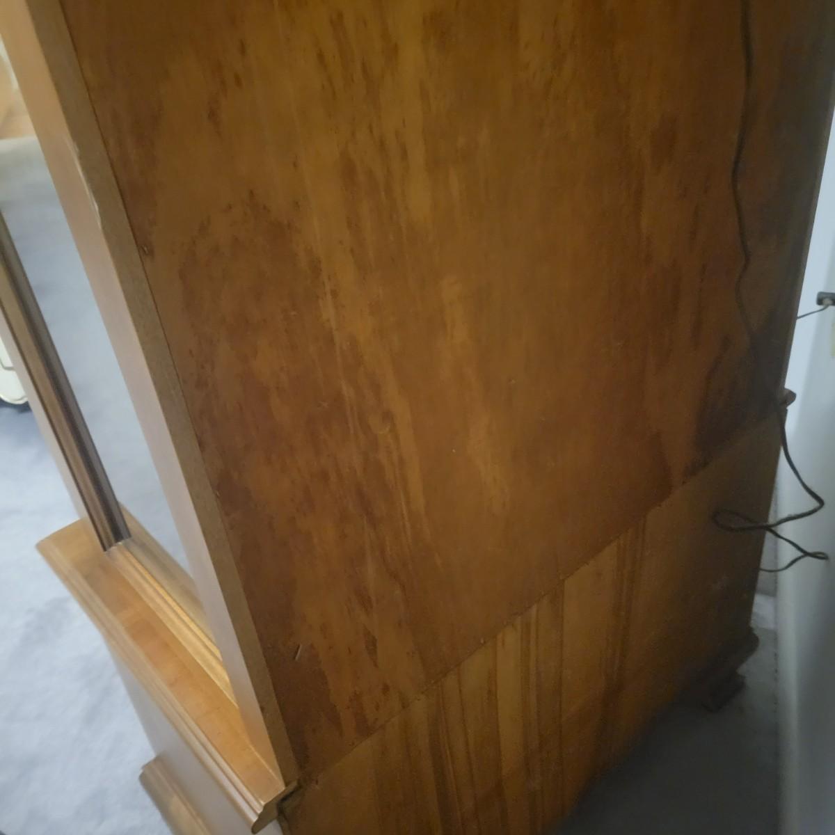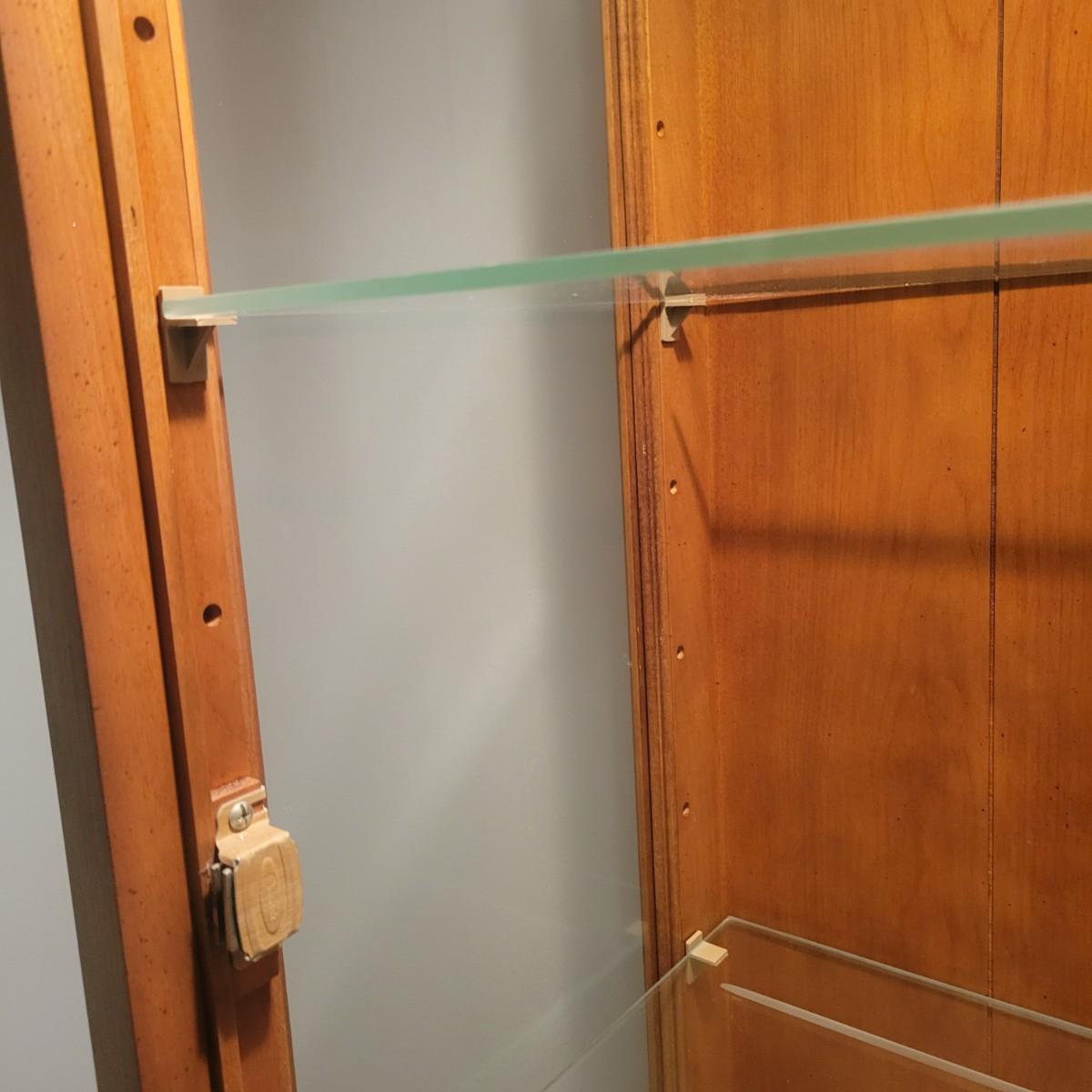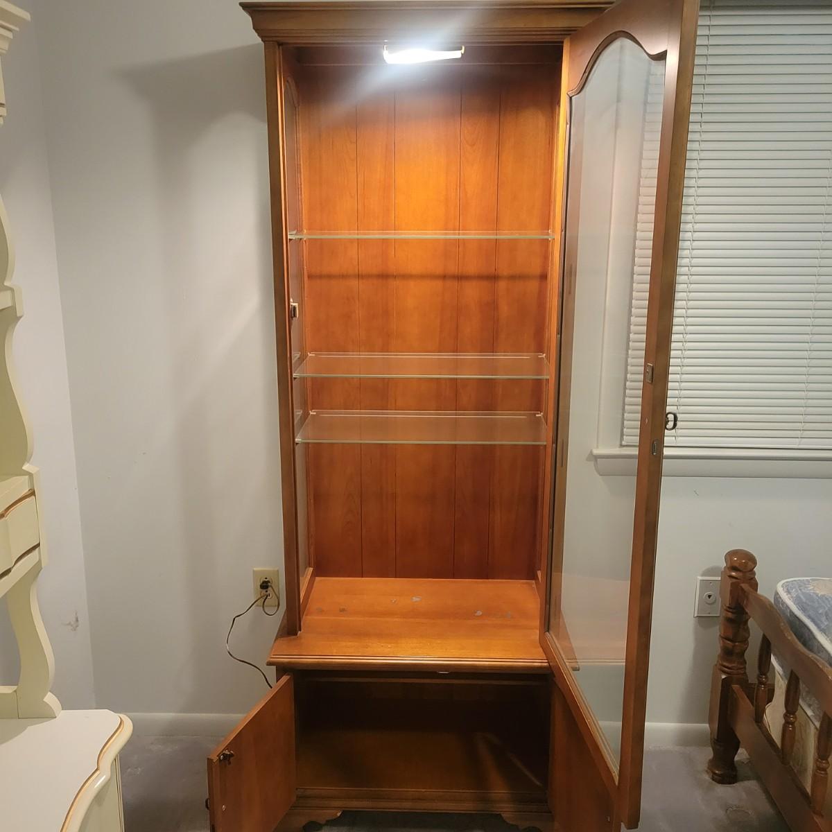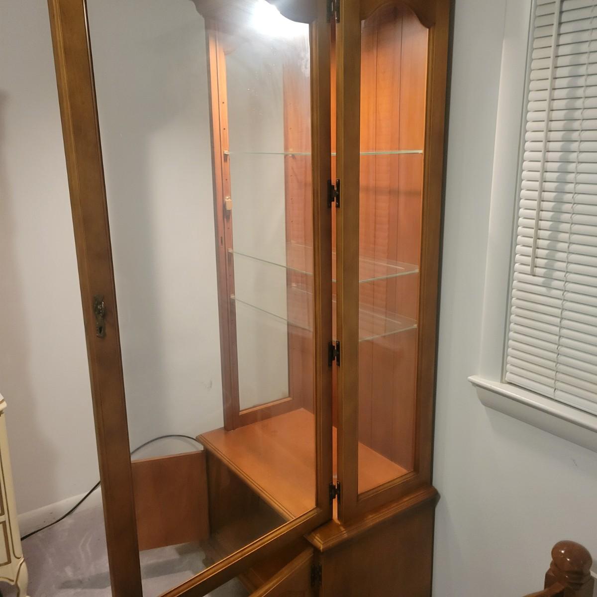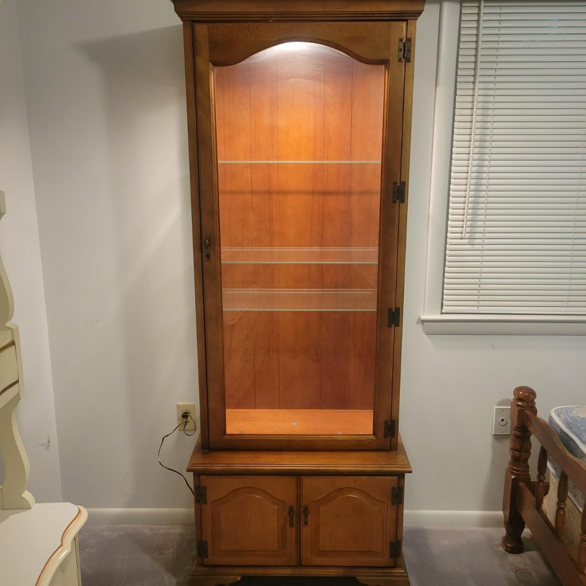 A wooden display hutch in good condition with some minor scratches. Hutch features a glass door and glass sides, with three adjustable glass shelves. There is also a lower cabinet and metal hardware. Hutch measures approximately 28.5" x 16" x 74" Local pickup only