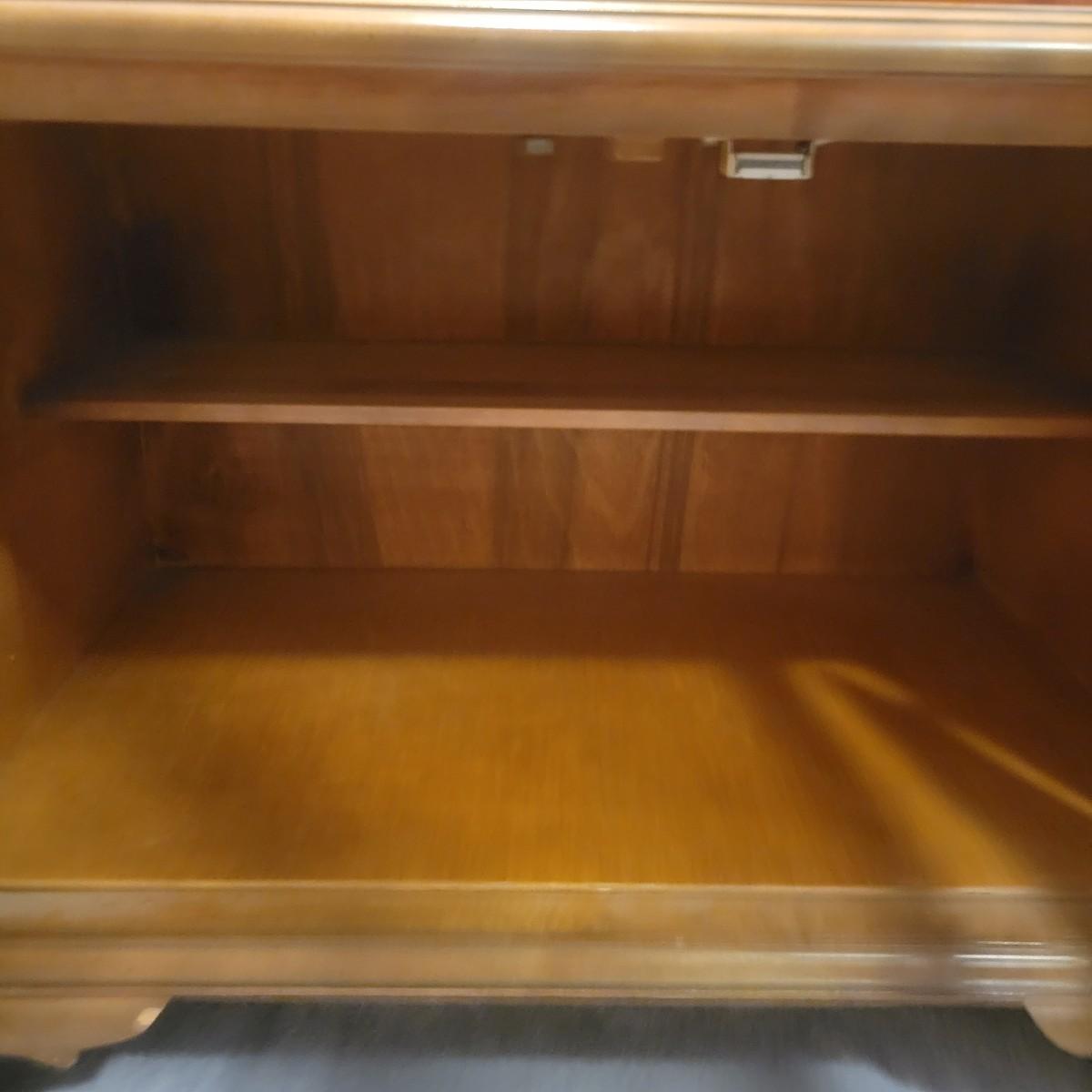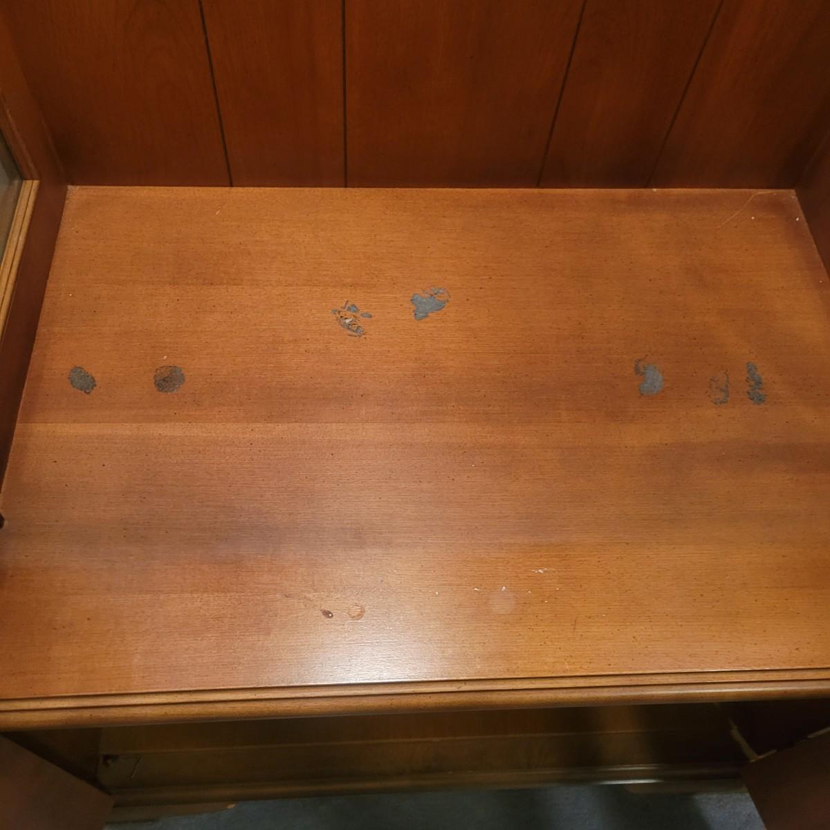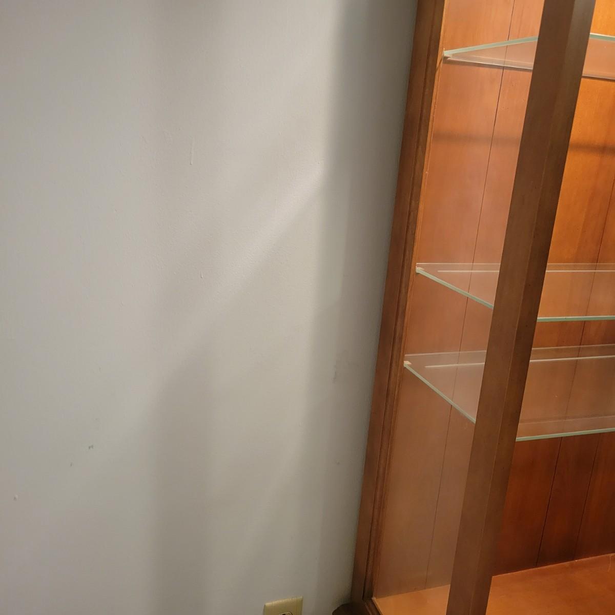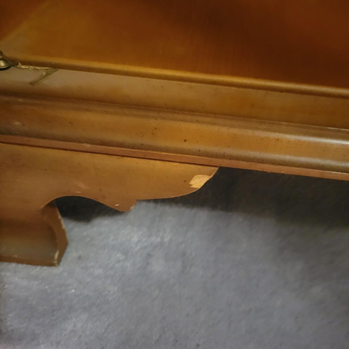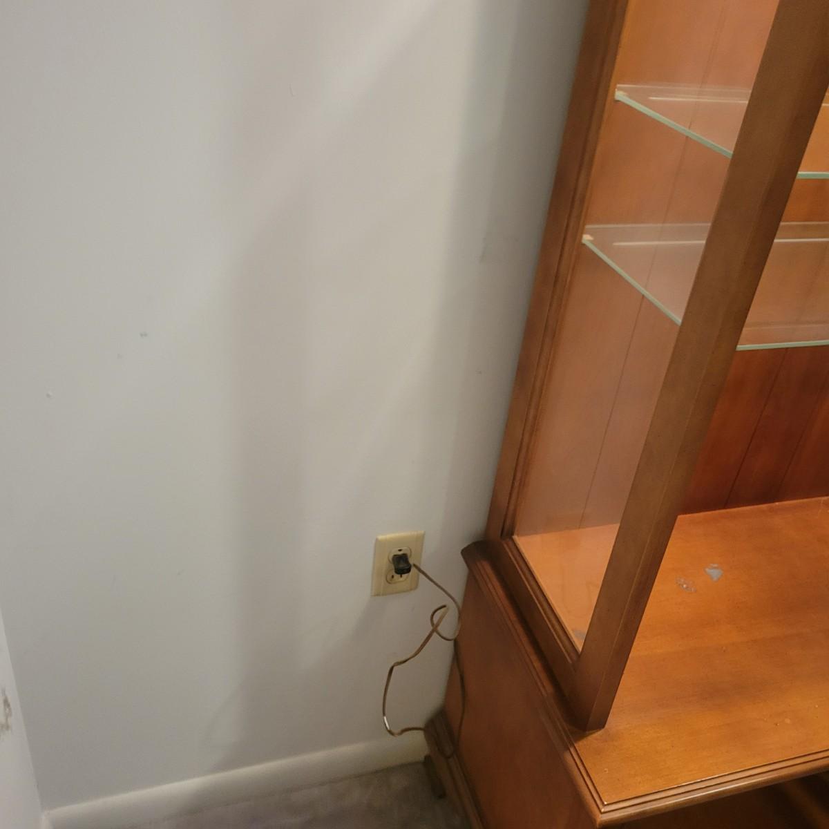 A wooden display hutch in good condition with some minor scratches. Hutch features a glass door and glass sides, with three adjustable glass shelves. There is also a lower cabinet and metal hardware. Hutch measures approximately 28.5" x 16" x 74" Local pickup only