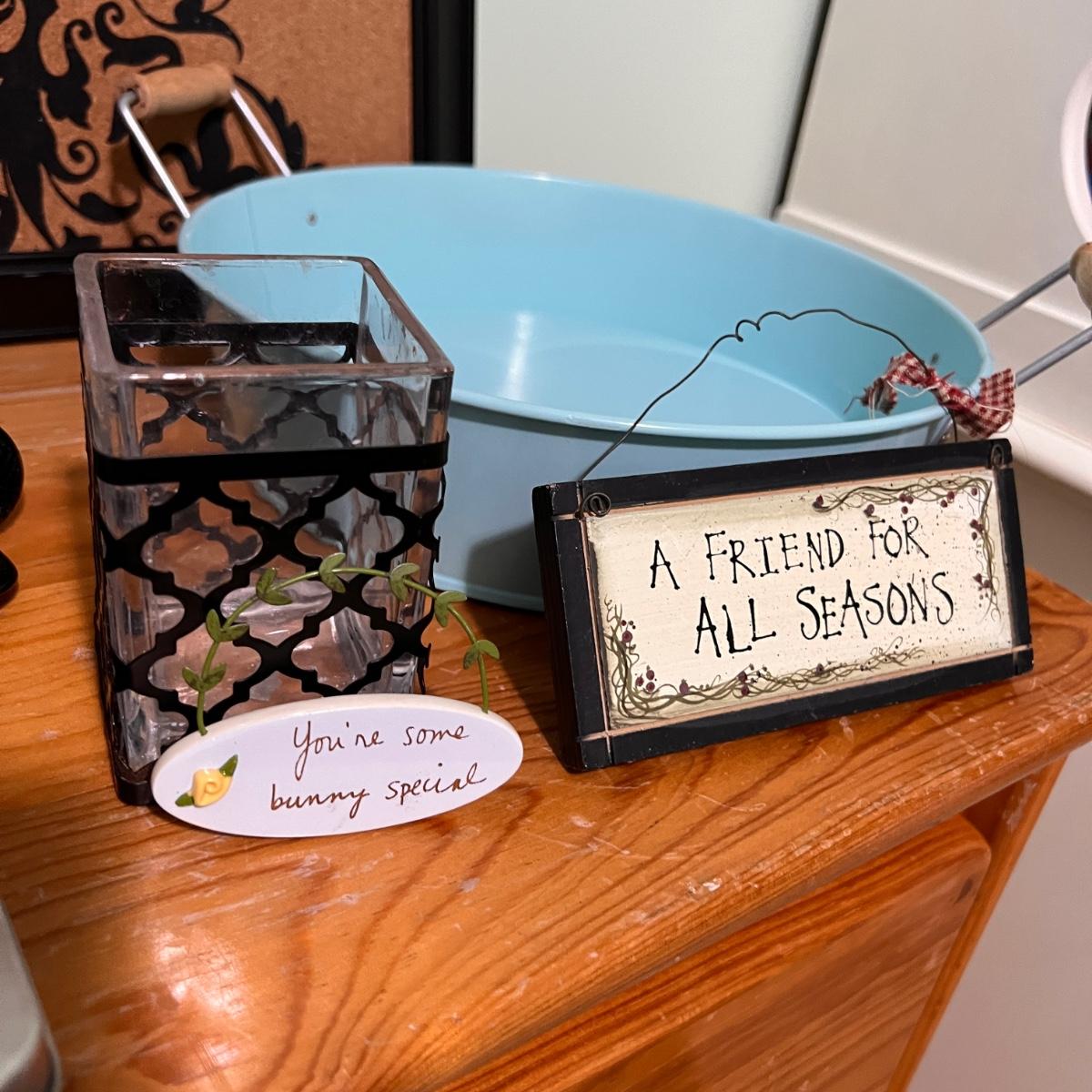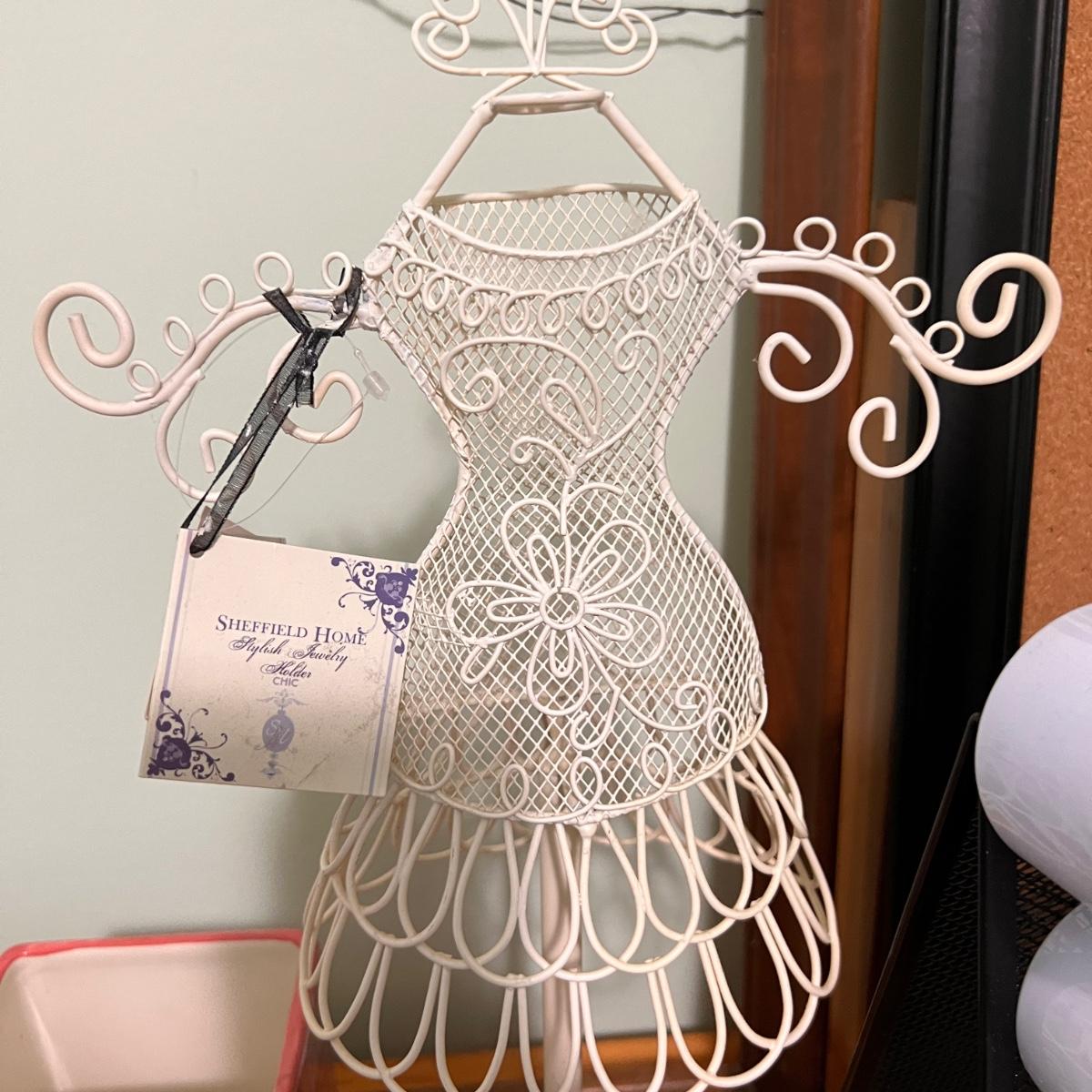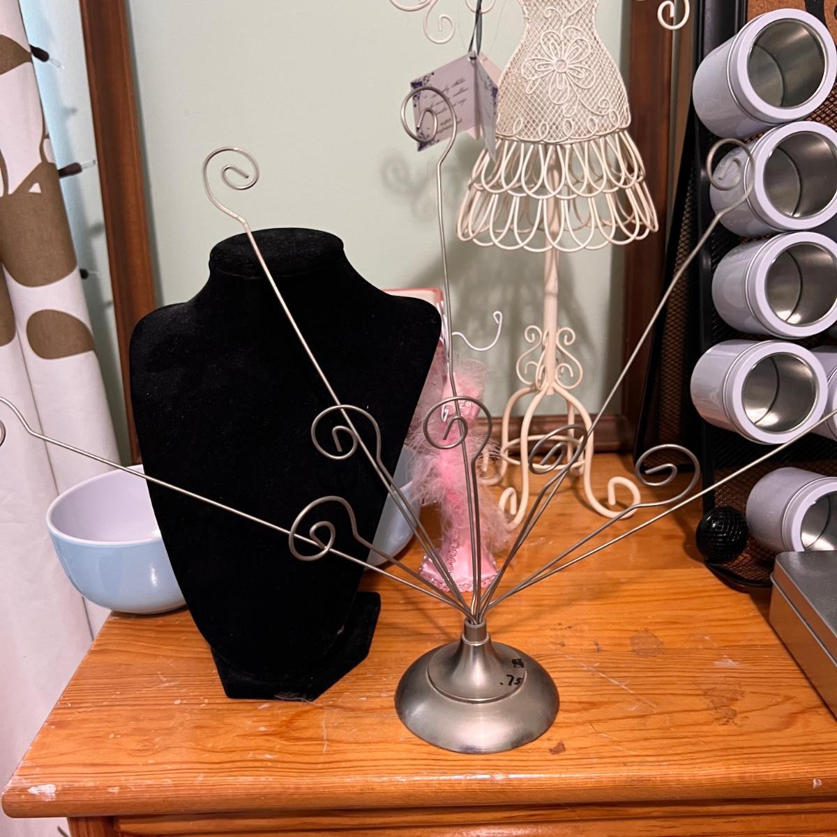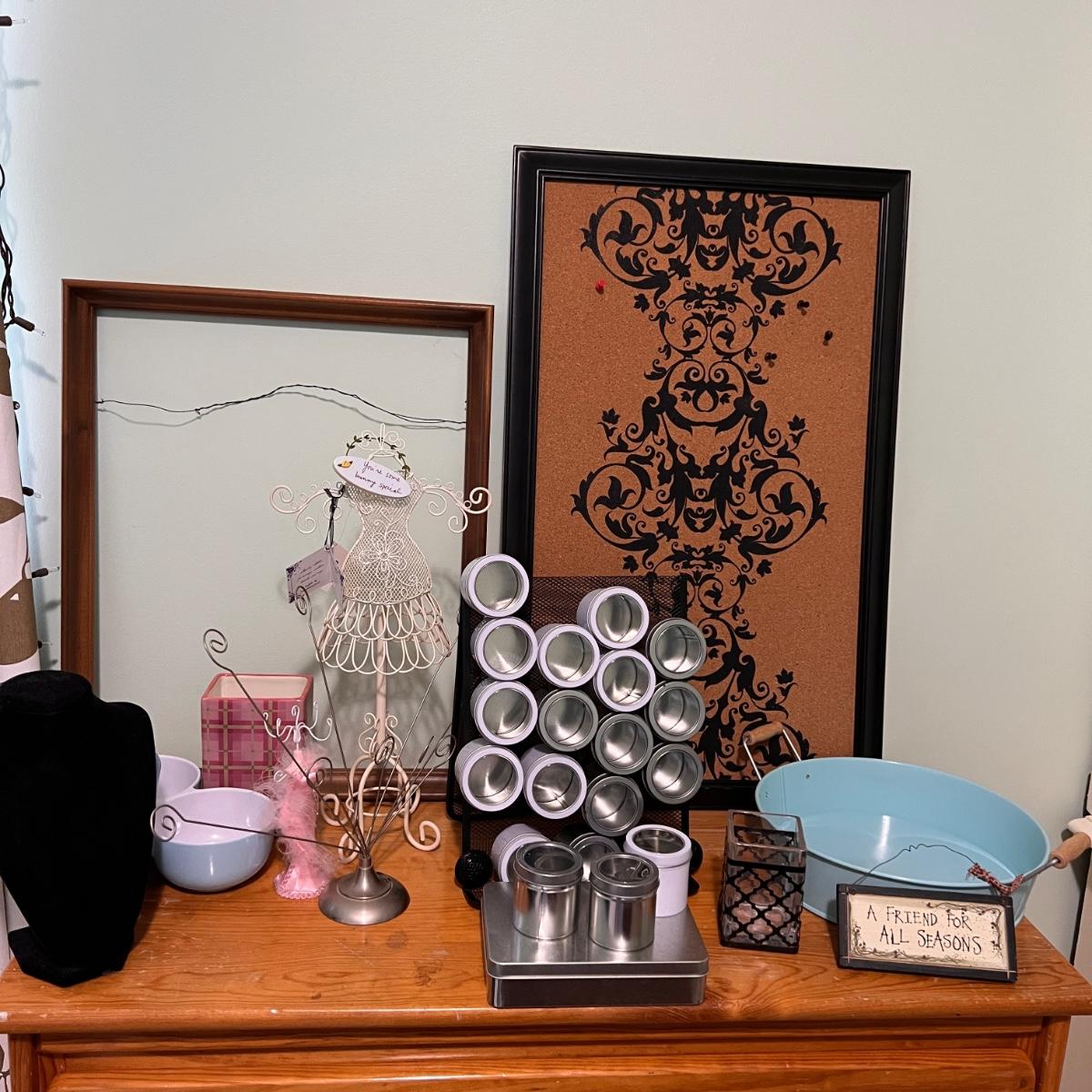 Wooden frame, decorative cork board, 3 dish plastic bowl, tin tray, clear top magnetic tins with magnetic board, jewelry display, 2 cute small hanging signs, new with tags dress form jewelry dispaly, pottery jar vase