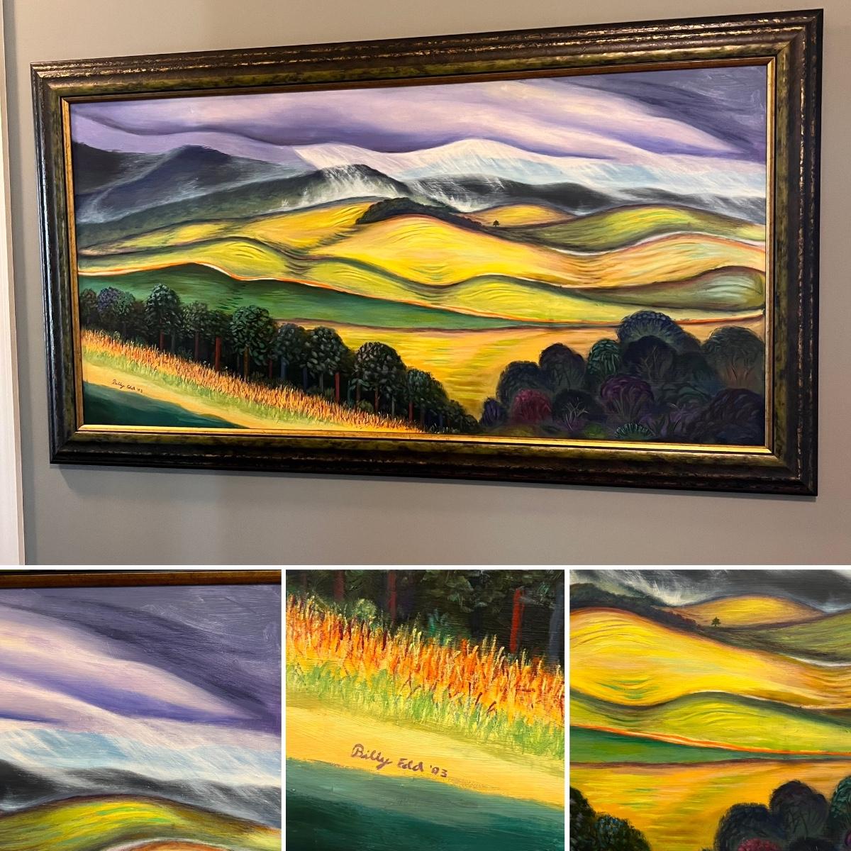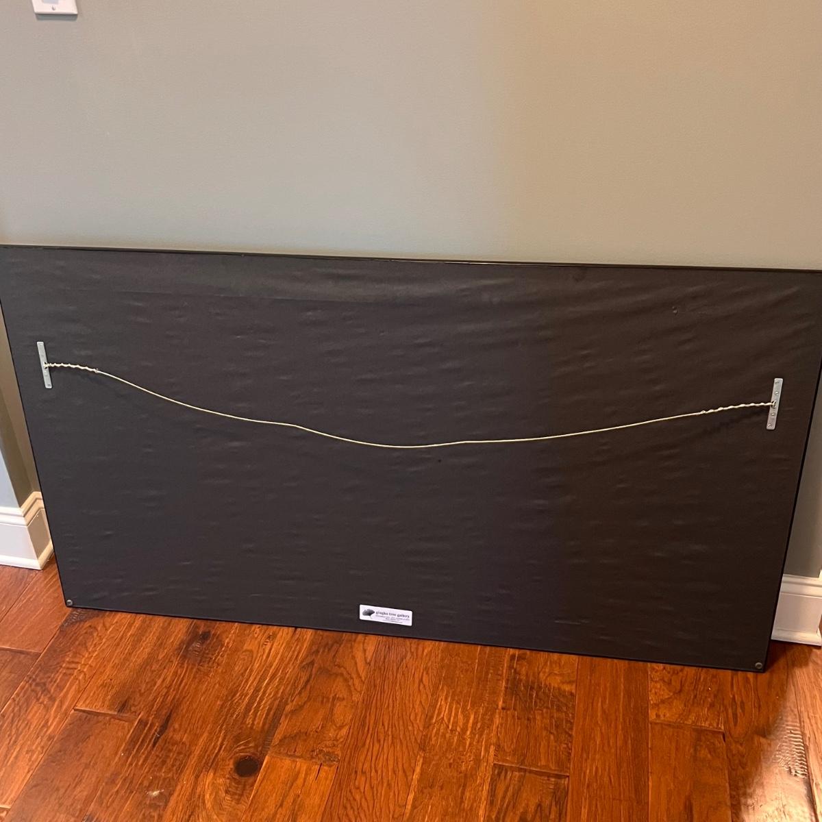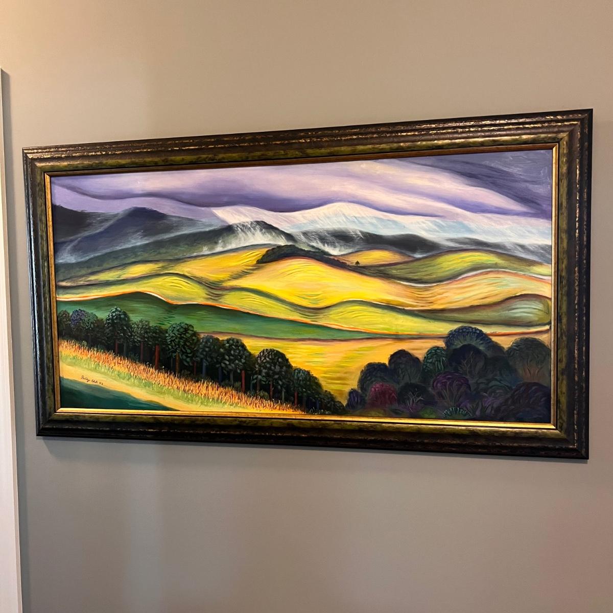 This stunning large original painting is signed by the artist. Painting is mounted (not under glass) in a green and brown composite frame that measures 54” x 1” x 30”H. The medium is possibly acrylic but according to google this artist also worked with pastels and oil.
