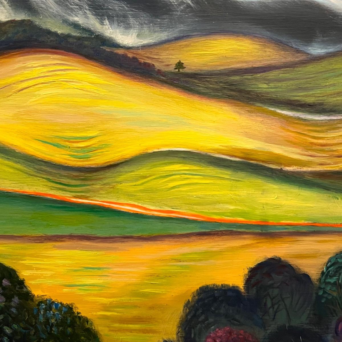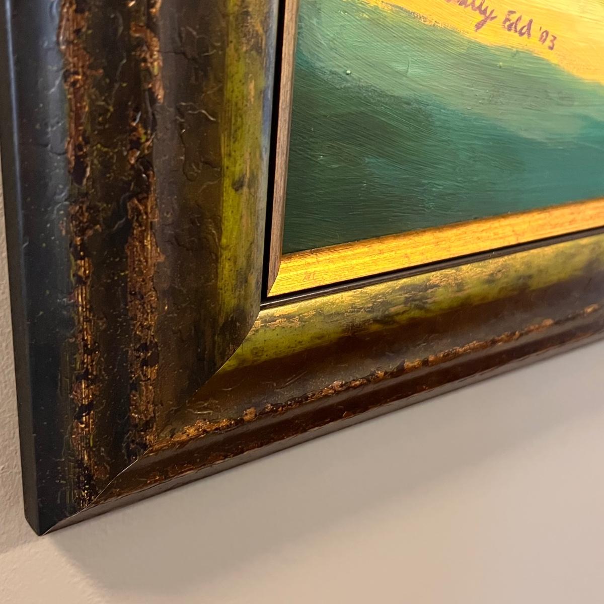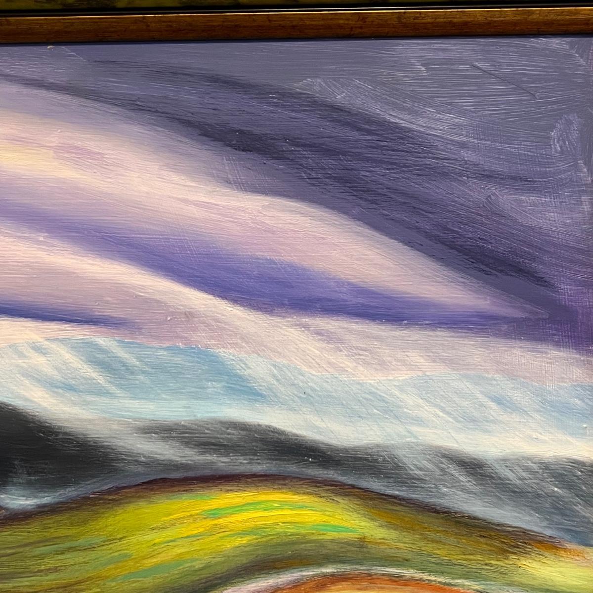 This stunning large original painting is signed by the artist. Painting is mounted (not under glass) in a green and brown composite frame that measures 54” x 1” x 30”H. The medium is possibly acrylic but according to google this artist also worked with pastels and oil.